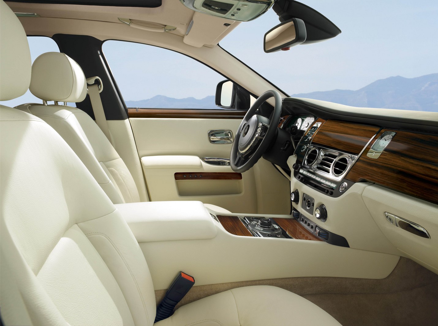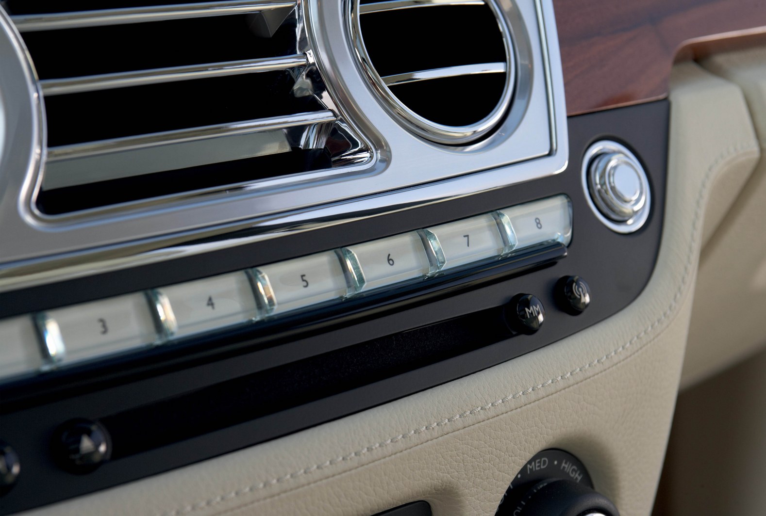Ghost is more driver-focused than any Rolls-Royce car before it. The driver sits in a slightly elevated position behind the wheel, described as the authority position. This makes the view of the road much clearer. The fascia has been kept deliberately clear; it is spacious in design and has an intuitive layout. The controls are neatly sculpted, with the more important functions emphasised by accents of chrome. The soft light of the instrument panel glows through the familiar black-rimmed steering wheel, which in turn employs a number of violin keys as well as an ergonomic roller-ball control.