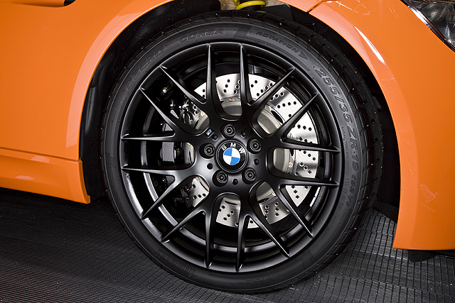 Even when you see it from a distance, you are instantly electrified. As a BMW M enthusiast, every step you take towards the orange painted concept vehicle of the BMW M3 GTS with its numerous matt black applications raises your adrenaline level a little more. Exclusive 19-inch wheels with ample 225/35 tyres at the front and 285/30 at the rear catch your eye. All this is certainly nice looking and sensible, but what you glimpse through the spokes of the aluminium wheel rims is even more exciting: a generously sized fixed caliper brake system with six pistons at the front and four at the rear.