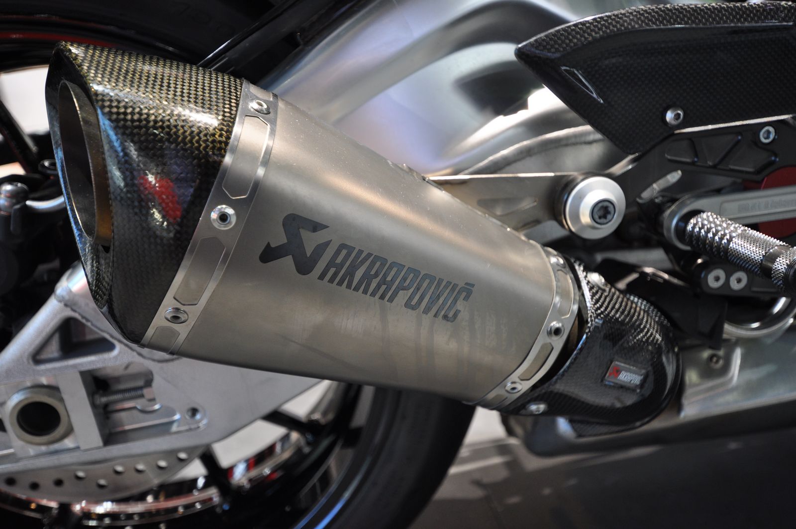 The carbon fiber body paneling encompasses both the left and right side secondary fairings, the front wheel fender, the rear wheel deflector, the foot peg braces and the rear seat cover, the partial tank cover, under-seat fairing, and the underbody fairing. An Akrapovic exhaust is also available for purchase, slicing 1.1 lbs off the weight of the standard bike (the Akrapovic exhaust weighs in at approx 2.4 lb). BMW has not released an official weight figure for the fully upgraded bike, but we suspect a weight savings in the realm of 3 to 5 lb in addition to the 1.1 lb savings from the exhaust for a total of 4 to 6 lb weight reduction. This would bring the bike’s total weight to 201 kg (444 lb) to 202 kg (446 lb) wet, if our projections are accurate.