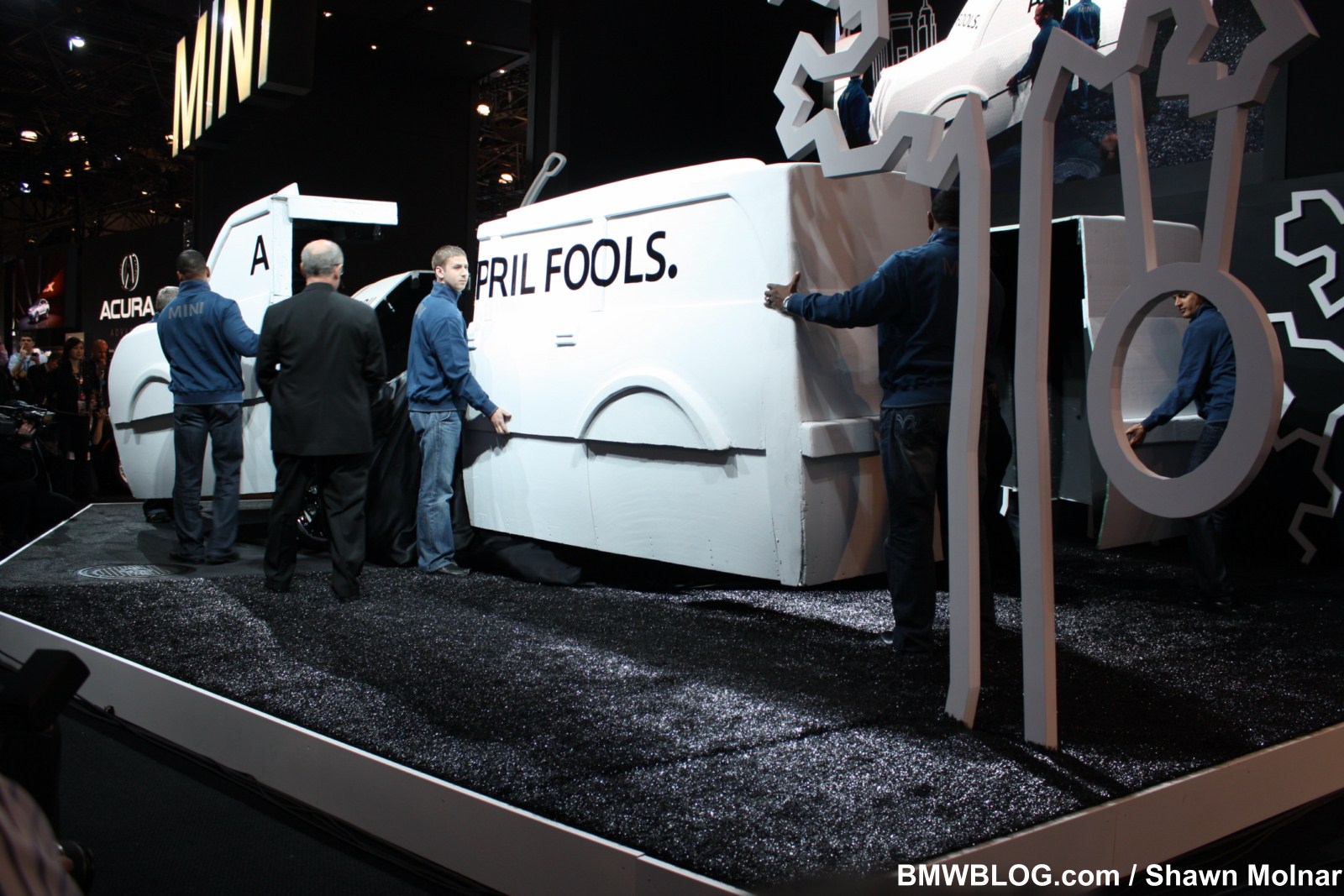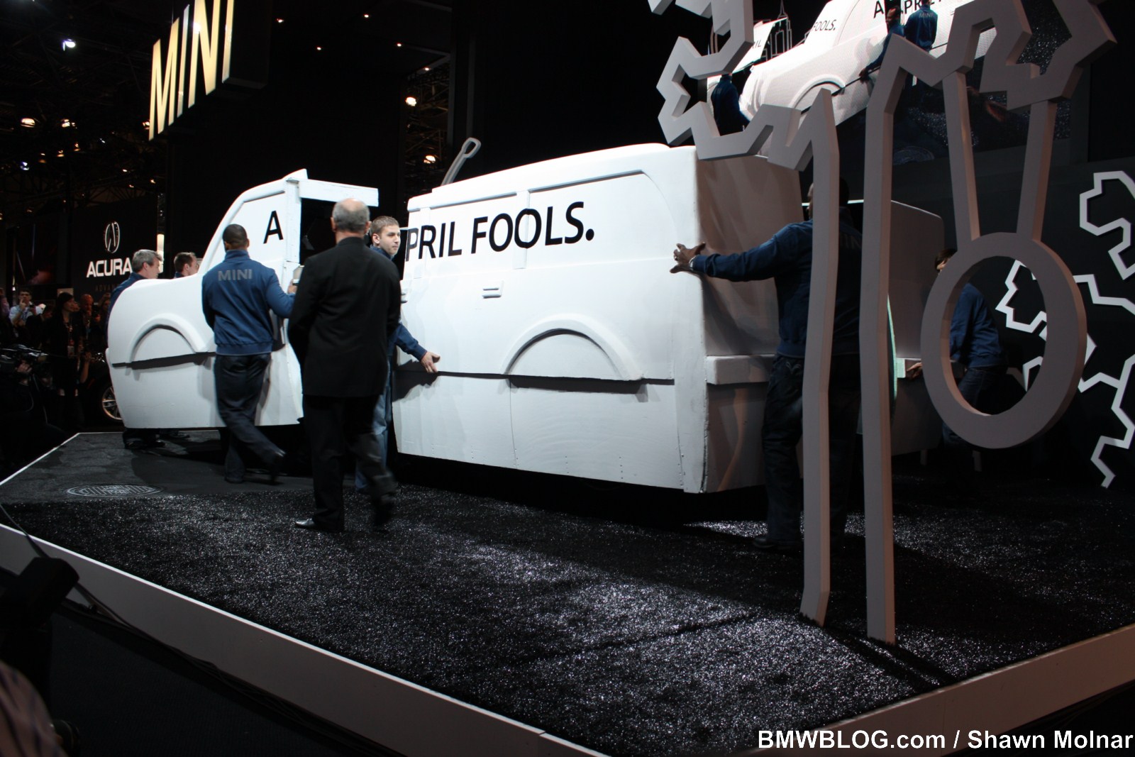 In an apt April Fools joke, Mini unveiled the Countryman from under a traditional linen cover, but a surprise lurked beneath. Wide eyed journalists had looked inquisitively upon the silhouette of the vehicle beneath – but it was a monstrous silhouette, probably closer to the Escalade in size. Pictures can be deceiving – but was the Countryman really that huge? The linen was pulled, and the joke revealed – a giant wooden shell encapsulating the new Mini. Several young men descended on the vehicle to remove the wooden enclosure and finally the Countryman was sitting before us. Take a look at all the action in our gallery below.