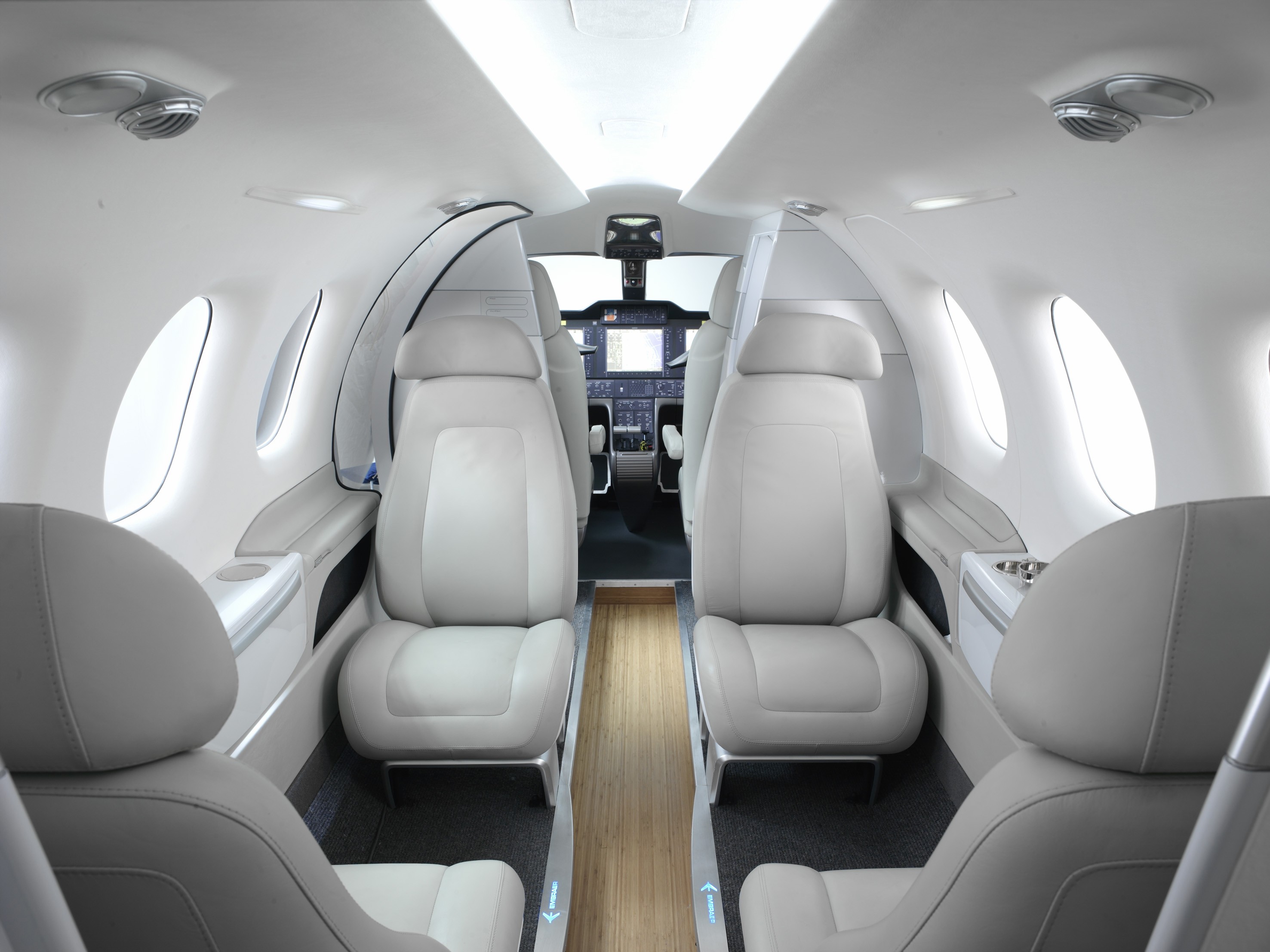 The design of the Phenom jets stands out through a multitude of intelligent solutions and details. The entrance to the cabin is tailored to the natural physiognomy of the human body and broadens out at shoulder height, giving the interior along the aisle its very own, elegant, characteristic form for more passenger freedom of movement and comfort. Integrated armrests, which have been a feature of the automobile sector for many years now, have also been introduced. An innovative flooring design was implemented, consisting of new, durable materials, offering superior inherent value. Simultaneously, it provides an adequate, sustainable answer to the owner’s or operator’s demand for high quality design combined with low cost and maintenance.