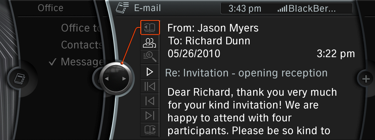 Like the functions previously introduced, e-mail access via Bluetooth also helps make the use of communication and entertainment options of modern smartphones in the vehicle convenient and safe. The operating system iDrive provides unique facilities for the simple, safe and intuitive control of all functions while causing minimum distraction from the road. For the first time, incoming and saved e-mails from the Bluetooth-integrated smartphone can now be retrieved and shown on the Control Display in just a few standardized operating stages. Relief of the driver is further enhanced with the optional voice output function. It can be activated at a single press of a button, the text of the e-mail is then read out loud.
