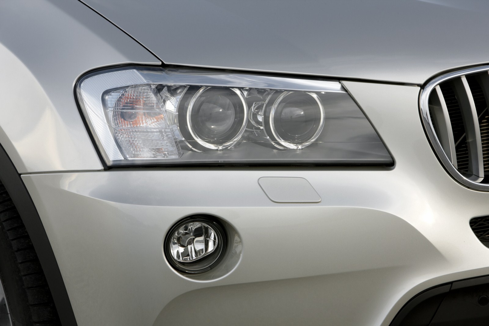 The design of the new BMW X3 conveys elegance, agility and ruggedness. Up front, the forward-slanting BMW kidney grille and large headlight assembly combine with a powerful-looking front apron and hood boasting six contour lines sweeping down to meet at the kidney grill, giving the X3 a bold presence. The twin round headlights combined with the round fog lamps form the triangular light pattern that is characteristic of BMW SAV design. The upper edge of the headlight assembly sports an accentuating chrome trim, creating the focused design typical of BMW vehicles. BMW’s signature “Corona Rings” are again illuminated to function as the daytime running lights. When equipped with the optional Xenon headlights, the Corona Rings and daytime running lights are illuminated by bright white LEDs.