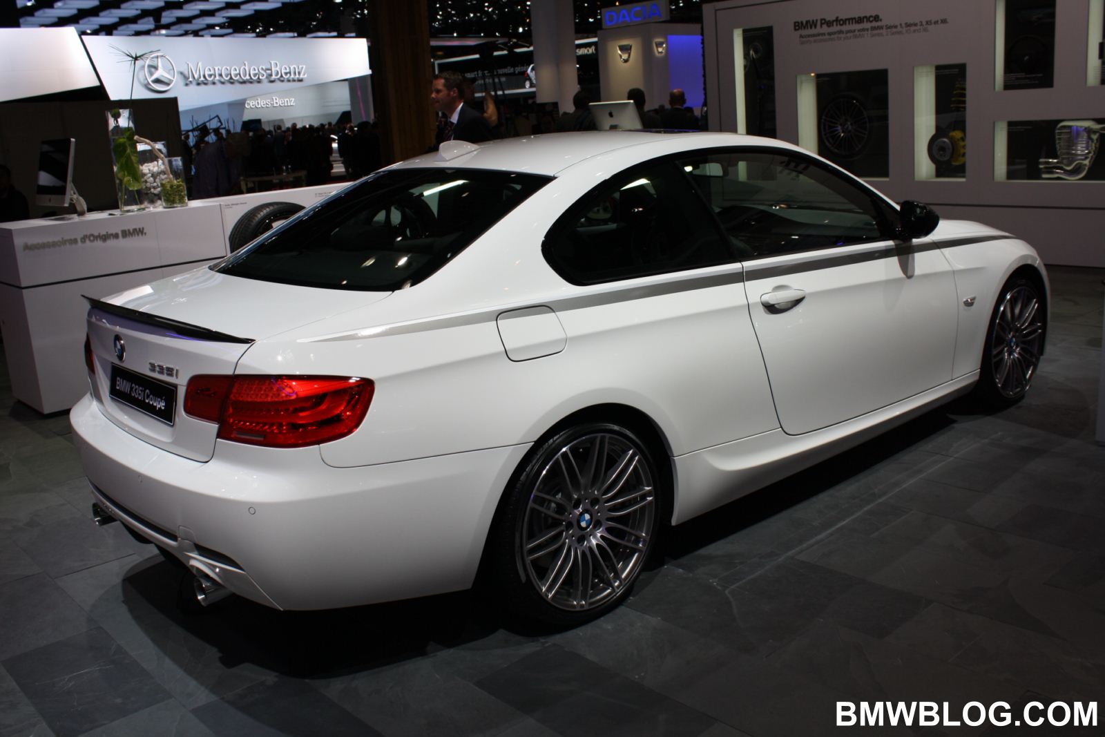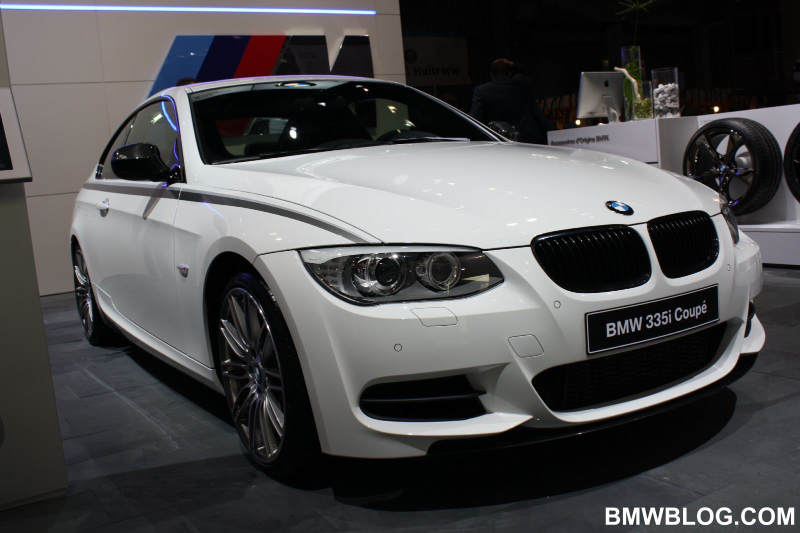 In Paris, BMW also showcased the usual 3 Series models with Performance Parts. One of them displayed on the floor was the BMW 335i Coupe. The car features virtually every part from the Performance catalog. The Alpine White car sports the aerodynamic package, black-painted kidney grille and the decorative stripes on the side of the vehicle.