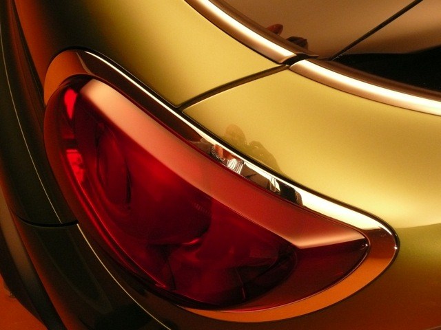 The flat roofline runs horizontally from front to rear, where it flows into a wide, transparent-looking C-pillar. The windows appear to wrap around the car like a band of glass, with the “helmet roof” – in a strikingly contrasting color – suspended on top.