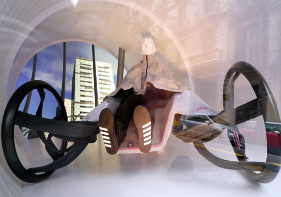 This first concept, Comme des Voitures, is sort of a futuristic roller blading outfit; the boots have an array of ball-bearings in the soles, while the face shield is actually a semi-transparent wraparound display that provides real time directions, traffic information and any number of other interesting distractions that seem likely to cause an accident.