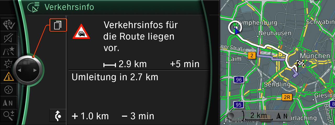 Recommendations on alternative routes include precise data on the difference in distance and time compared to the current route. This knowledge provides the driver with the option of accepting the traffic jam on the main route, if the proposed alternative routes offer no time savings. Drivers also have the option of deciding to take a longer diversion in order to have a less stressful journey and perhaps even include a pleasant stop-off en route.