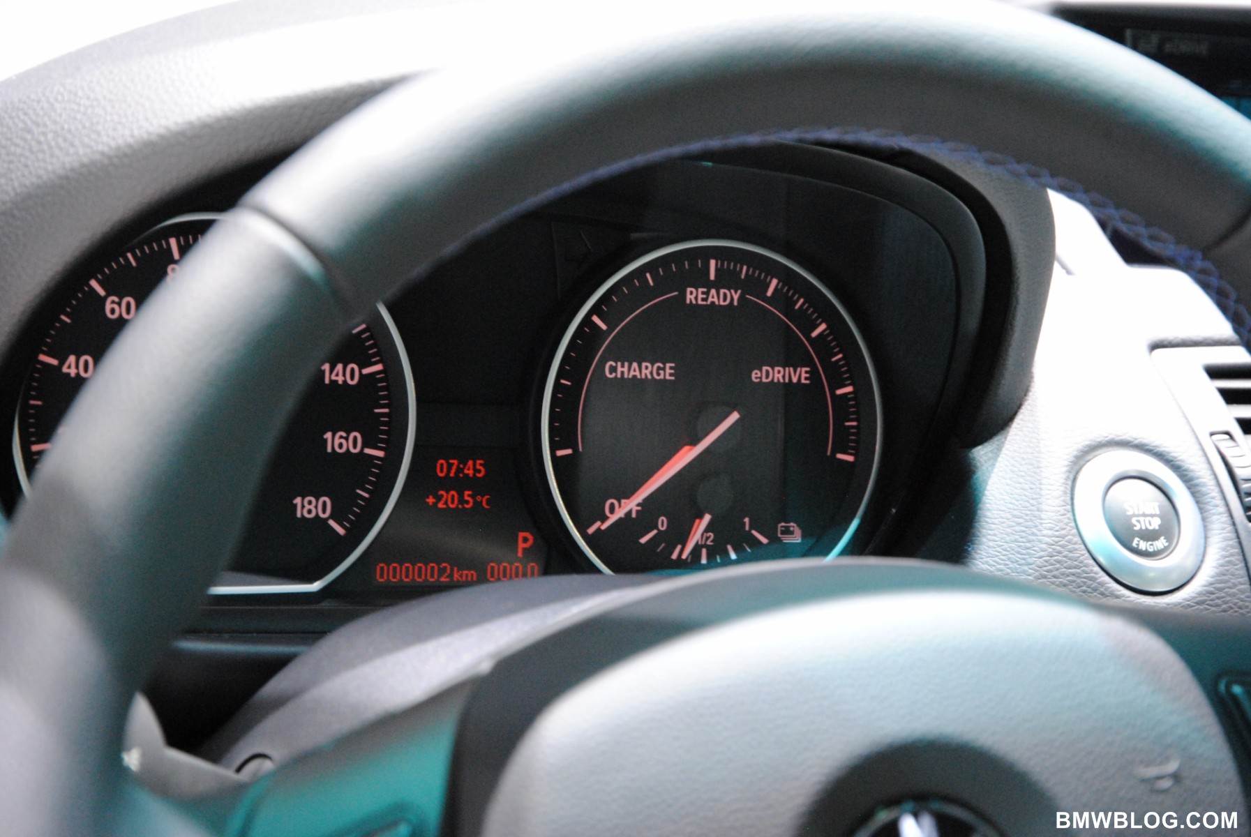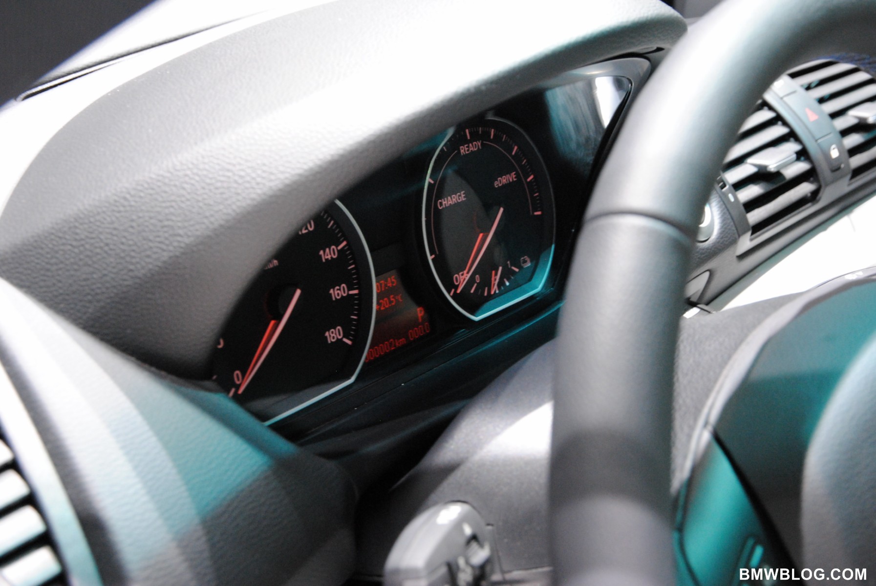 Inside, the cockpit of the ActiveE sports pearl-gray leather seats with contrasting blue seams; the door panels and dashboard get Alpine White trim. The control system and instrument cluster are designed for the car’s electric-drive system, and replace the conventional transmission shifter and gauge cluster.
