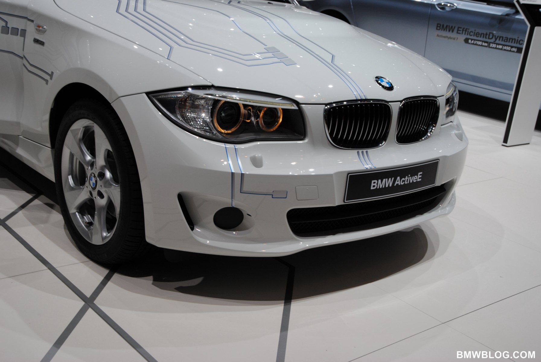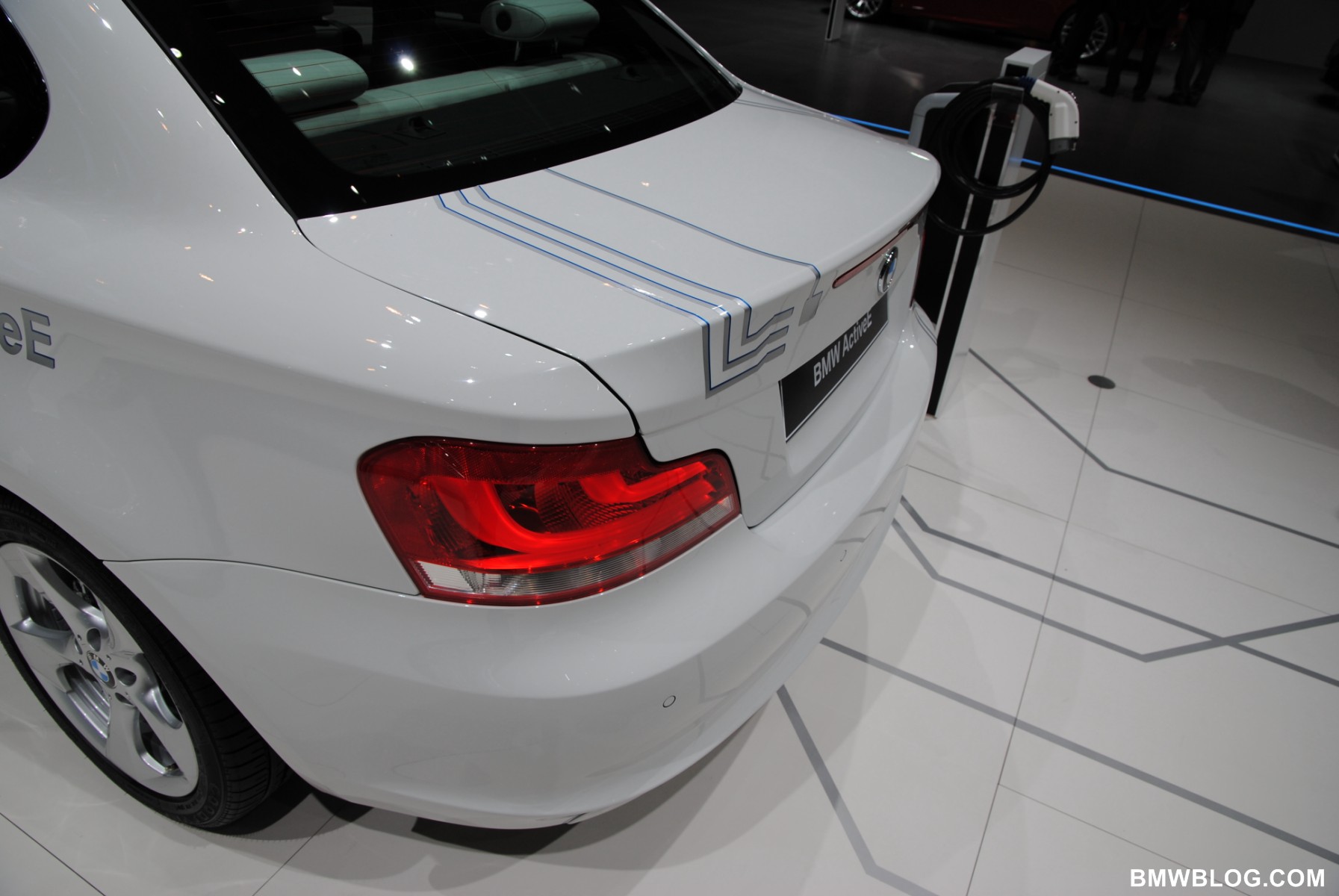Design wise, the BMW ActiveE resembles almost identically the regular 1 Series Coupe. The Alpine White body features silver “circuit-inspired” graphics on a blue background. A power dome in the hood accommodates the battery pack. Because there are no exhaust pipes, the rear diffuser is replaced by a closed rear apron. Low-rolling-resistance tires are wrapped around 16″ wheels.