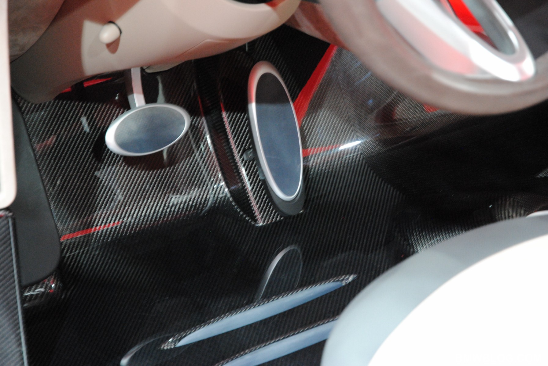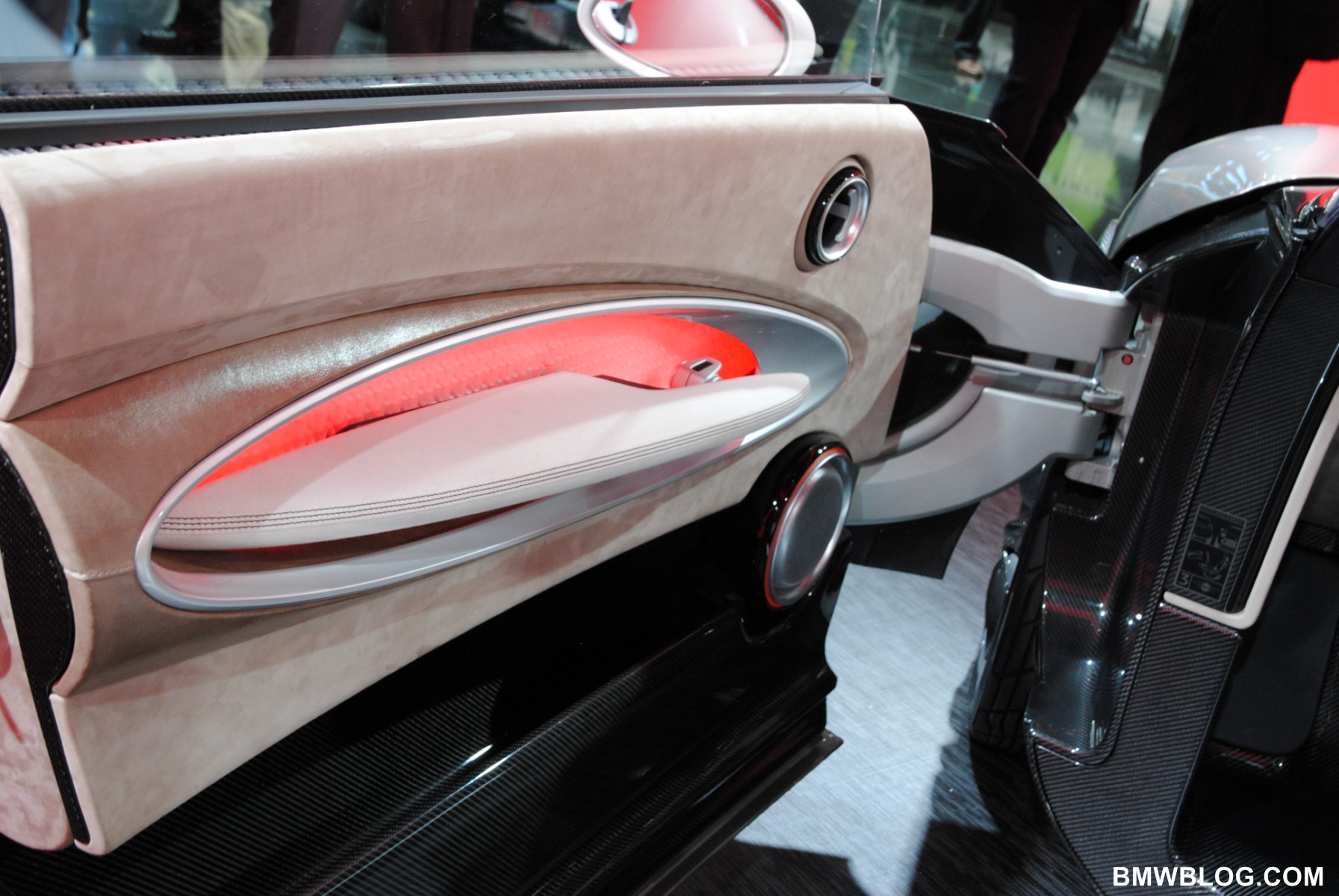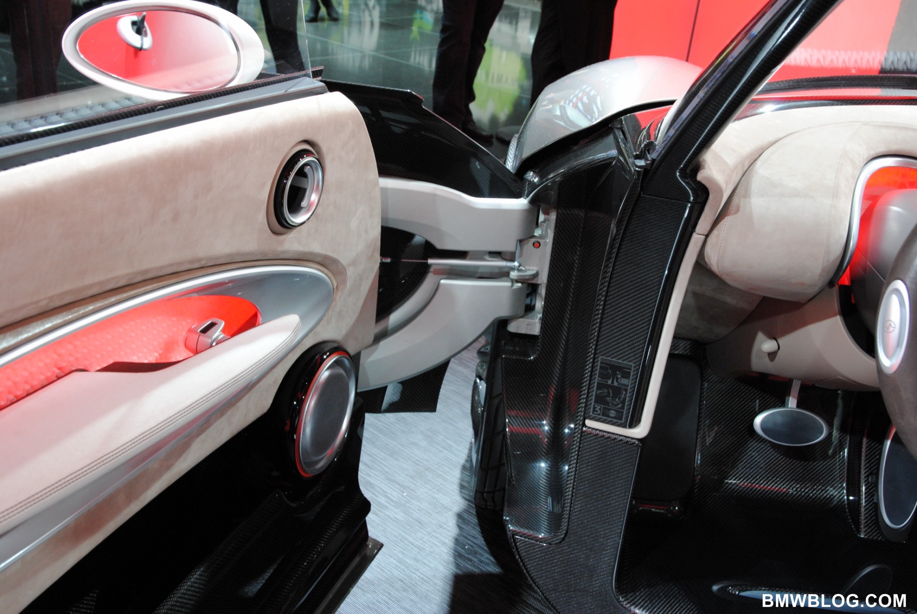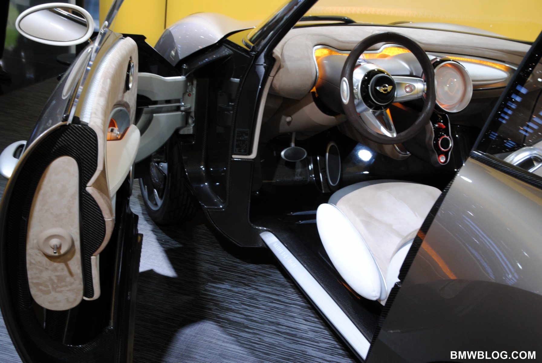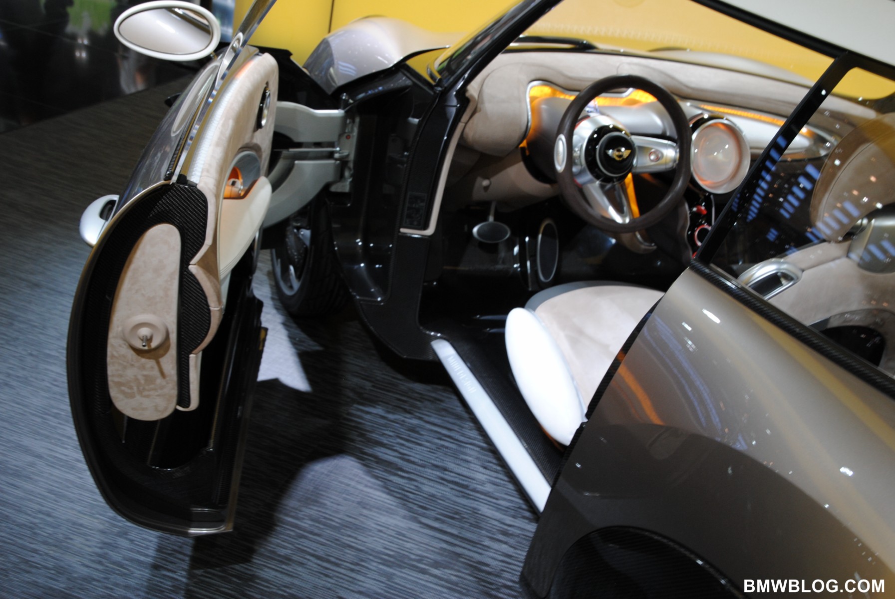 MINI Rocketman makes use of lightweight design principles and an interior geared to maximum driving fun and unbeatable variability. A carbon spaceframe construction, whose striking surface structure is visible at the front end of the car, around its doors and in the interior, forms the basis for a weight-minimizing construction. Wide-opening doors with double-hinge joints and integrated sills facilitate entry into the MINI Rocketman Concept.