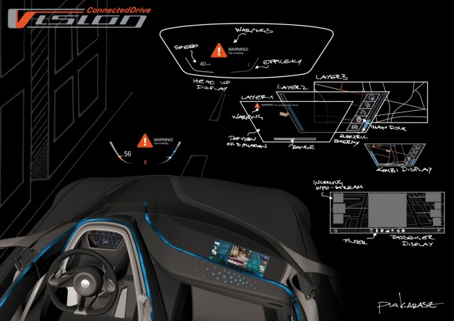 Just like the ConnectedDrive Concept, the cars have the ability to pinpoint your current location at all-time, identify your music and movie preferences, and furthermore, interact in a social way with other cars on the road. Koslowski also said that over the next ten years, cars will “crowd source” information from other drivers as they pass your vehicle, learning valuable information that are then displayed on your screen.