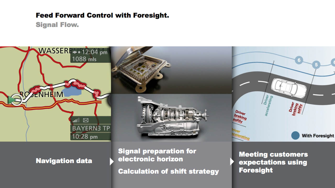 Based on the current ZF 8-speed automatic, the new transmission utilizes a wide range of technologies, GPS mapping, DSC, wireless data connectiion, front and rear-mounted cameras and radar sensors, which all together can help the gearbox adapt its shifting pattern and power delivery to accommodate the road conditions.