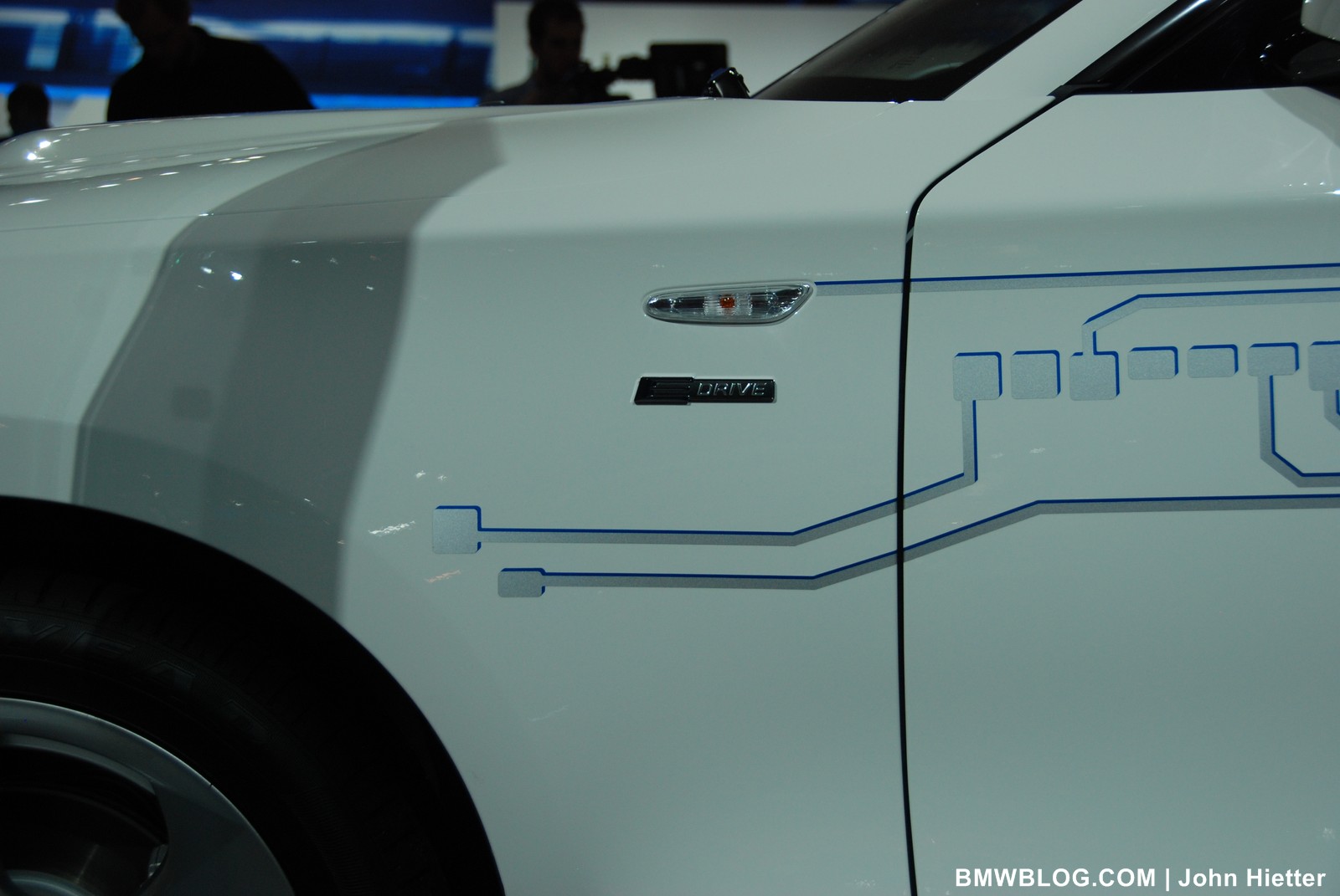 Design wise, the BMW ActiveE resembles almost identically the regular 1 Series Coupe. The Alpine White body features silver “circuit-inspired” graphics on a blue background. A power dome in the hood accommodates the battery pack. Because there are no exhaust pipes, the rear diffuser is replaced by a closed rear apron. Low-rolling-resistance tires are wrapped around 16″ wheels.