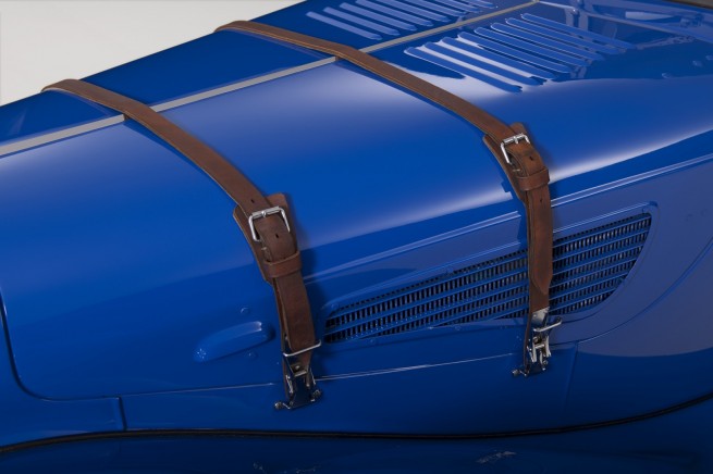 The first three prototypes had no doors, and neither did they come with a mount or recess at the rear for the spare wheel. Their windscreen was low and single-piece in design. By contrast, the later series-produced cars had screens consisting of two halves – angled in a V – which could be folded down individually and had a wiper each. In addition, the BMW 328 came as standard with patented central-locking Kronprinz disc wheels with 5.25×16 tyres. Behind them, hydraulic brakes with 280 mm diameter drums gave good stopping distances for the time. A particularly sporty touch was provided by the two leather belts strapped over the bonnet. Along with the classic “double-kidney” design of the radiator grille, these light-brown cowhide belts – held in place by a clip-lock – represented a prominent stylistic element of the BMW 328.