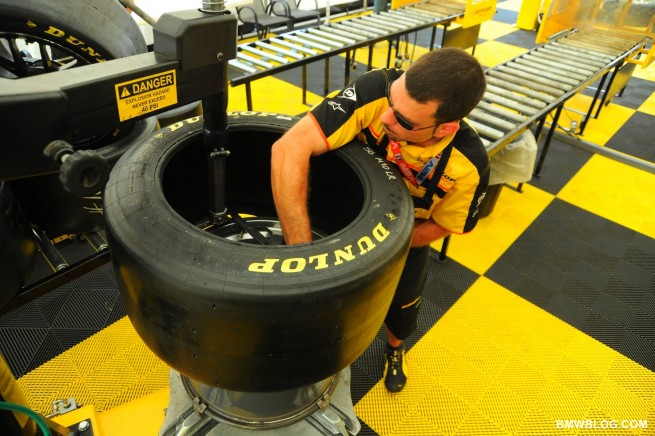 Dunlop engineers use a variety of factors to determine which rubber compounds will be used on any given track. Those factors include the composition of the track surface, asphalt temperatures and ambient temperatures. After tests are conducted, engineers measure the tire’s temperature, pressure and wear patterns. They also rely on reports from drivers and team engineers to fine-tune their selection.