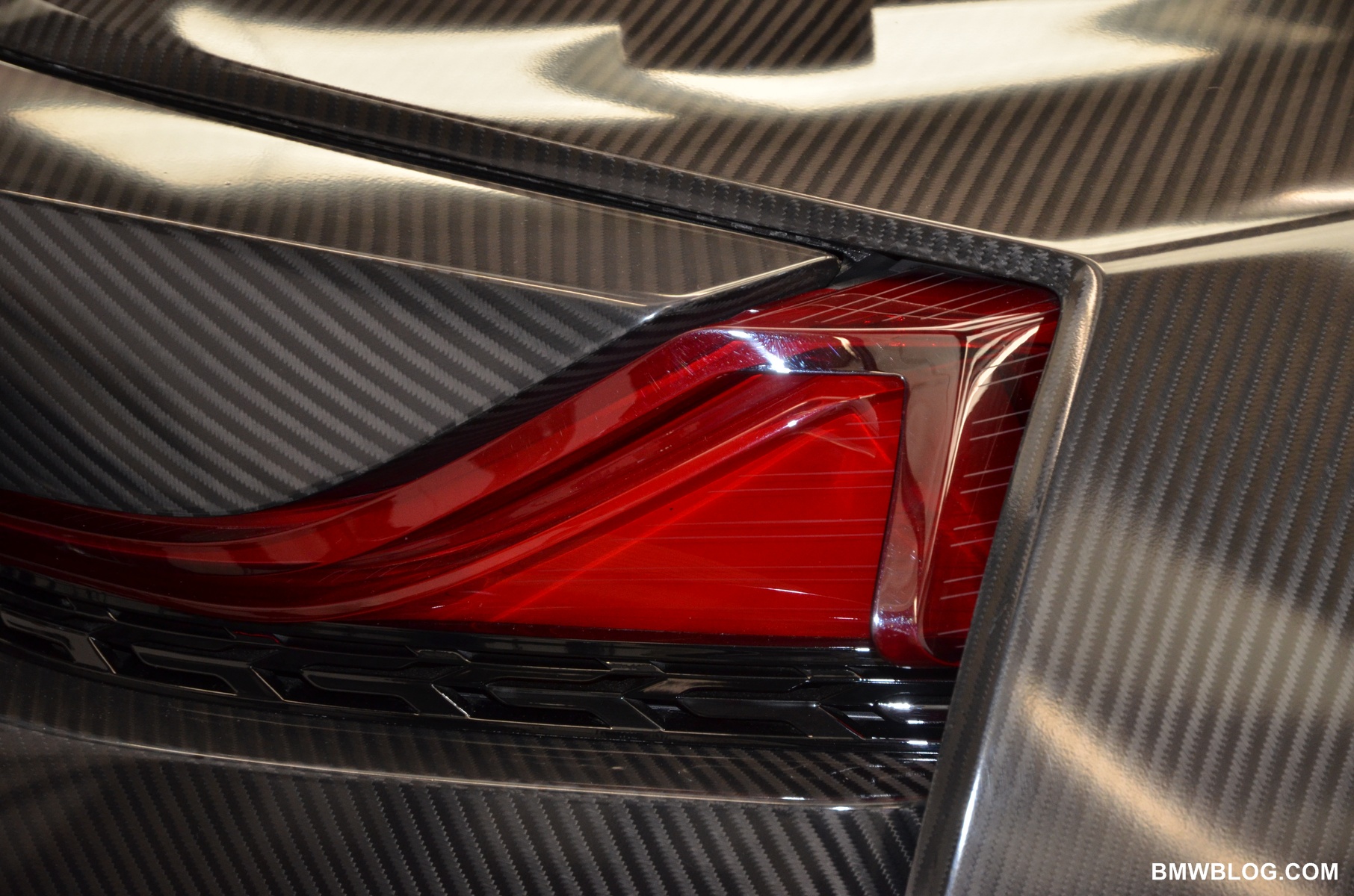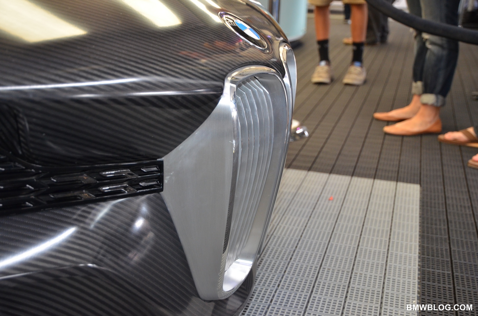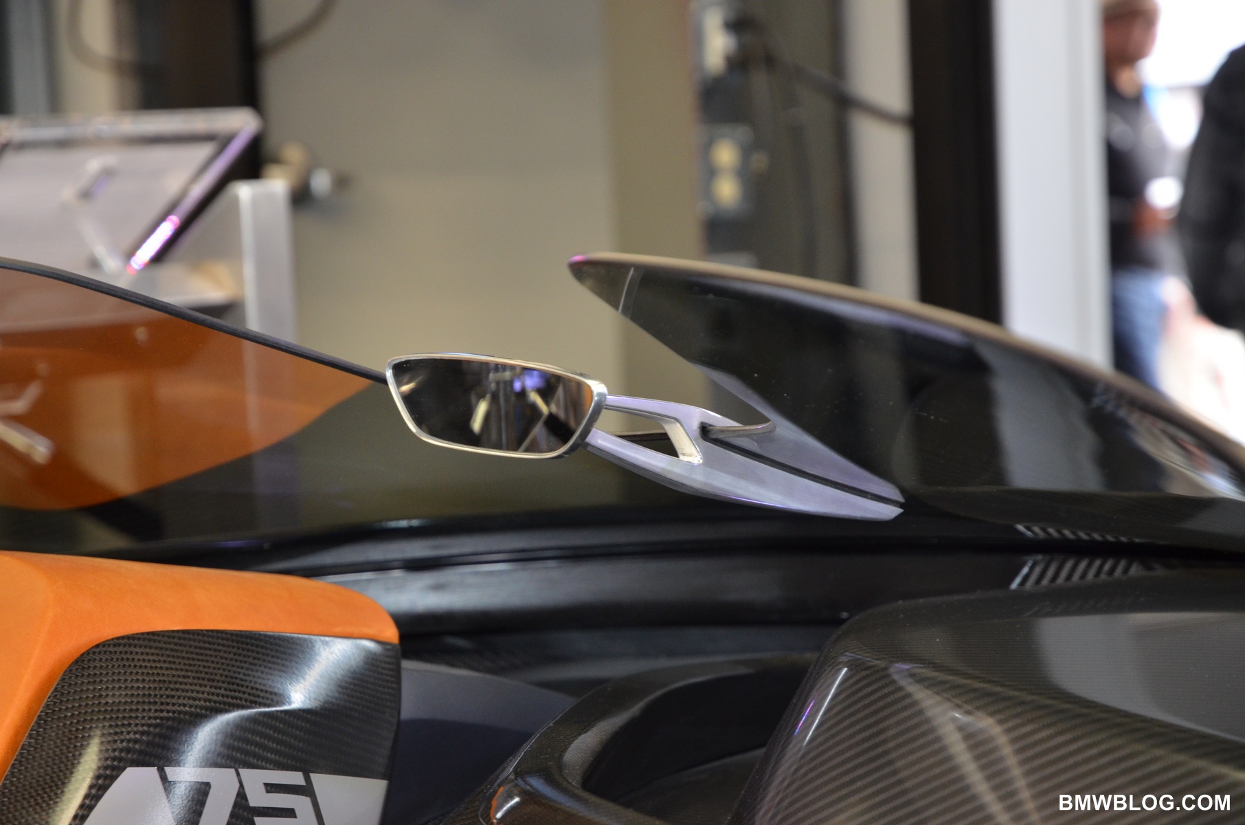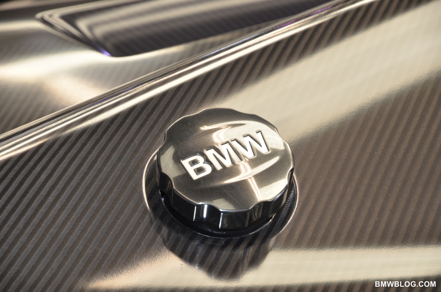 The proportions and cues follow the design language of the Vision family, another layering approach, both on the inside and outside. At the front, BMW designers chose a combination of classic and futuristic design cues, with a very wide and road-focused approach. The three-dimensional front-end leads with a long CFRP bonnet that offers an impressive road stance. The round headlights emphasize the car and driver’s focus on the road and are surrounded by large air intakes that create visual lightness.