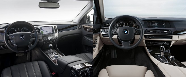 While both the Equus and the 7 Series have V8 power plants, a rear-drive platform and nearly identical fuel economy, the list of similarities ends quickly. Hyundai’s V8 is listed as 385 HP with 333 lb-ft of torque. The BMW ‘s 4.4 liter twin-turbo V8 is boasting 400 HP and a torque measurement of 450 lb-ft. This sort of disparity will become instantly clear to potential buyers. The German sedan will deliver on the promise of a luxurious environment without losing the ability to be a driver’s car.