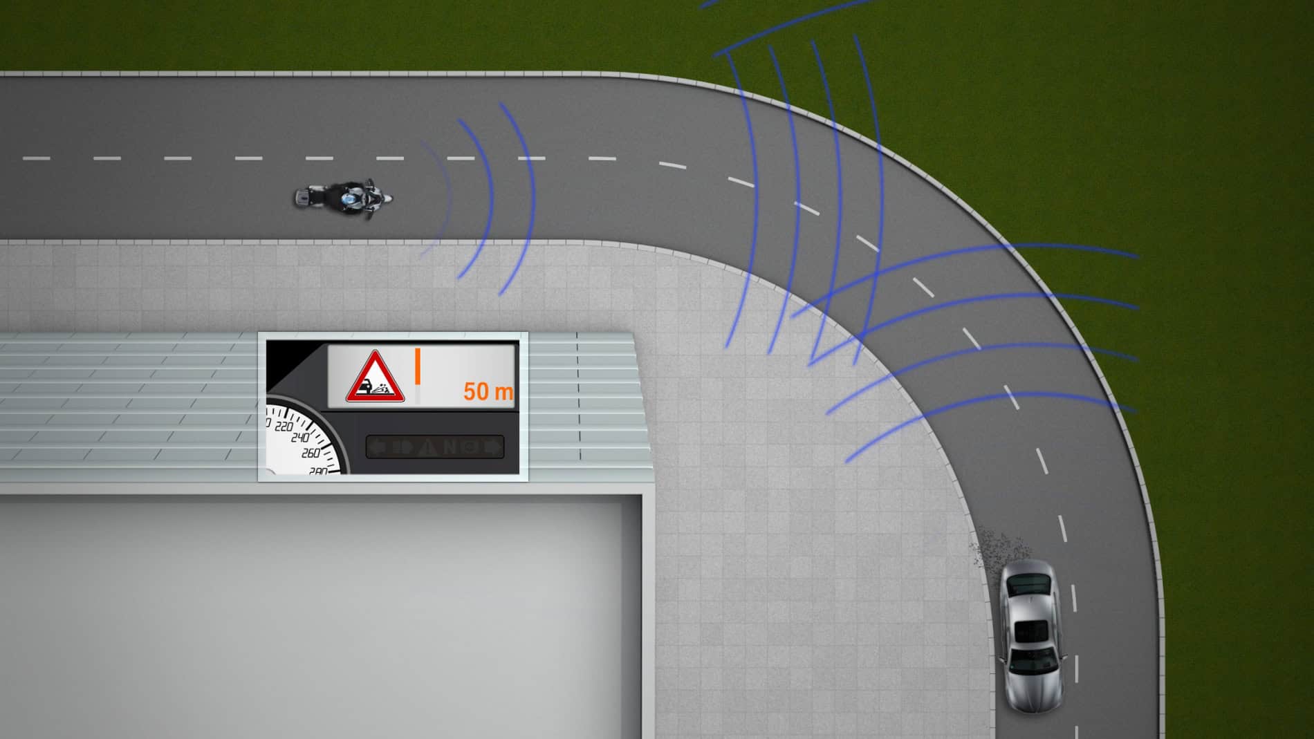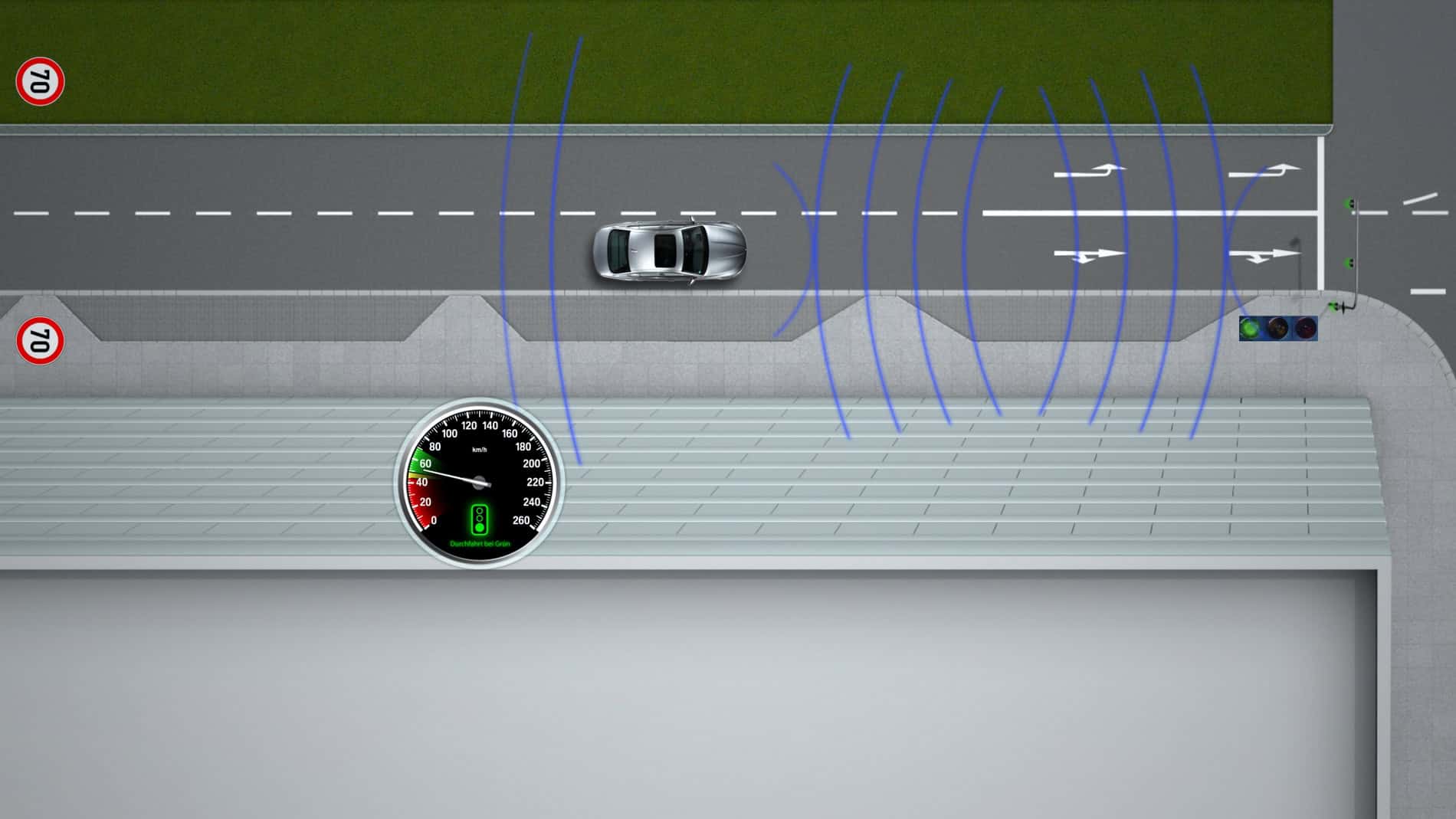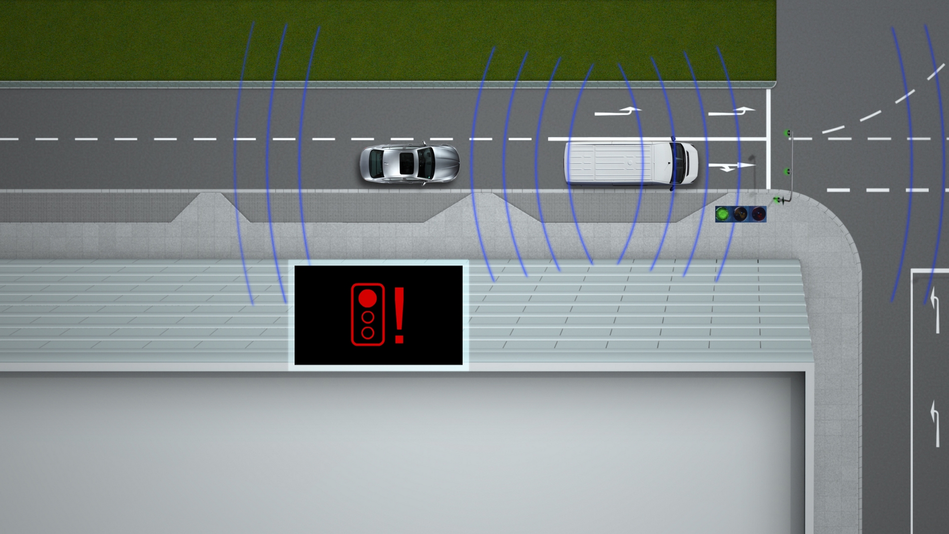 But warnings are only one possible use of this communication platform. Since infrastructure data, too – for example about traffic light phases – can be integrated into this communication system, information is available which allows drivers to easily adapt their driving style for even greater efficiency, thereby significantly reducing vehicle emissions. This technology therefore offers new solutions not only for proactive safety and accident prevention but also for intelligent energy management.