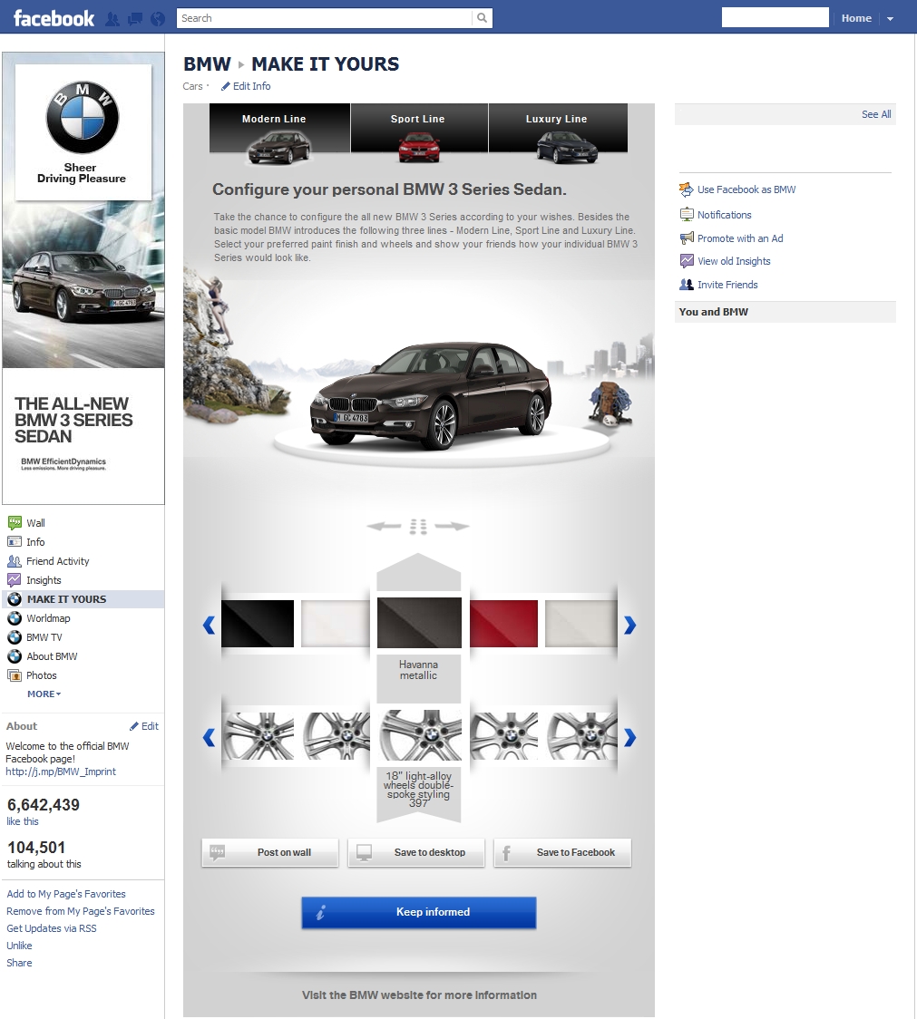 The first online measures can already be viewed at www.bmw.com and www.facebook.com/bmw. The online description on the BMW website provides all the information about the vehicle. Alongside details about the design of the vehicle, handling, efficiency, comfort and safety, the BMW lines are also presented. The new BMW 3 Series saloon is appearing initially in the BMW lines Sport, Luxury and Modern. In a BMW TV special, exterior and interior designers explain every facet of the vehicle. On Facebook, the new BMW 3 Series can be individually configured in the three equipment lines, paint colours and wheel rim design and can be viewed in a 360-degree image. The configured vehicle can then be posted and shared with friends.