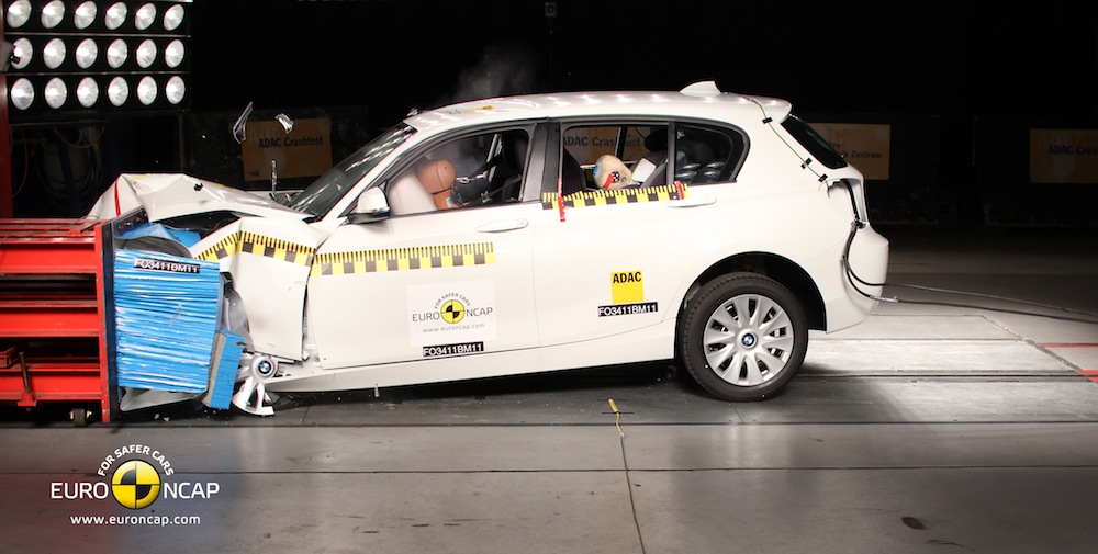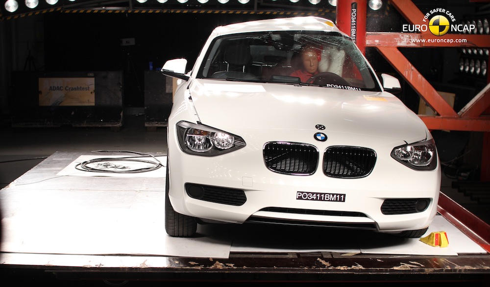The new 2012 BMW 1 Series scored 5 Starts in the Euro NCAP crash test. The 1 Series scored high, 91%, in the passenger compartment remaining stable in the frontal impact.