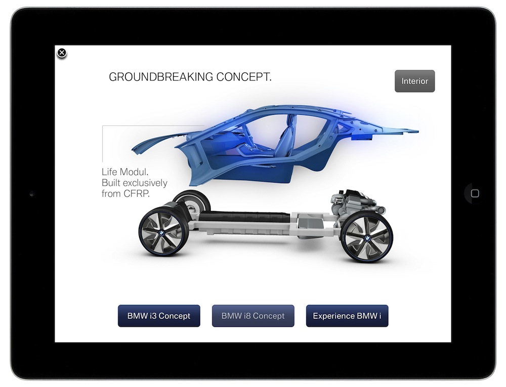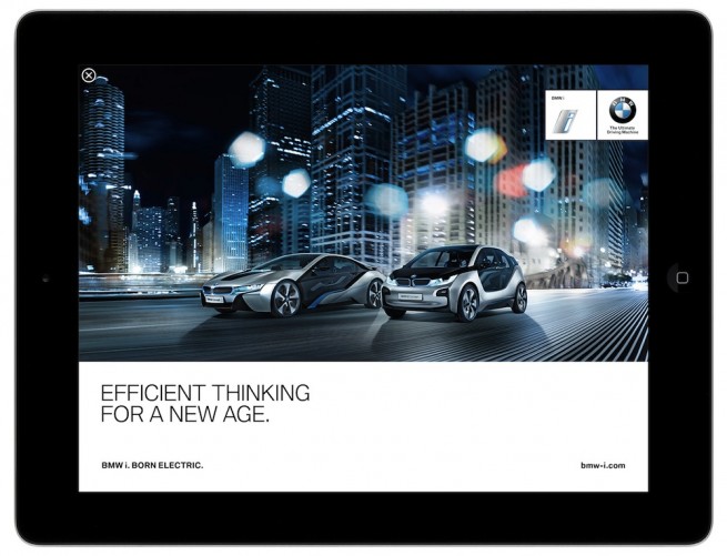 BMW i is running an iAd campaign in Europe reaching iPad, iPhone and iPod touch users in Germany, England and France. As launch partner for iAd on iPad in Europe, BMW i will be initiating an innovative campaign, which will exploit the advertising potential of the iPad and open the door to a three-dimensional world of mobility images and experiences. The BMW i3 and BMW i8 concept cars will form the main focus of the advertising campaign. iPhone, iPod touch and iPad functionalities bring the cars to life, allowing them to move freely in 3D.