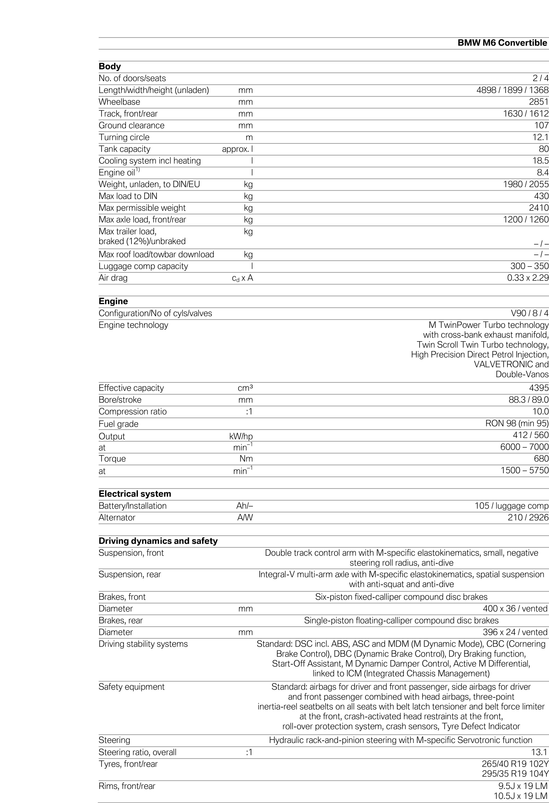 The engine’s exhilarating thrust gives the new BMW M6 models impressive acceleration. The instant power delivery and sustained thrust of the engine results in an acceleration of 0– 62 mph (0-100 km/h) in 4.2 seconds for the Coupe and 4.3 seconds for the Convertible. The sprint from 0–124 mph (0-200 km/h) takes only 12.6 seconds for the Coupe and 13.1 for the Convertible. The top speed of both models is electronically limited to 155 mph (250 km/h). While the engine’s output has increased by around 10% and maximum torque is up by more than 30%, the new BMW M6 models consume roughly 30% less fuel and have substantially higher range than their predecessors.