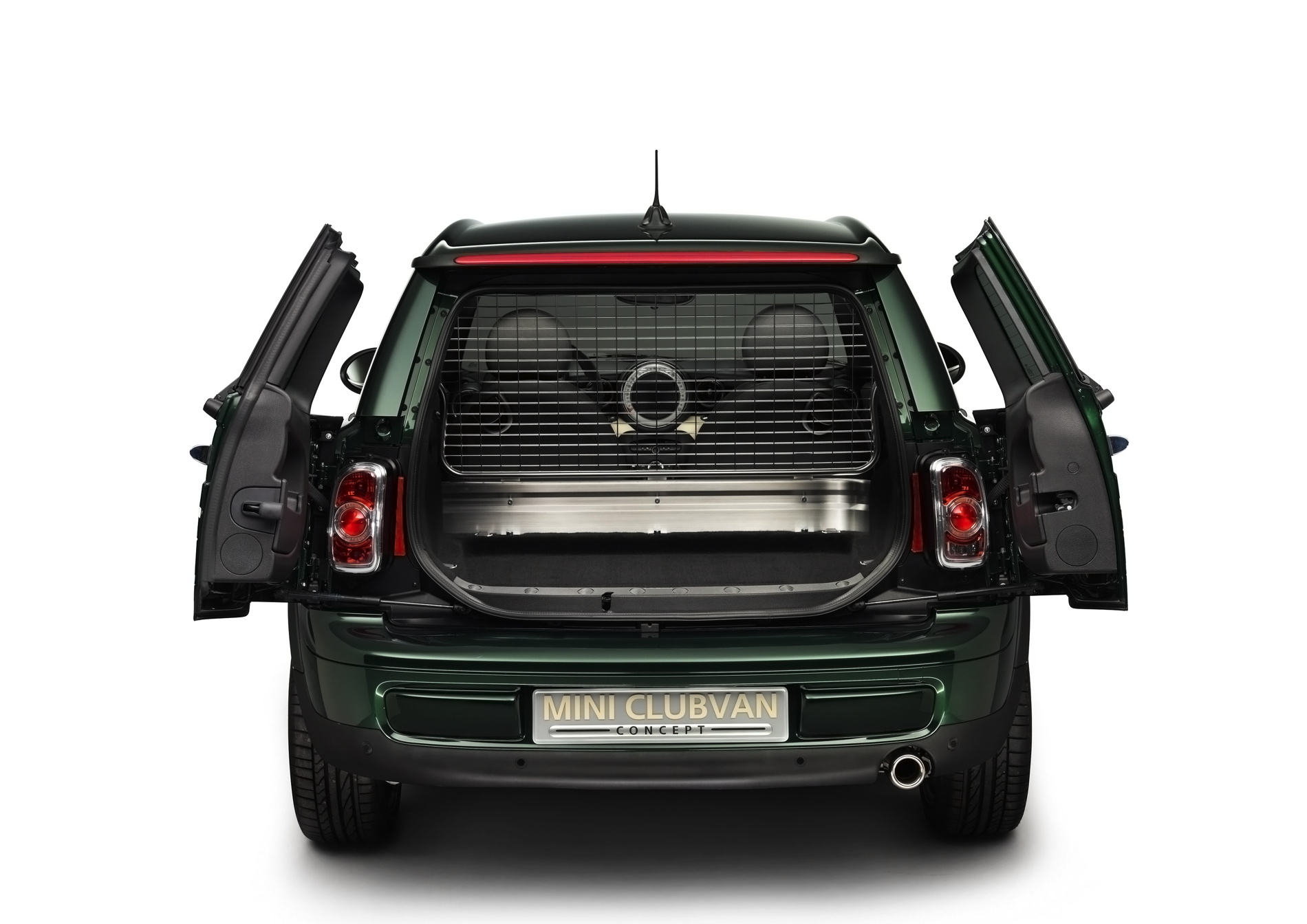 The MINI Clubvan Concept is finished in British Racing Green paintwork, which extends to the roof, C-pillars and exterior mirror caps. The rear side windows are opaque with polycarbonate sections and are painted in the car’s body colour. The rear doors feature heavily tinted glass making it difficult to see into the load compartment.