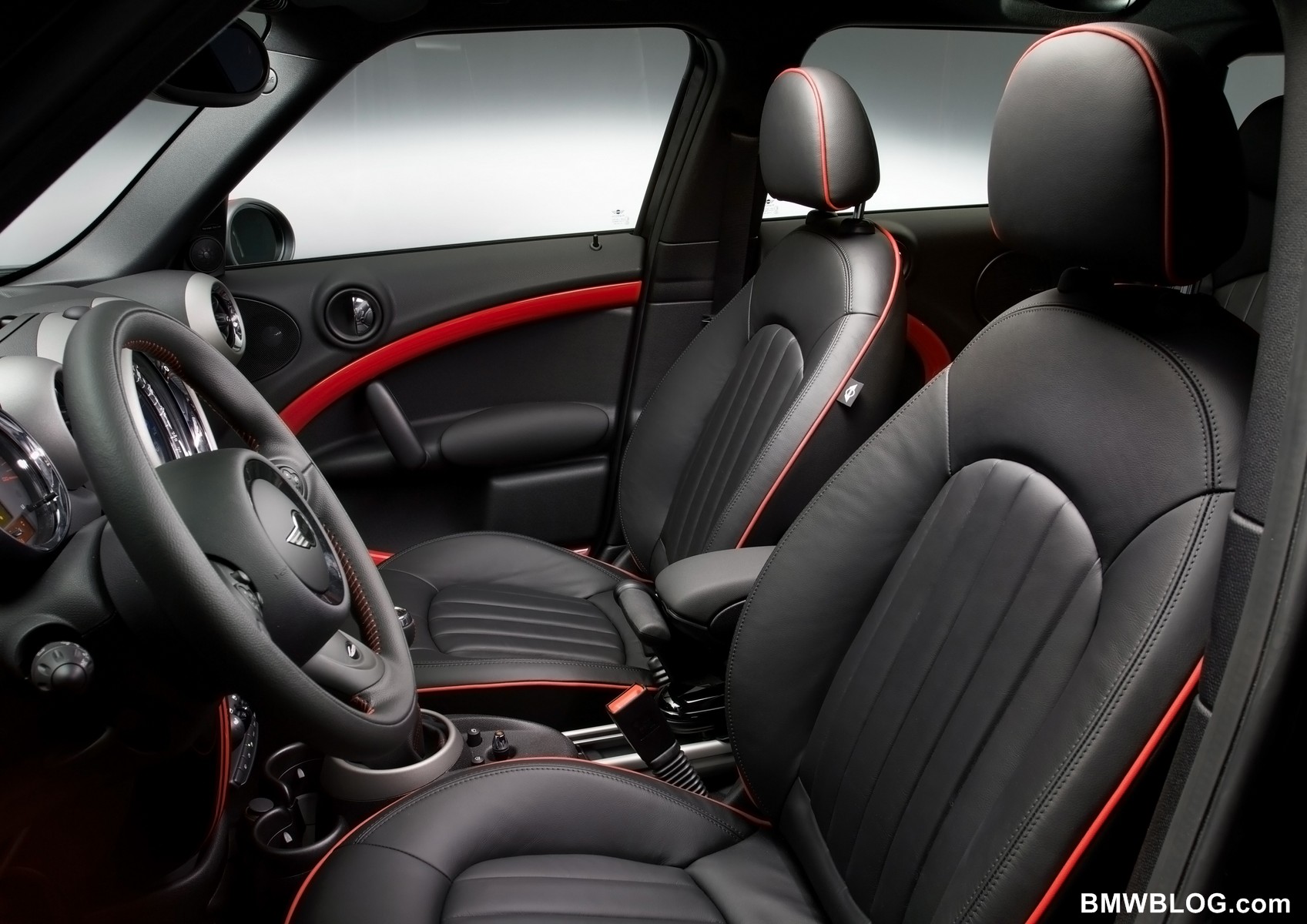 The interior of the MINI John Cooper Works Countryman also comes with additional sporting touches as standard. Sports seats in Diagonal Track Carbon Black cloth trim with red contrast stitching have been designed specifically for the new model; while options such as the similarly exclusive sports seats with Lounge Leather trim in Carbon Black Championship Red can also be ordered. The trim strips around the cockpit, door panels and center console come in Piano Black as standard. The optional Chili Red trim elements, meanwhile, are exclusive to the MINI John Cooper Works Countryman and include red flourishes for the cockpit and doors, and red stripes for the black trim elements on the center console. Added to this are the sports steering wheel with red contrast stitching and John Cooper Works logo, the dark speedometer and rev counter dials, anthracite-colored roof liner, gearshift lever with red shift pattern lettering, red contrast stitching for the gearshift lever gaiter and floor mats with red stitching add further depth to the sports car ambience.