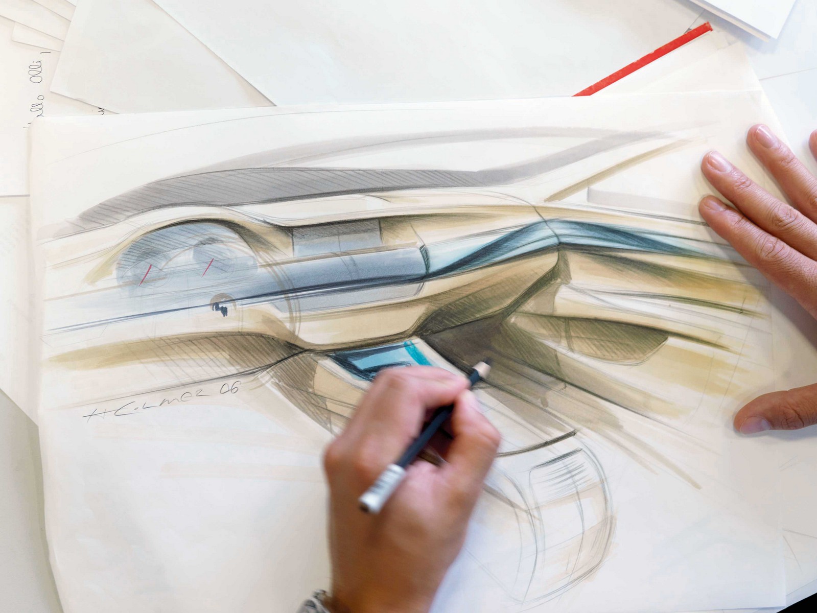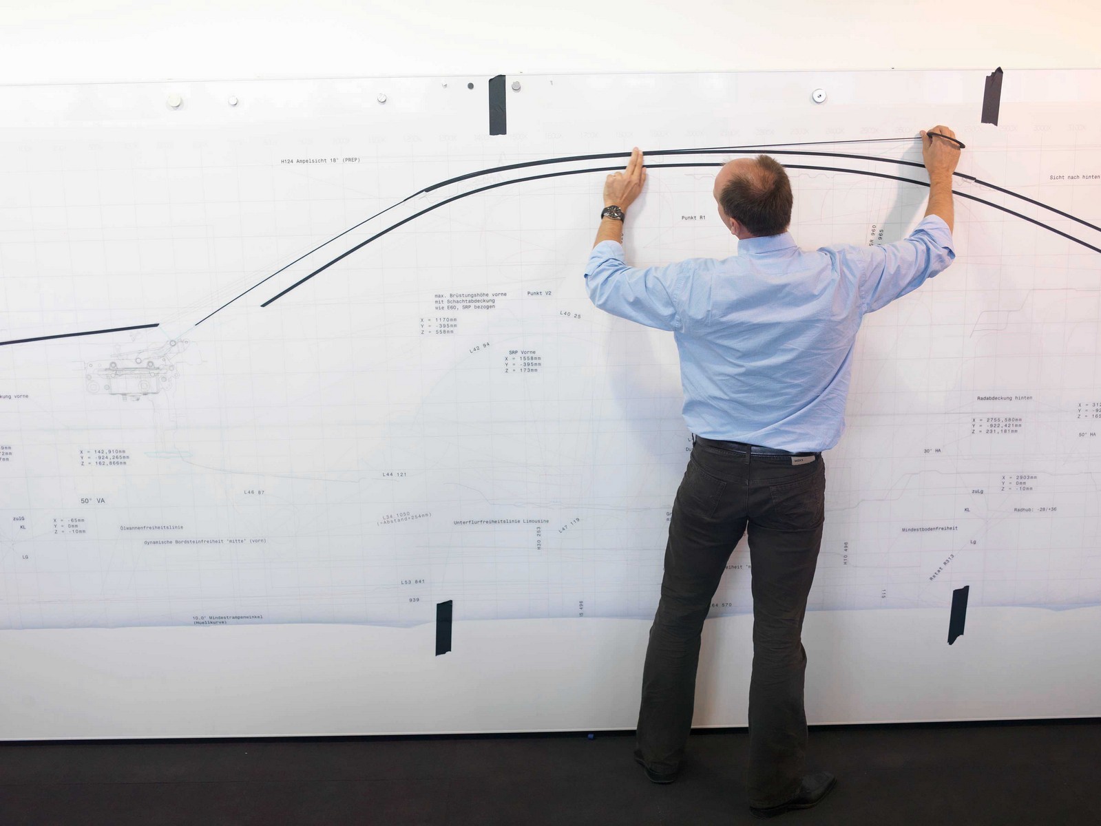 At the start of the initial project phase, the critical attributes are laid down. Based on these, the designers then produce the first proportional models for the new vehicle. Determining the proportions is a highly important aspect of the design process. As with any product, so with the car, too, perfect proportions are seen as the key to aesthetics and harmony. The designers start out by drawing the silhouette and the characteristic lines of the incipient vehicle. After the initial sketches they produce so-called tape drawings on a package plan – a kind of grid map of the vehicle on a 1:1 scale and including all its technical and structural constituents. Using flexible tape, the designers attach the main proportional lines onto the package to accentuate them. In the finished tape drawing, the silhouette and contours already convey the character of the completed vehicle. In the ensuing dialogue between the designer and CAD modeller a virtual 3D proportional model of the new car is created.