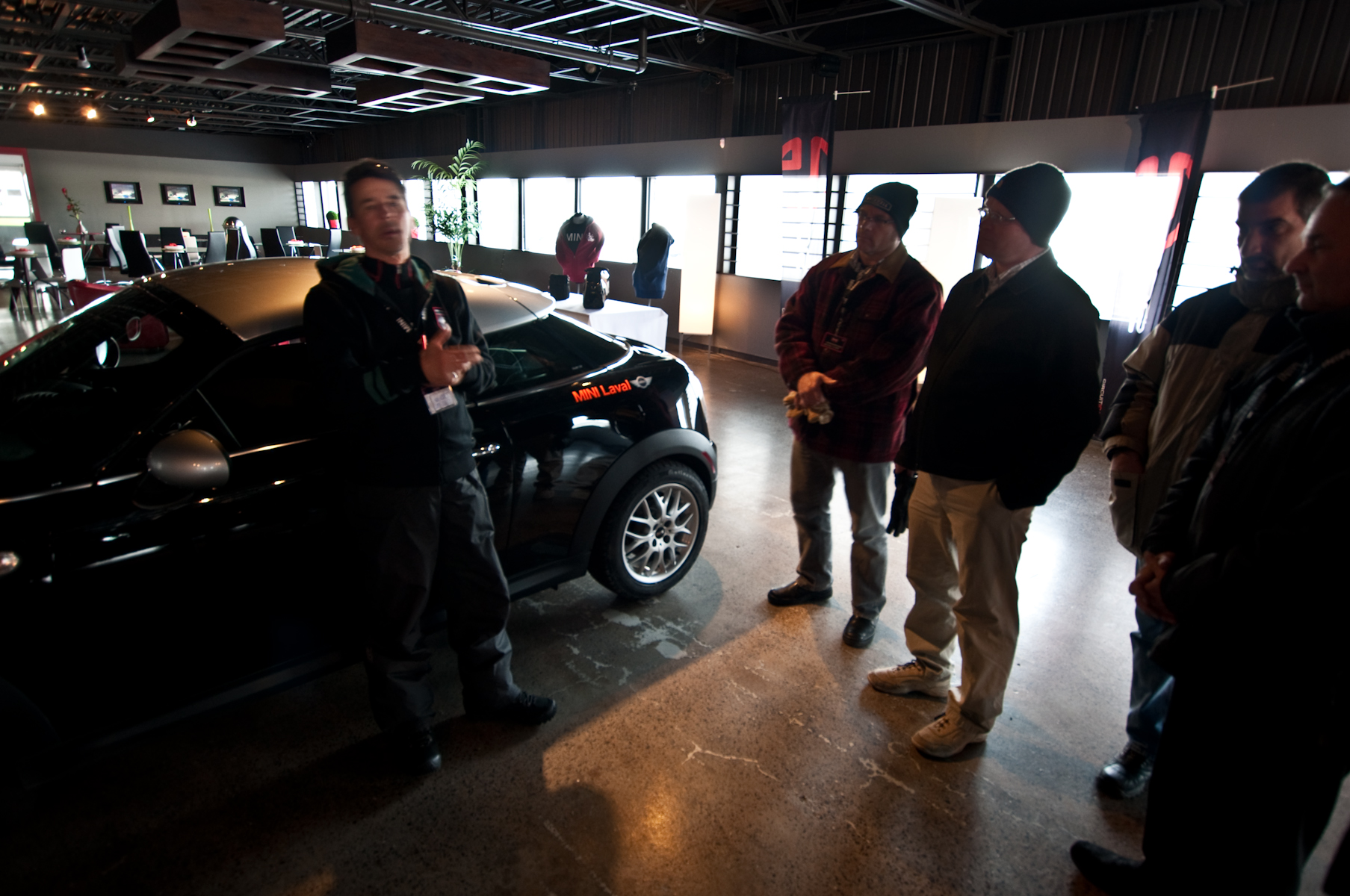 To that end, MINI Canada set up a brilliant training course on packed snow and ice in the frigid cold of Montreal, Quebec. Thankfully, the weather was quite temperate during our time at the training event, and we were not severely punished for forgetting our long johns. The venue was situated behind a new abandoned airport – that’s right, new, not old. A waste of money it may have been, but the advantage of training on smooth, flawless concrete and asphalt was much appreciated and added to the quality of the course. Most of the concrete was covered up by a thick base of ice and snow anyway, but the smooth base translated into a smooth surface to train on. The facilities were also modern and very well maintained, making you feel at home from the moment you arrived. Breakfast and lunch was also catered, and the food was delicious and nutritious – just what you need to distract yourself from traction circle graphs when it’s finally time to eat.
