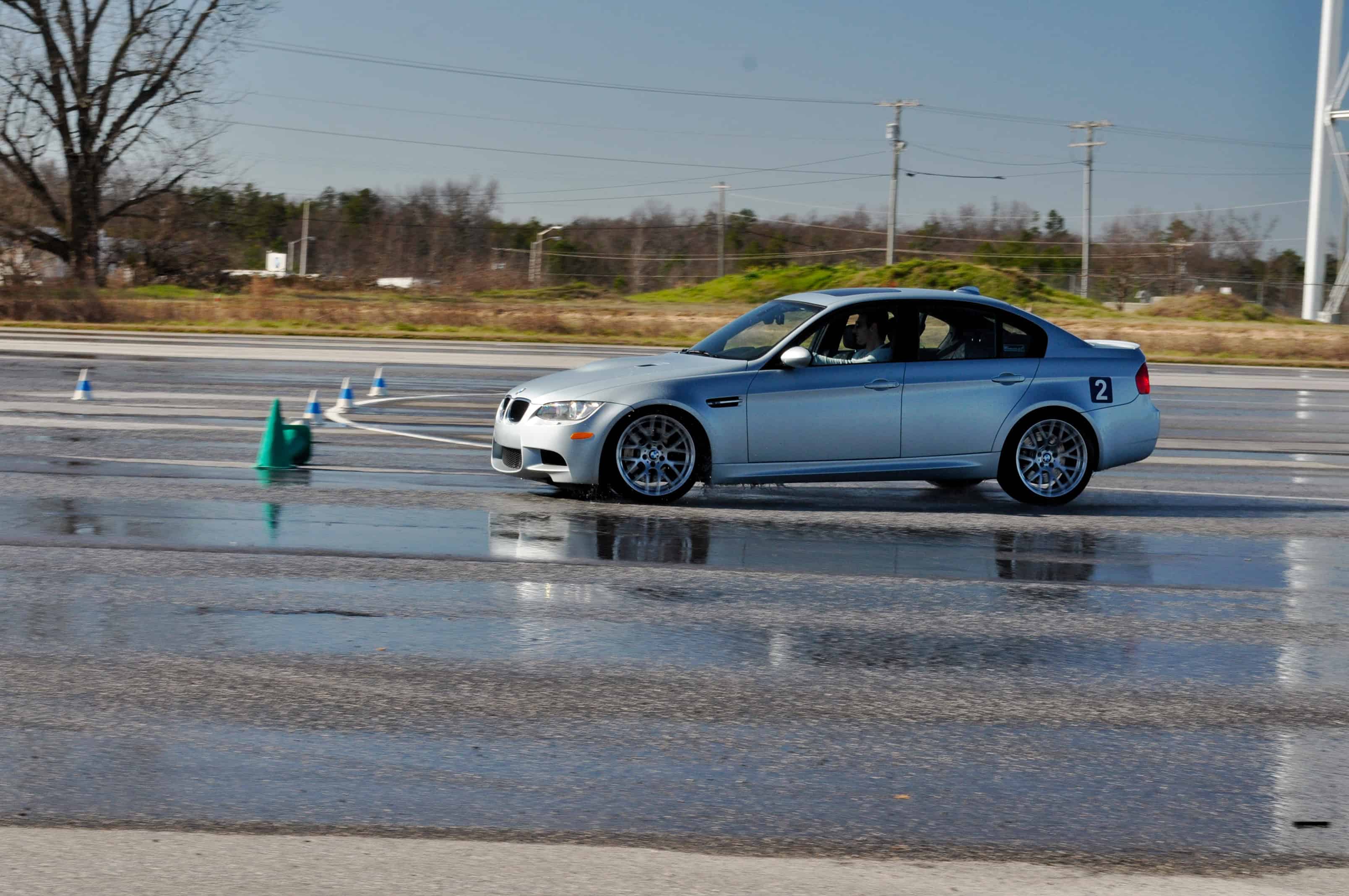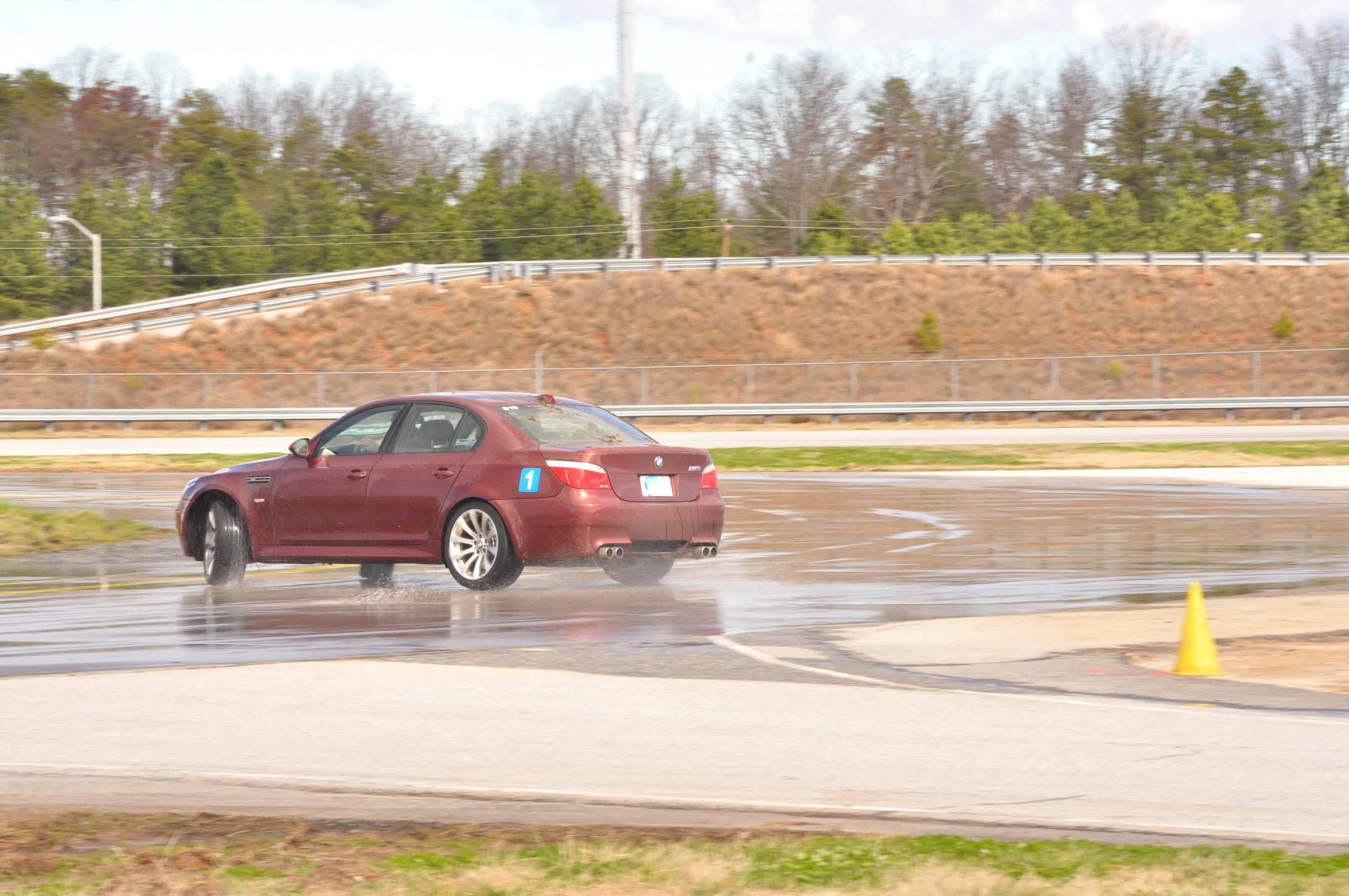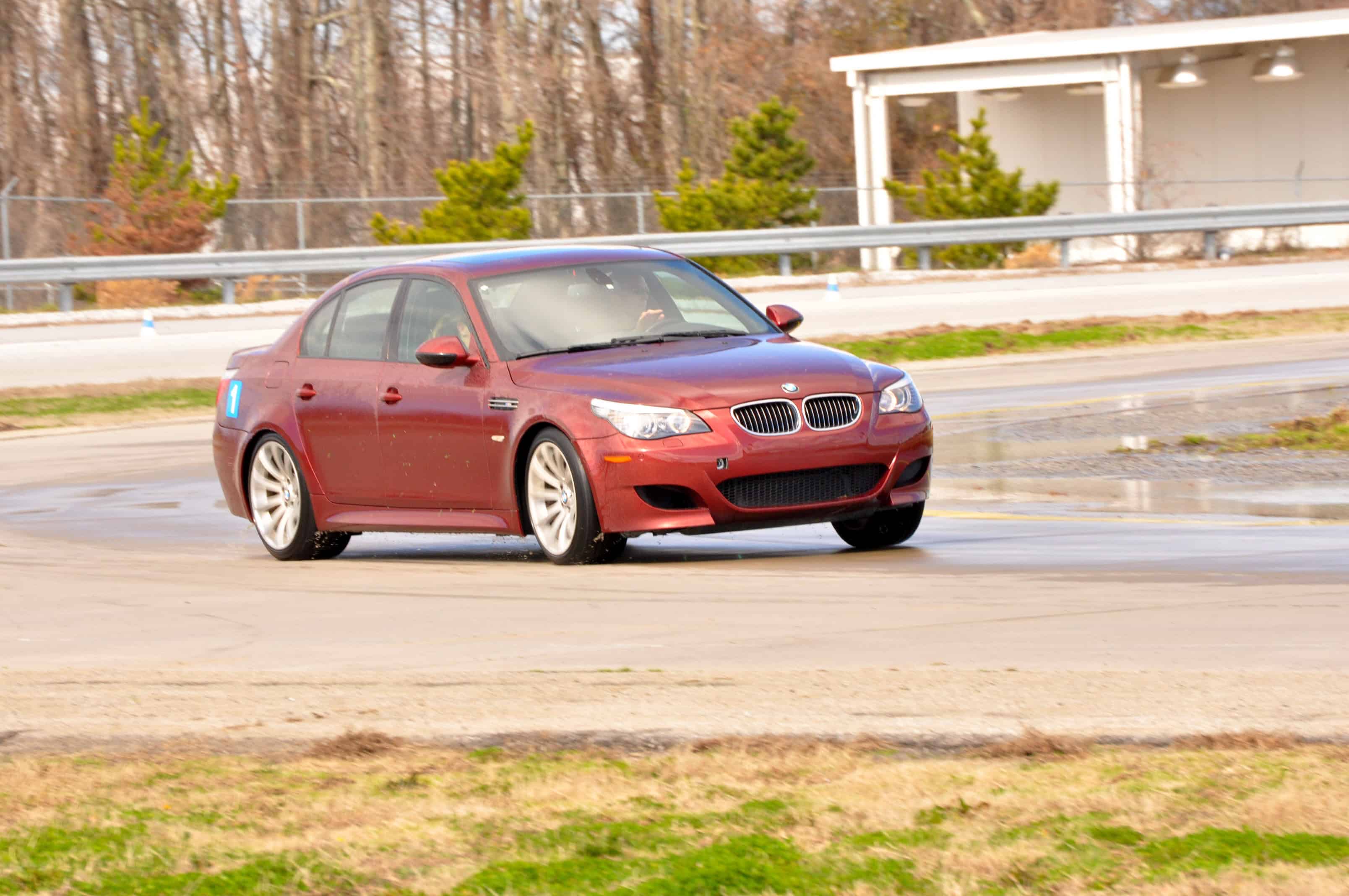 Following our stint in the 1M Coupes, we grouped up and headed in for a 10 minute break prior to a stint in the E60 M5’s at the dreaded skid pad. The skid pad is not only a test of car controls skills but also of one’s intestinal fortitude. The goal of the exercise was to show the power of Dynamic Stability Control(DSC) as a means of reigning in a car even a powerful as the 507HP E60 M5 when perhaps the driver’s right foot gets a little too aggressive for road conditions. Sure enough, after a few laps with instructor Allison Bormann around the massive concrete circle with DSC on and my foot to the floor – there was no slip at the rear wheels until she thumbed the traction control button off on the dash and it was time to hang out the rear of the M5. While circling the skid pad, slowly increasing speed to 40MPH to 45MPH, just at the limit of traction I jabbed the throttle and then steered into the turn to control the car – using the driver’s window to track where I needed the car to go. Sounds easy – but to control a car in a skid is much harder than it seems. In this exercise it was critical to keep your eyes up, focused on where you need the car to go versus the direction it might be heading and having quick hands and feel to quickly adjust steering angle and “maintenance throttle” to keep the slide going. Alas, despite Allison’s expert tutelage, I couldn’t quite hold the drift around the full circuit but my breakfast did stay down on the G-heavy exercise.
