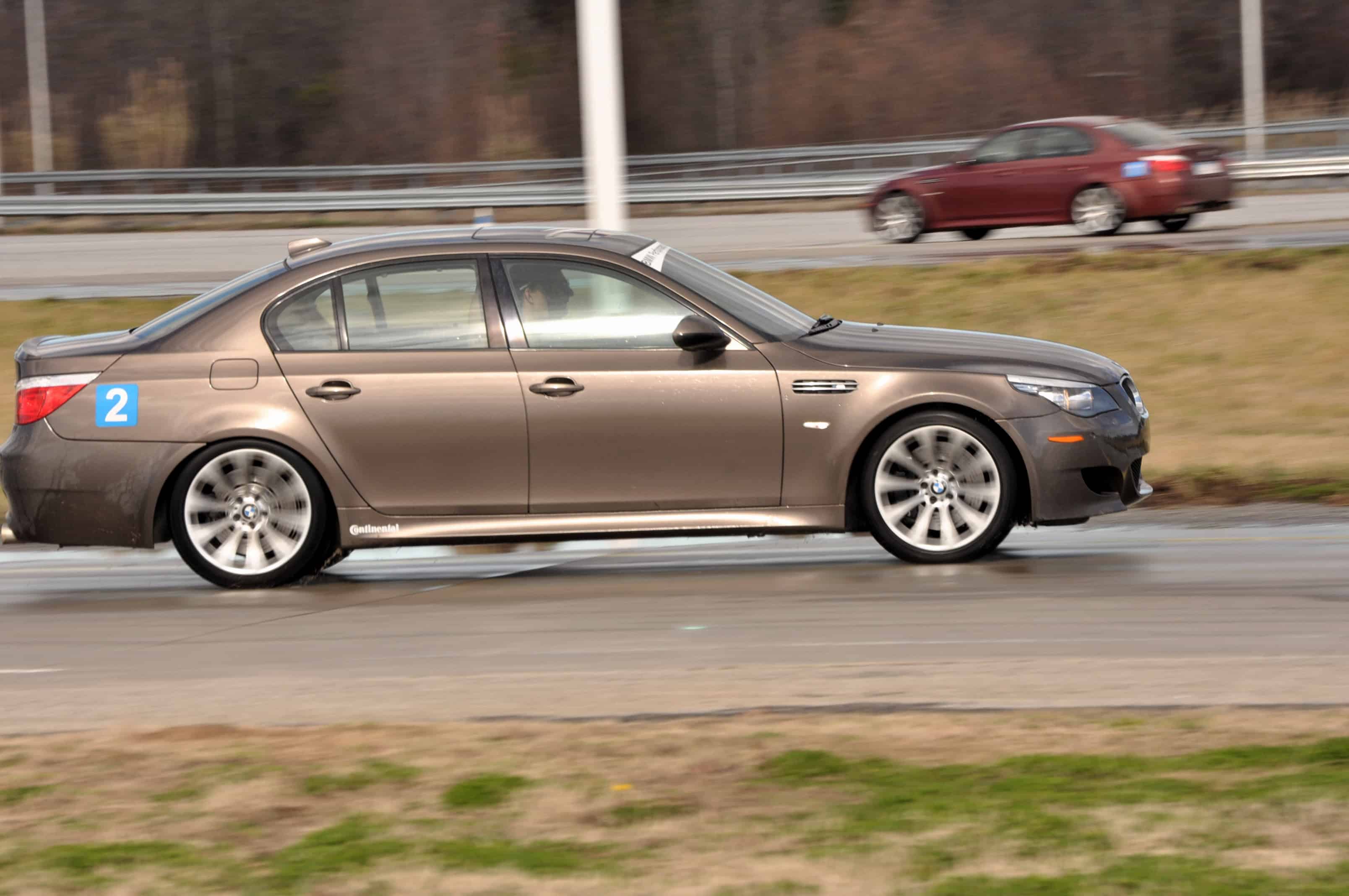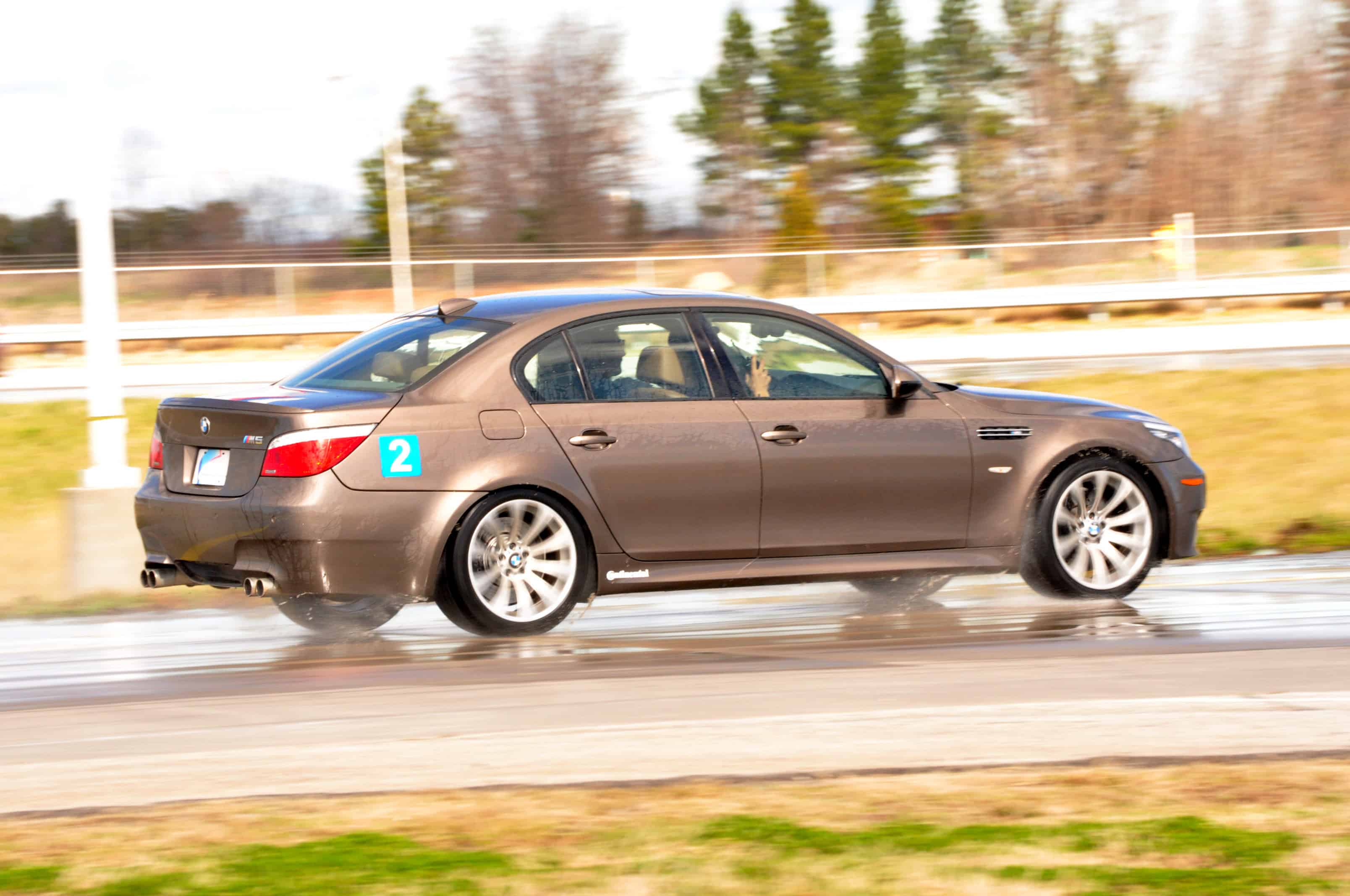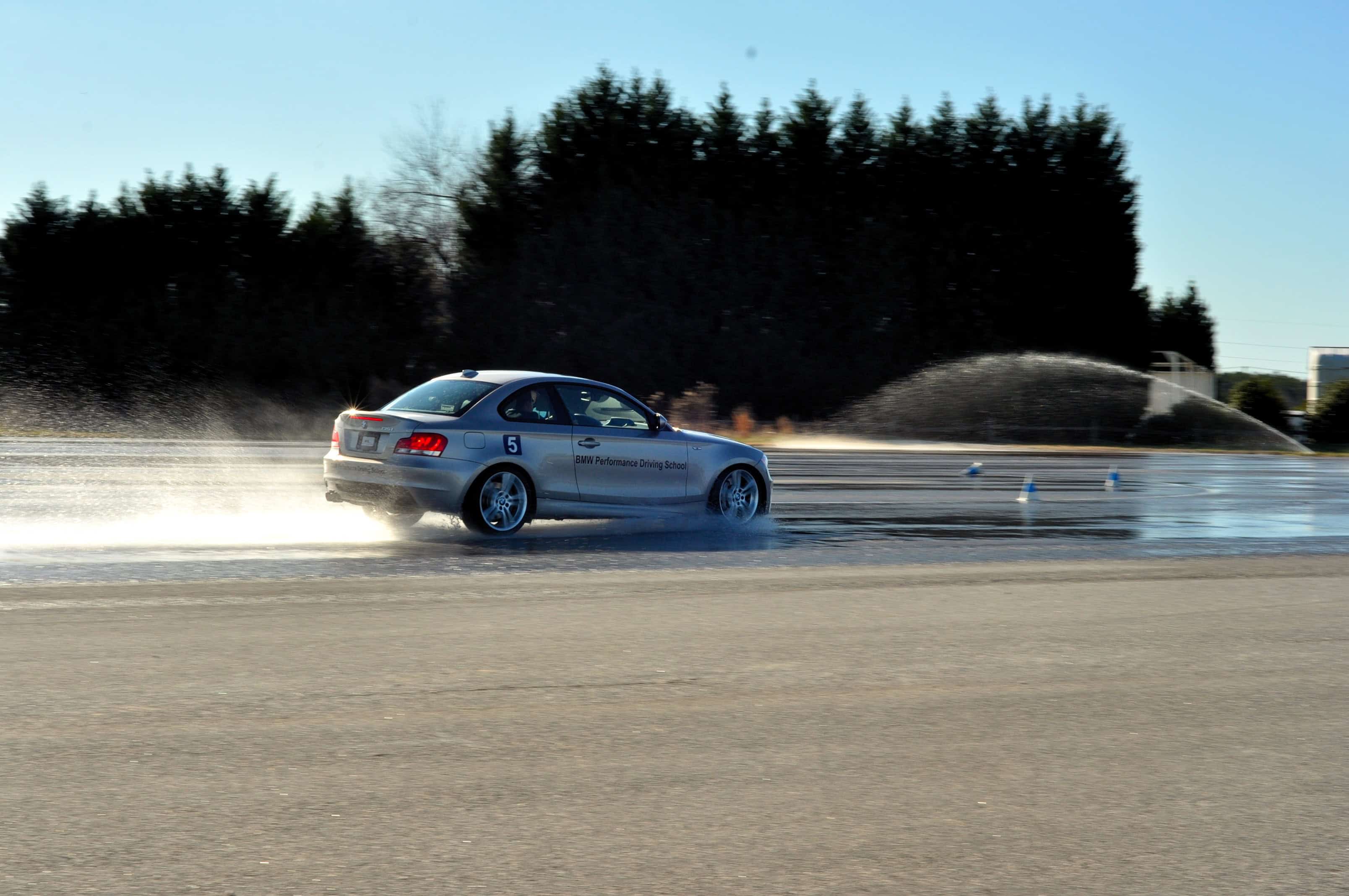 Following our stint in the 1M Coupes, we grouped up and headed in for a 10 minute break prior to a stint in the E60 M5’s at the dreaded skid pad. The skid pad is not only a test of car controls skills but also of one’s intestinal fortitude. The goal of the exercise was to show the power of Dynamic Stability Control(DSC) as a means of reigning in a car even a powerful as the 507HP E60 M5 when perhaps the driver’s right foot gets a little too aggressive for road conditions. Sure enough, after a few laps with instructor Allison Bormann around the massive concrete circle with DSC on and my foot to the floor – there was no slip at the rear wheels until she thumbed the traction control button off on the dash and it was time to hang out the rear of the M5. While circling the skid pad, slowly increasing speed to 40MPH to 45MPH, just at the limit of traction I jabbed the throttle and then steered into the turn to control the car – using the driver’s window to track where I needed the car to go. Sounds easy – but to control a car in a skid is much harder than it seems. In this exercise it was critical to keep your eyes up, focused on where you need the car to go versus the direction it might be heading and having quick hands and feel to quickly adjust steering angle and “maintenance throttle” to keep the slide going. Alas, despite Allison’s expert tutelage, I couldn’t quite hold the drift around the full circuit but my breakfast did stay down on the G-heavy exercise.