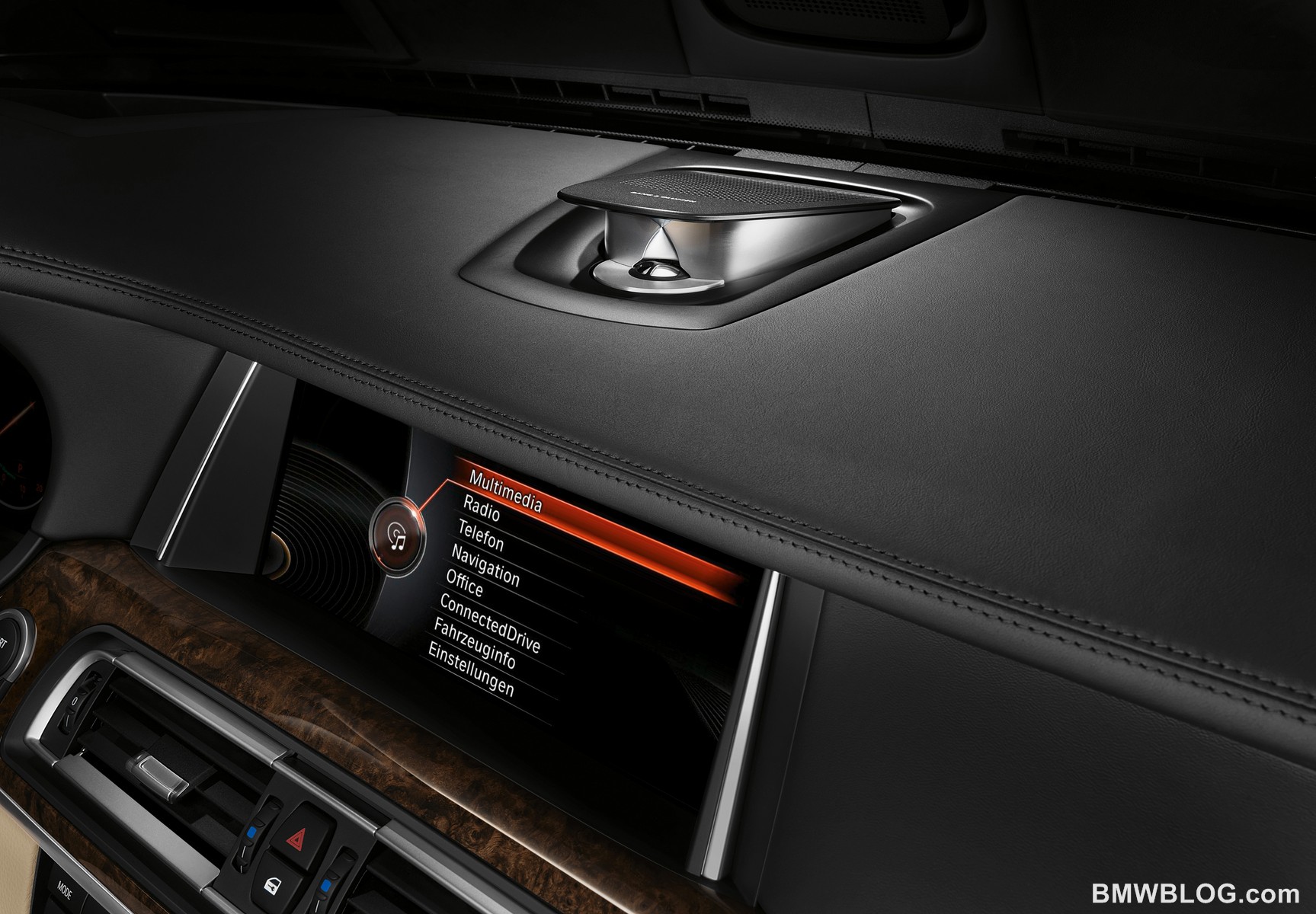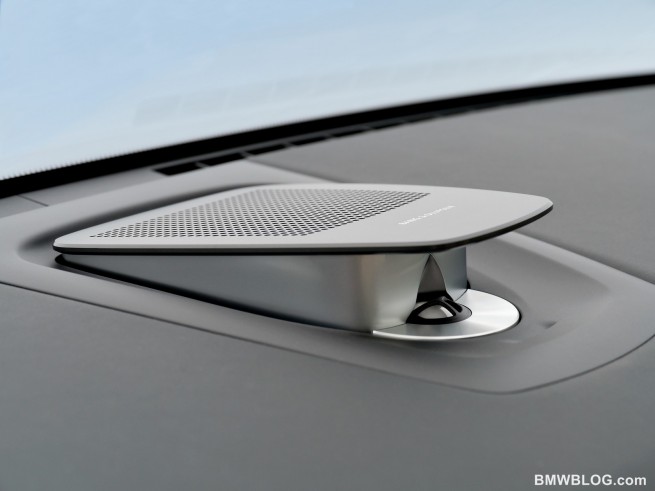 The electrical signals are converted into precisely defined sound waves using neodymium magnet drivers, and the mid-range speakers feature extremely stiff Hexacone diaphragms. The outstanding quality of the Bang & Olufsen High-End Surround Sound System is underlined by exclusive design features. The form and color of the advanced all-aluminum speaker grilles have been tailored precisely to the interior design of the new 7 Series. The special perforation pattern of the grilles is created using a very sophisticated drilling technique. The grille mounts are not visible from the outside, ensuring that the grilles stand out from their surroundings by appearing to float in a slightly raised position above the surface. This exclusive ambience is further enhanced by a discreet lighting effect, which showcases the contours of the sound sources with a subtly impressive effect. The B&O Acoustic Lens Technology element in the center of the instrument panel area adds both a visual feature and is an acoustic innovation. As soon as the audio system is activated, the central element containing the integrated mid-range speaker pops up, prompting the tweeter lens to be extended at the same time. The tweeter lens distributes its signals evenly at 180 degrees throughout the interior. This extraordinarily harmonious horizontal dispersion of sound is achieved through the special design of the lens, which also minimizes unwanted vertical sound dispersion.