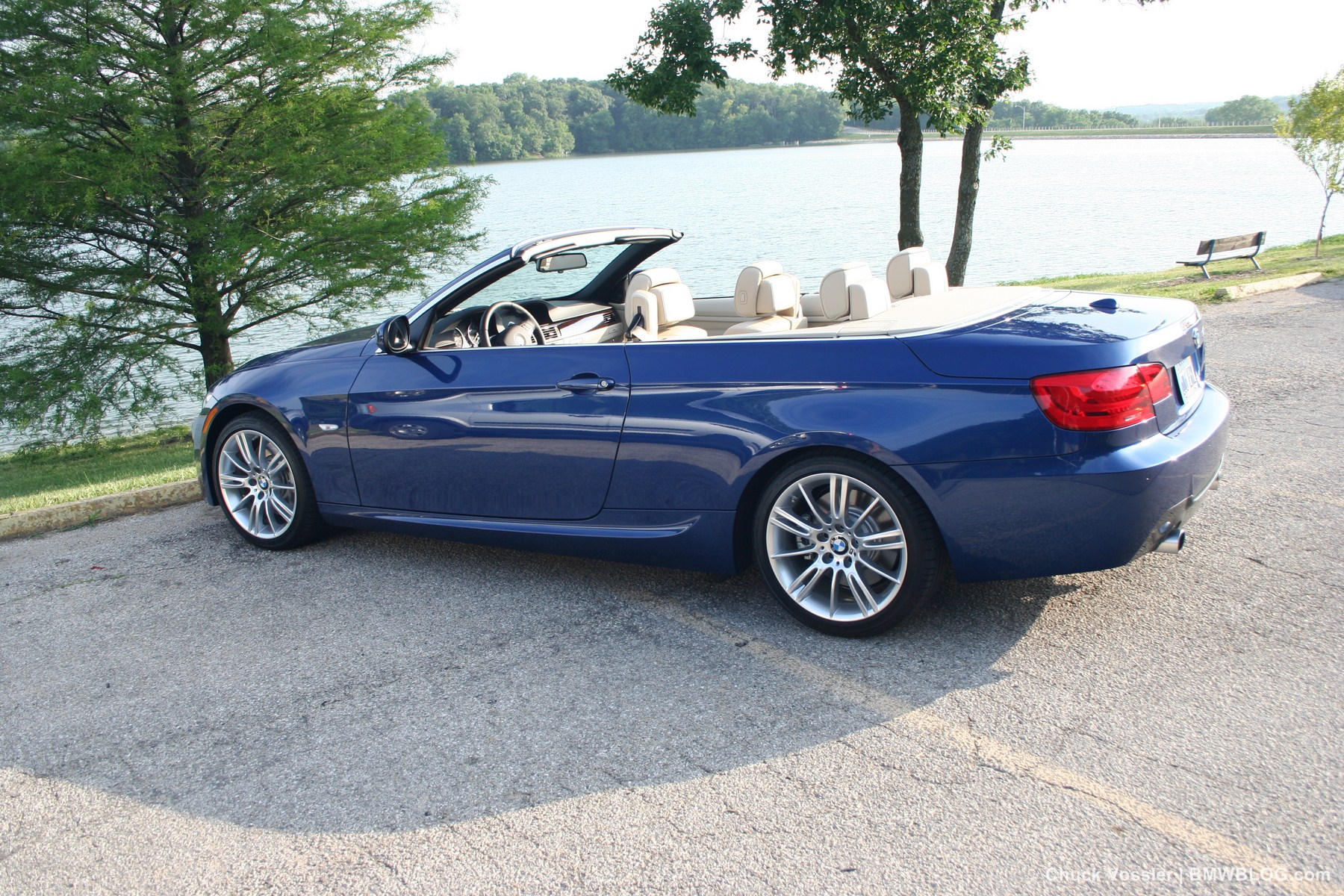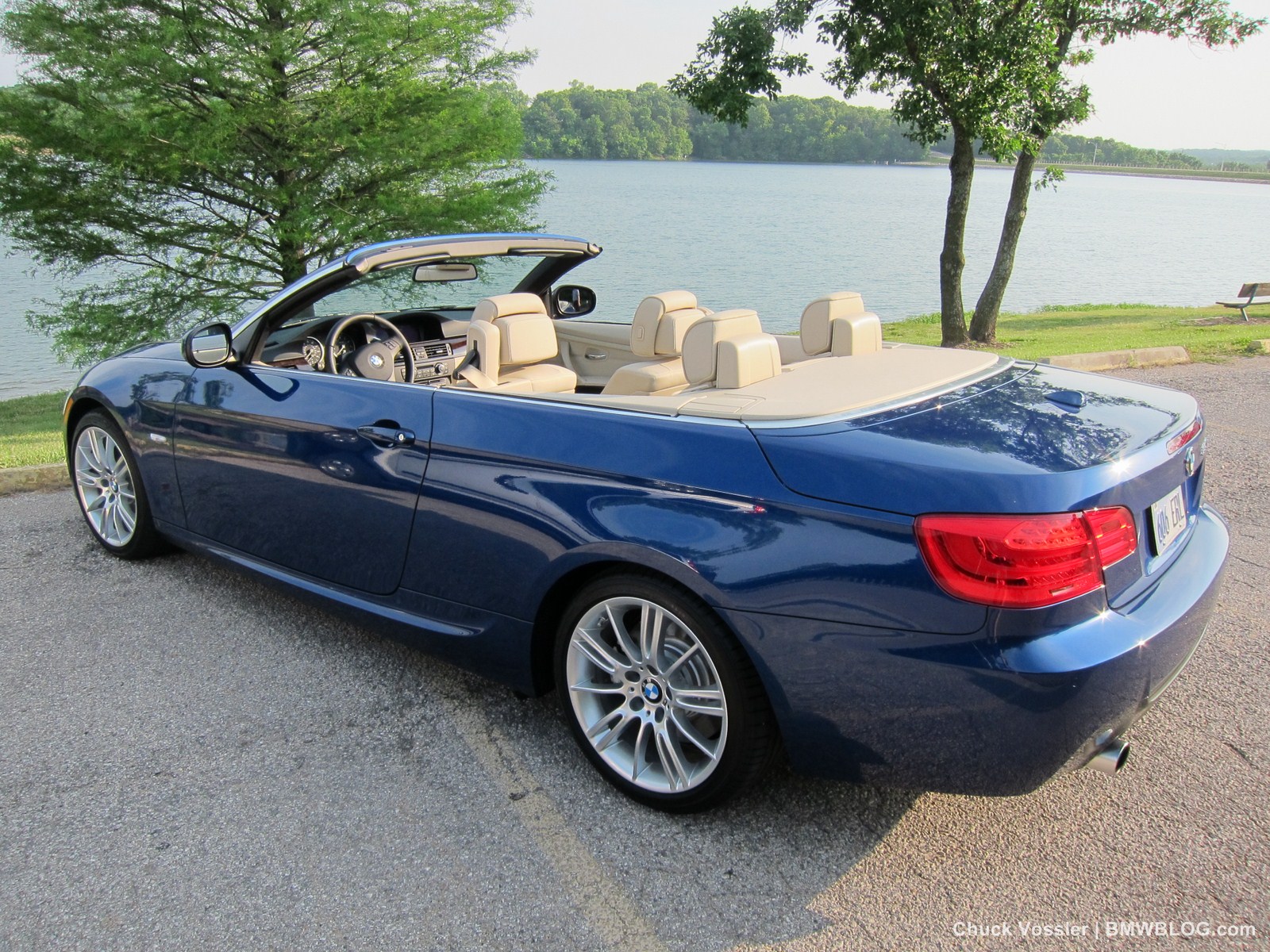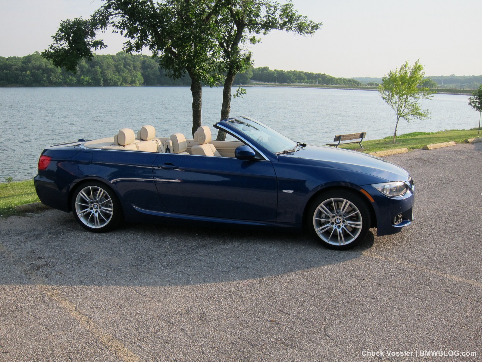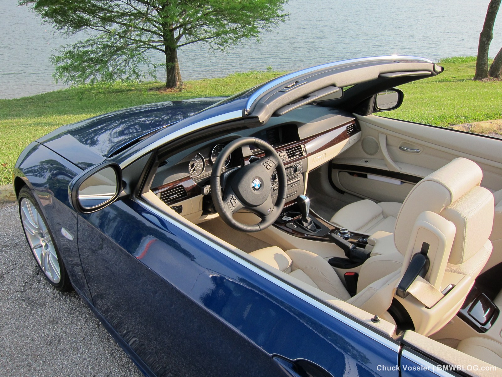 Ah summertime! What better time is there than this to drive a BMW convertible? Sometimes, we in the automotive press, spend too much time talking about the latest and greatest, forgetting about the here and now. This realization dawned on me while taking in the stunning view of the low slung, wide M-Sport package 2012 BMW 335i Convertible, top down in the shimmering sunlight next to the lake in LeMans Blue Metallic with its cream beige Dakota leather.