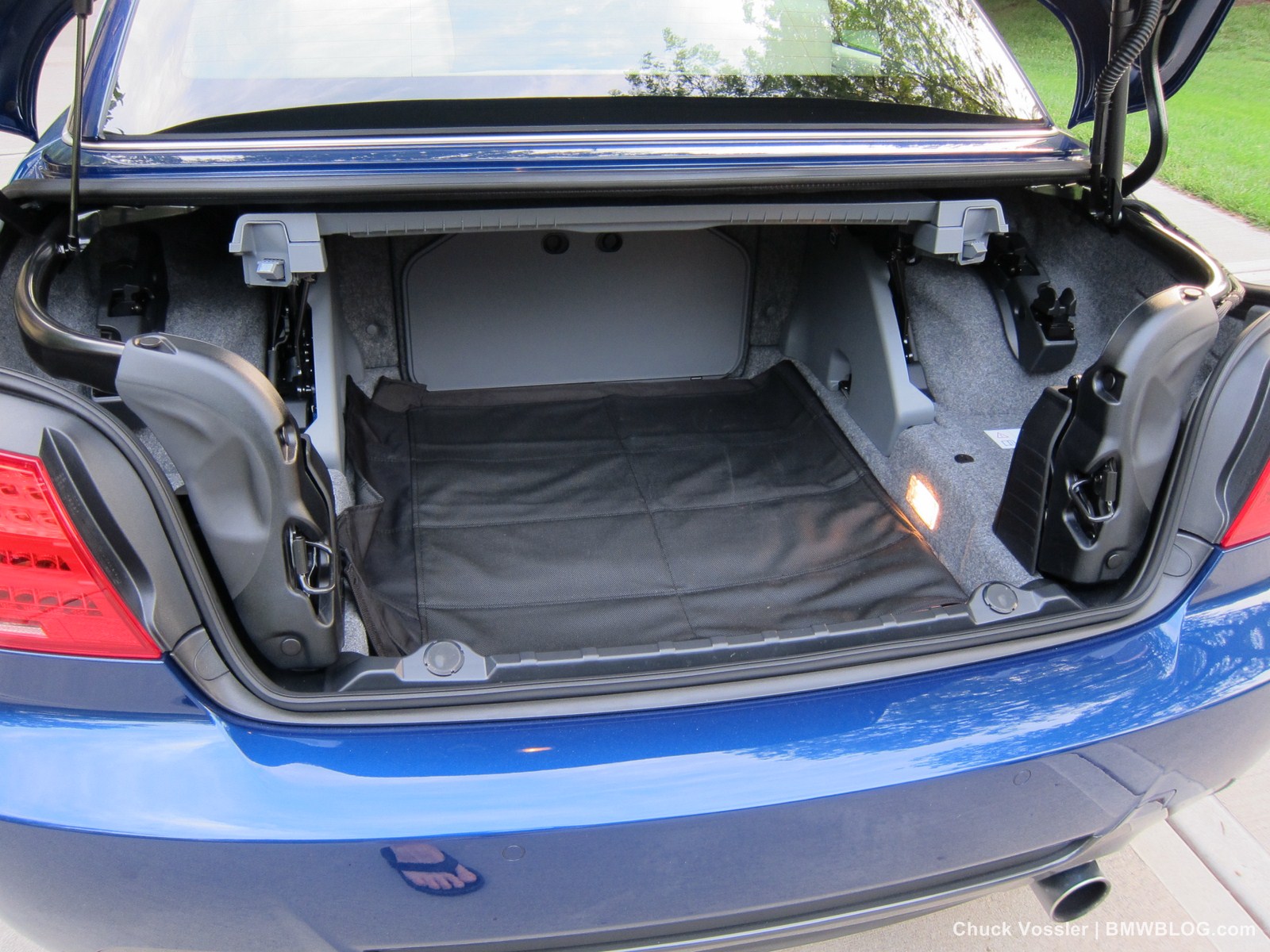 In the trunk, there is a little tray that moves up to give you more storage space but it needs to be down if you want to put the top down. It’s probably put there as a device to remind you that space is limited with the top down. This tray must be in the down position for the top to drop and several times I found it necessitated a trip out of car to the trunk. Try doing that a stop light. Doesn’t work. At least BMW gives you an idiot warning light when you’ve left the storage tray up giving you the reason for the hard top not moving. What could be in the way you say? Well the windscreen stows in there but was somewhat cumbersome yanking it in and out of the car for pics and scientific testing.