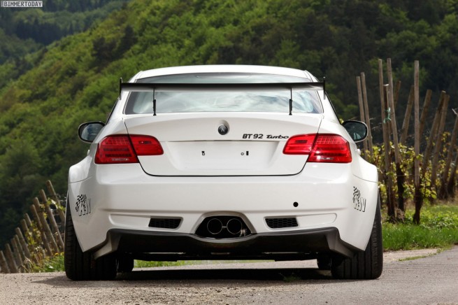Since all new bodywork components are made of carbon, the weight of the BT92 is reduced by a whopping 250 kg under a standard BMW 335i coupe. 1430 kg at 450 bhp.