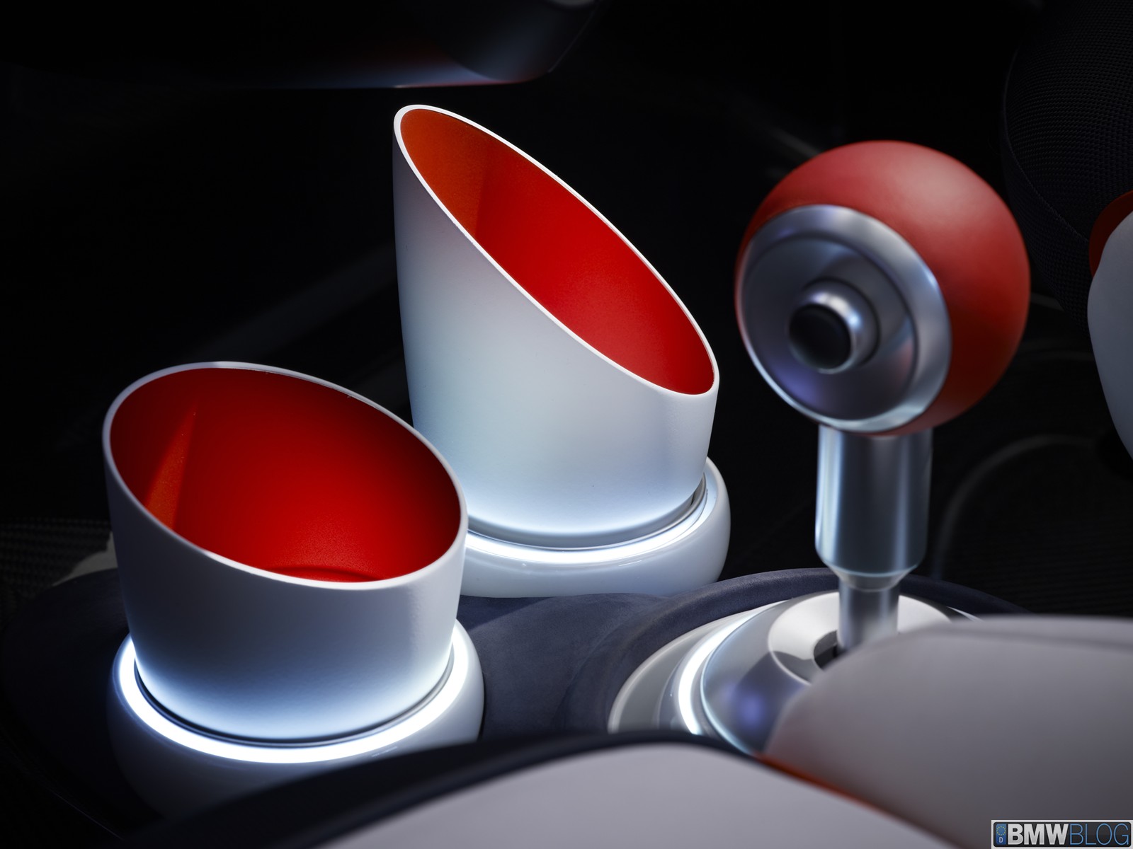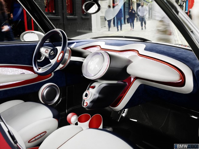 The Union Jack-led colour concept is also employed extensively and to stylish effect inside the new edition of the MINI Rocketman Concept. The interior exudes a sporting ambience, while intricate details emphasise the car’s connection to London. The inner door panels and rear side sections are trimmed in dark blue nubuck leather, while the familiar MINI elliptical door rings provide an effective contrast with their white leather. The circular surrounds for features such as the air vents, door pulls and stereo speakers, are split into two sections and consist of a red inner ring and white outer ring.