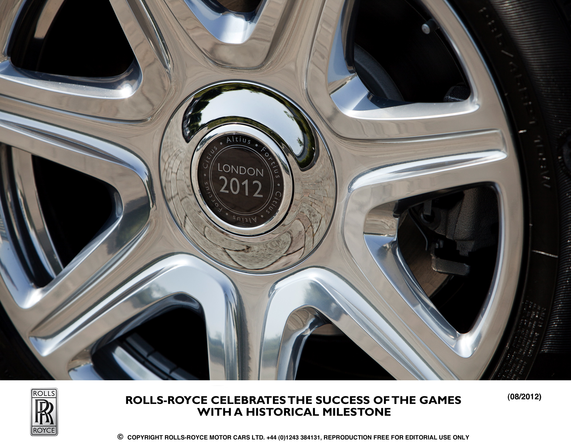 The new grille badge features the iconic Spirit of Ecstasy with patriotic Union Flag replacing the traditional flowing gown of the Graceful Little Goddess. The steering wheel centre includes a traditional laurel wreath and torch, and the self-righting wheel centres feature the words ‘London 2012’ surrounded by the Olympic motto, ‘Citius, Altius, Fortius’ (‘Faster, Higher, Stronger’). The badges are complemented by unique tread plates identifying each car as ‘One of Three’, creating perhaps the most collectable (and unobtainable) Rolls-Royce Bespoke items ever produced.