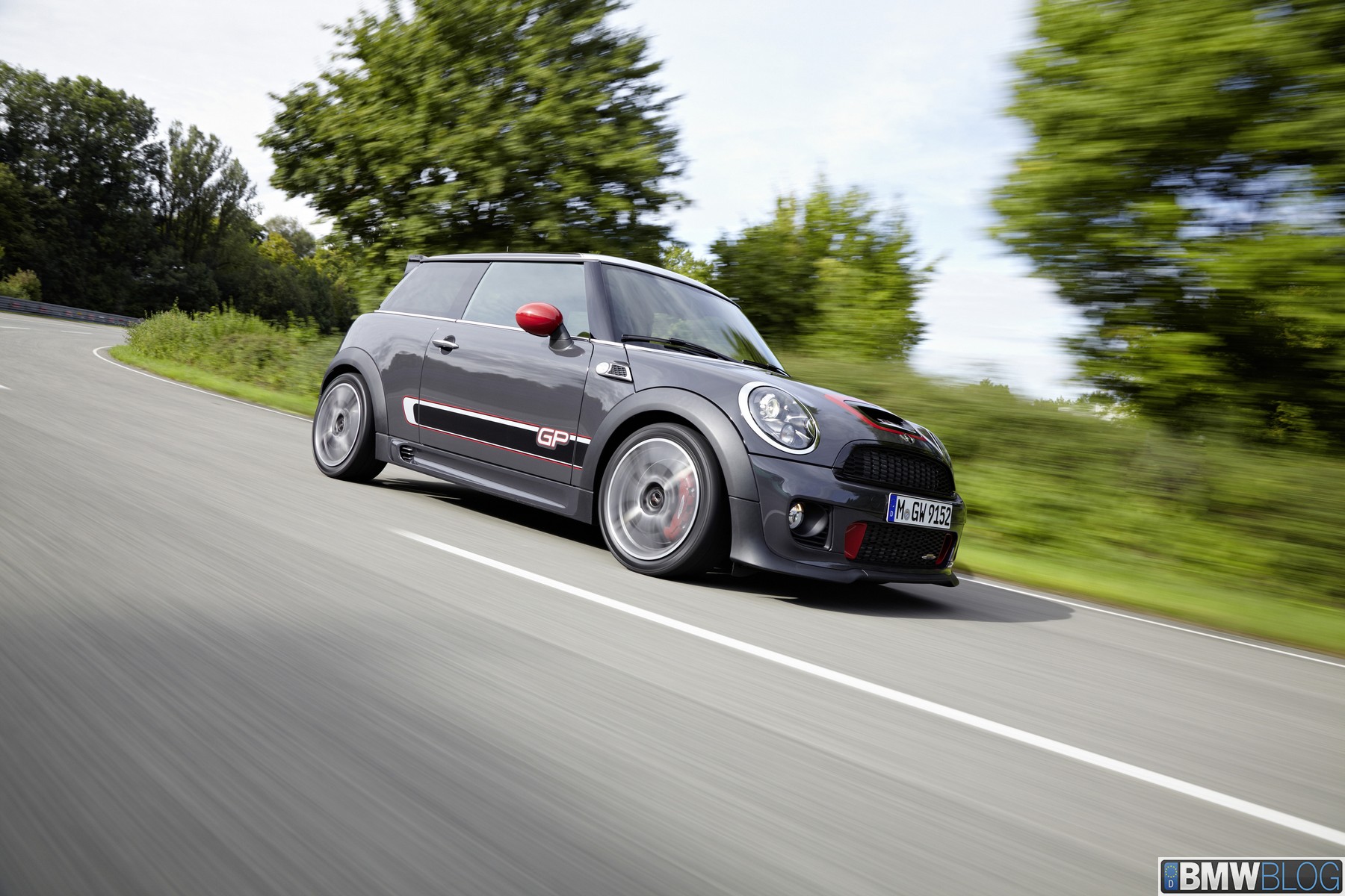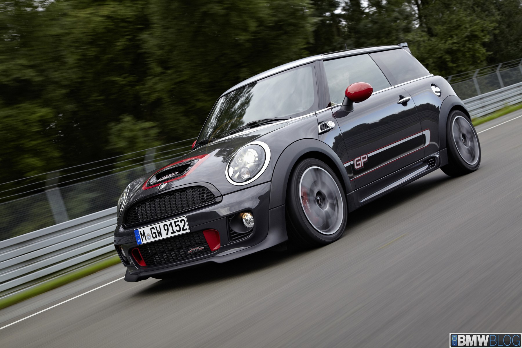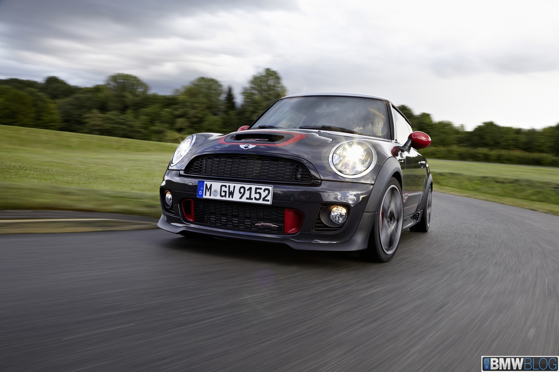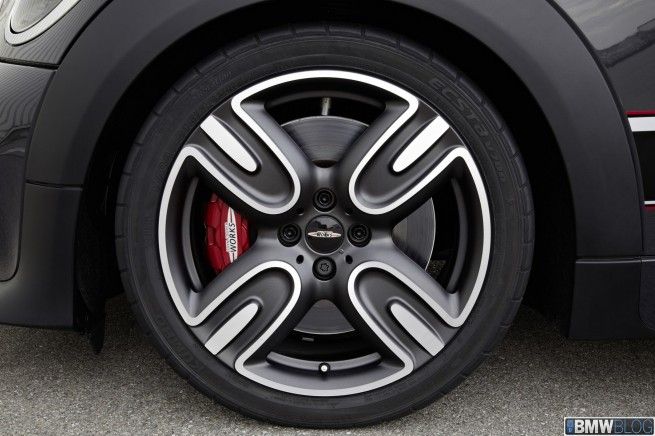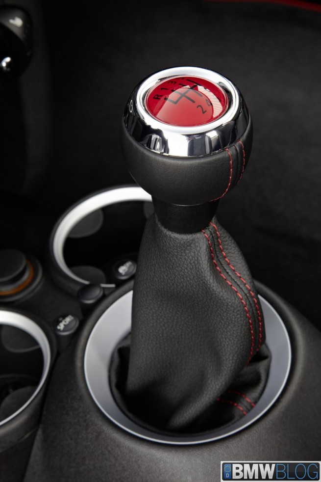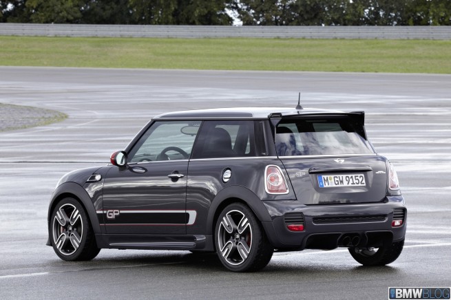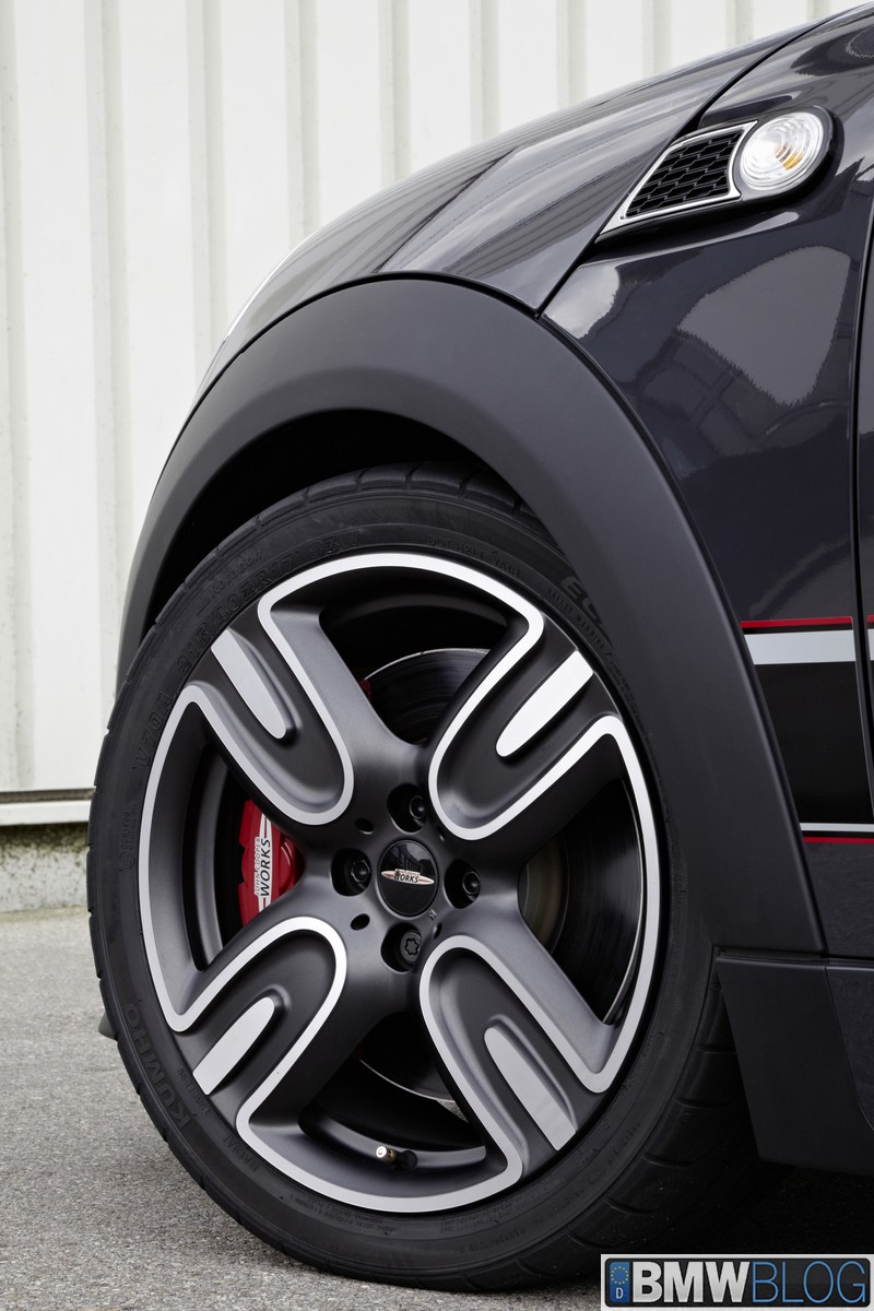 Two seats, 160 kW/218 hp, coilover suspension, sports brakes, model-specific 17-inch alloy wheels and aerodynamic body parts – 0 to 100 km/h (62 mph) sprint time 6.3 seconds, top speed 242 km/h (150 mph), best lap time on the Nürburgring North Loop: 8:23 minutes – the fastest MINI ever built, extensively equipped with John Cooper Works motor sport technology – official debut at the 2012 Paris Motor Show – will be built as a limited edition of 2,000 units maximum starting 2012.
