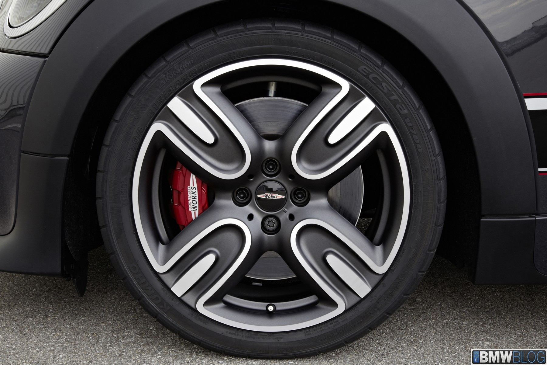 Outstanding braking performance is provided by the MINI John Cooper Works GP’s racing-derived sports brake system, featuring six-piston fixed-calliper disc brakes, vented at the front. The front discs are 330 millimetres in diameter and 25 millimetres thick, with 280 x 10 mm discs at the rear. The low-weight 17-inch alloy wheels, again exclusive to the MINI John Cooper Works GP, run on high-traction 215/40 R17 sports tyres. Optionally, standard-size 205/45 R17 tyres are available on the same wheels, offering a good sporty balance between performance and good handling in wet or low-temperature conditions. The 7.5 x 17 H2 ET45 wheels, which were specially developed for the MINI John Cooper Works GP, are derived from the MINI Challenge race car, and feature lightweight contours on flow-formed rims.