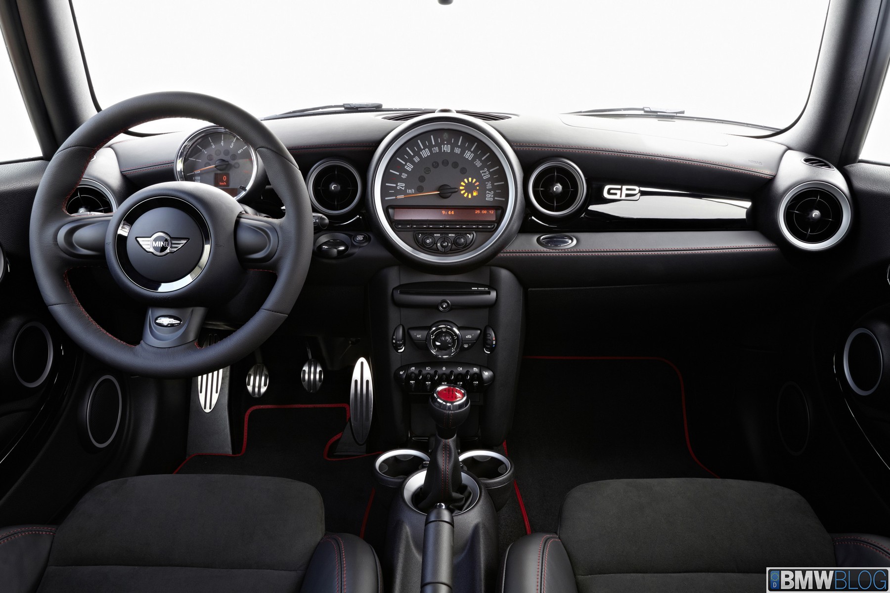 The exciting race car feel is raised a further notch by an interior ambience which, partly due to the absence of a rear seat bench, is focused entirely on the needs of the driver and “co-driver”, both of whom can savour the performance of the MINI John Cooper Works GP to the full thanks to Recaro sports seats with special GP stitching. A cargo guard prevents items from sliding forward out of the luggage compartment in sporty driving situations. The John Cooper Works thick-rimmed leather steering wheel and the gearshift knob with chrome ring and red shift diagram help give the driver a more direct feel for the car. Finally, with features like the anthracite roof liner, the piano black interior surfaces and door grips, and the anthracite rev counter and speedometer dials, this interior also helps to improve the driver’s concentration and focus on the road.