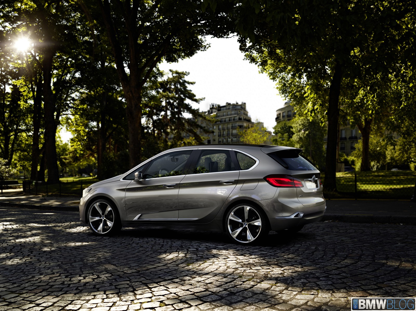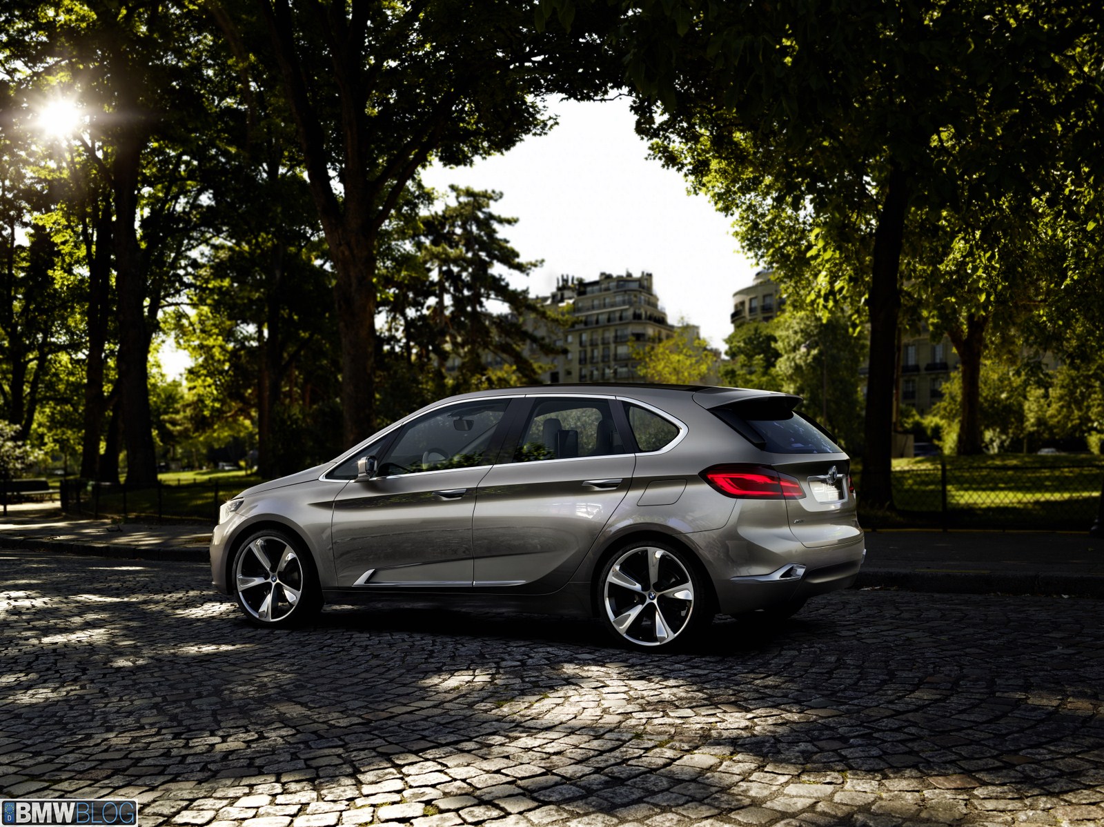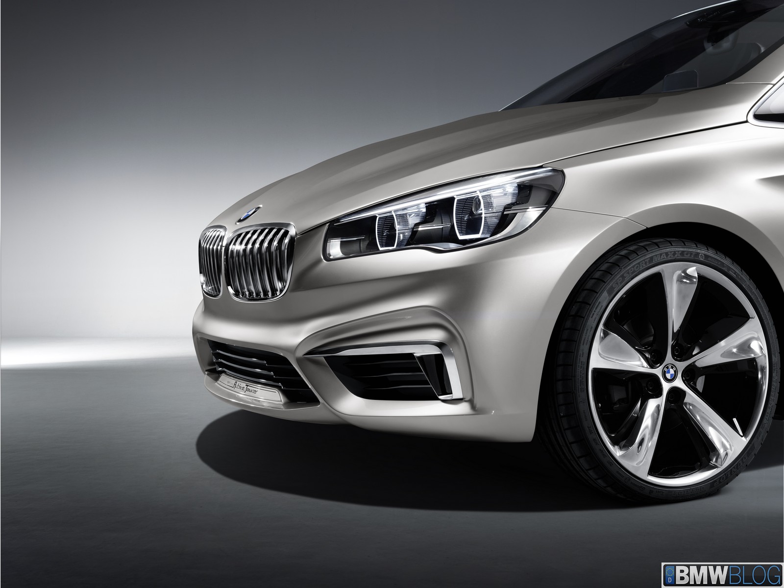 The BMW Concept Active Tourer unmistakably retains the characteristically expressive BMW front view. The dominating element here is the distinctive, slightly front-tilted BMW radiator grille. The striking twin headlines with LED positioning lights (eyebrows) stretching far back into the side panels and the multi-faceted front apron combine to reinforce the sporty presence of the BMW Concept Active Tourer. Furthermore, the two large outer air inlets below the headlights emphasise the impression of width created by the front view. Seen from the side, the elongated silhouette with its suggested wedge shape gives the BMW Concept Active Tourer a dynamic feel even when stationary – something which is unique in the class. Integrated door openers and the strikingly contrasted side sills with their rising shadow line combine with the large 20-inch wheels to give the BMW Concept Active Tourer its sporty, elegant appearance. Short body overhangs at the front and rear and the long wheelbase make for an unusually generously sized interior considering the vehicle’s compact exterior dimensions. The raised roof line and large doors at front and rear promise convenient access to all seats.