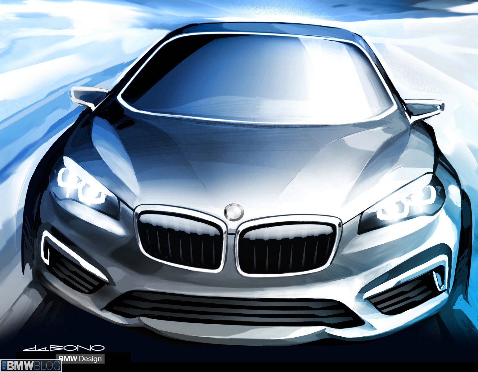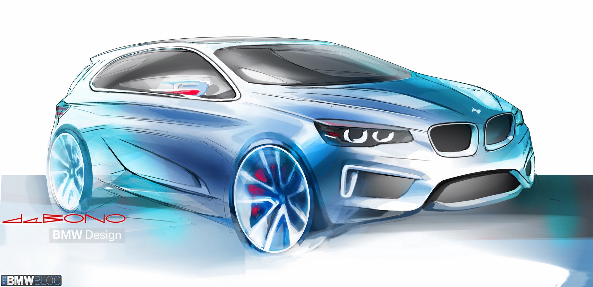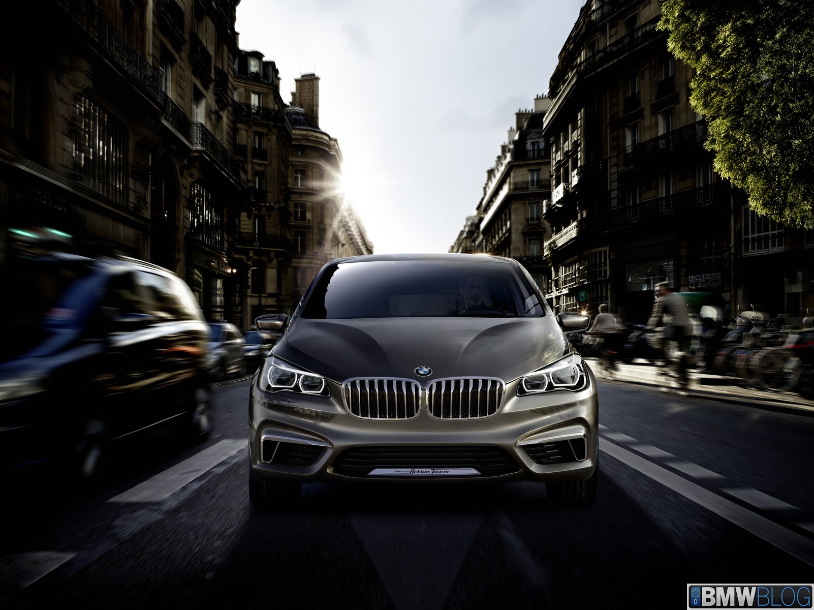 The BMW Concept Active Tourer unmistakably retains the characteristically expressive BMW front view. The dominating element here is the distinctive, slightly front-tilted BMW radiator grille. The striking twin headlines with LED positioning lights (eyebrows) stretching far back into the side panels and the multi-faceted front apron combine to reinforce the sporty presence of the BMW Concept Active Tourer. Furthermore, the two large outer air inlets below the headlights emphasise the impression of width created by the front view. Seen from the side, the elongated silhouette with its suggested wedge shape gives the BMW Concept Active Tourer a dynamic feel even when stationary – something which is unique in the class. Integrated door openers and the strikingly contrasted side sills with their rising shadow line combine with the large 20-inch wheels to give the BMW Concept Active Tourer its sporty, elegant appearance. Short body overhangs at the front and rear and the long wheelbase make for an unusually generously sized interior considering the vehicle’s compact exterior dimensions. The raised roof line and large doors at front and rear promise convenient access to all seats.