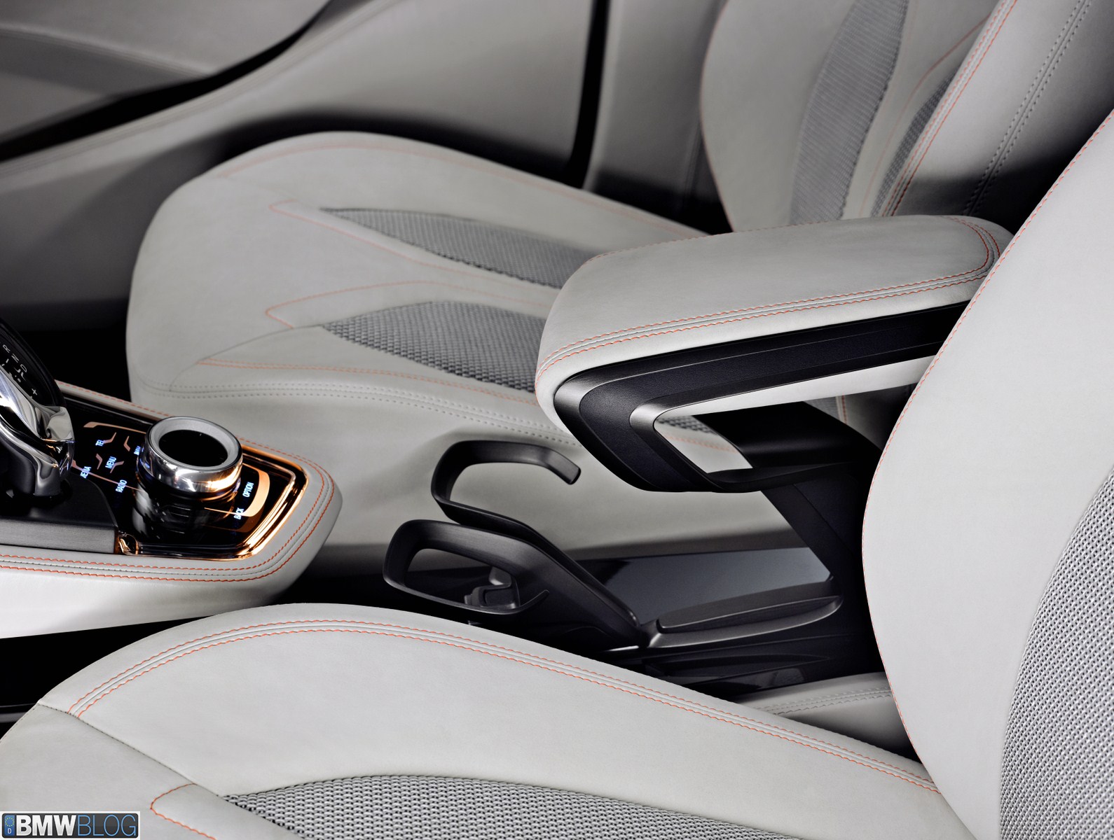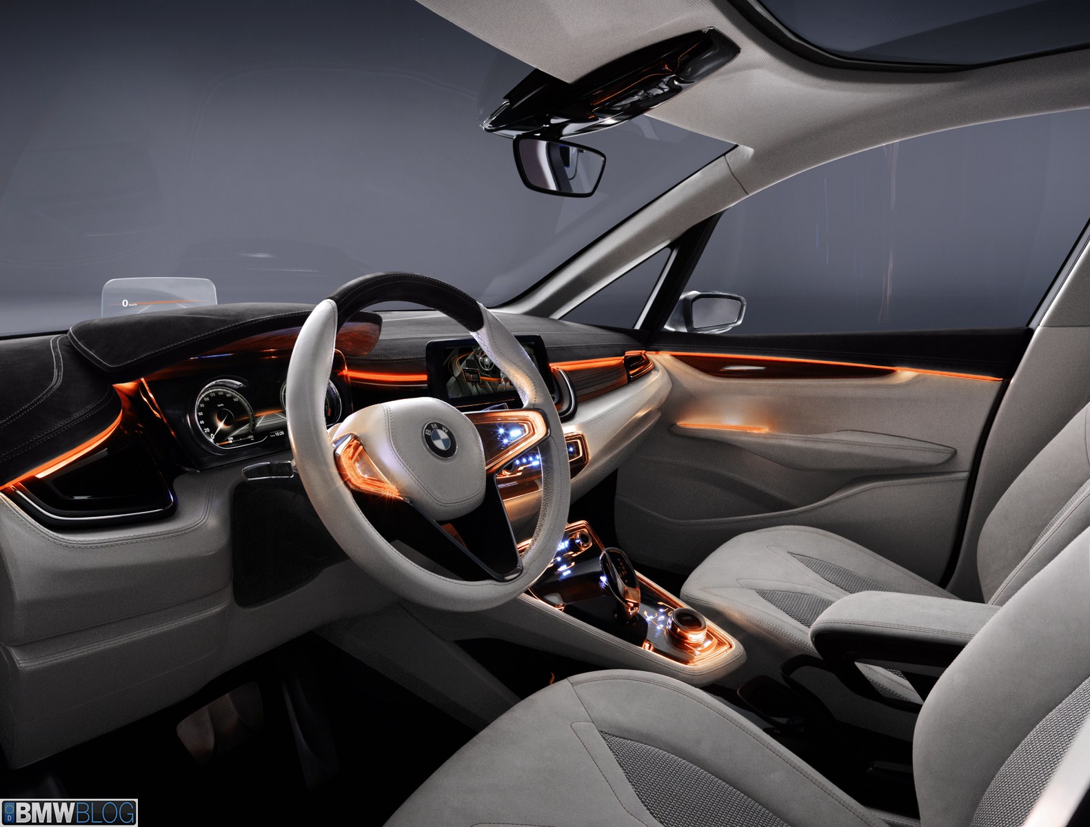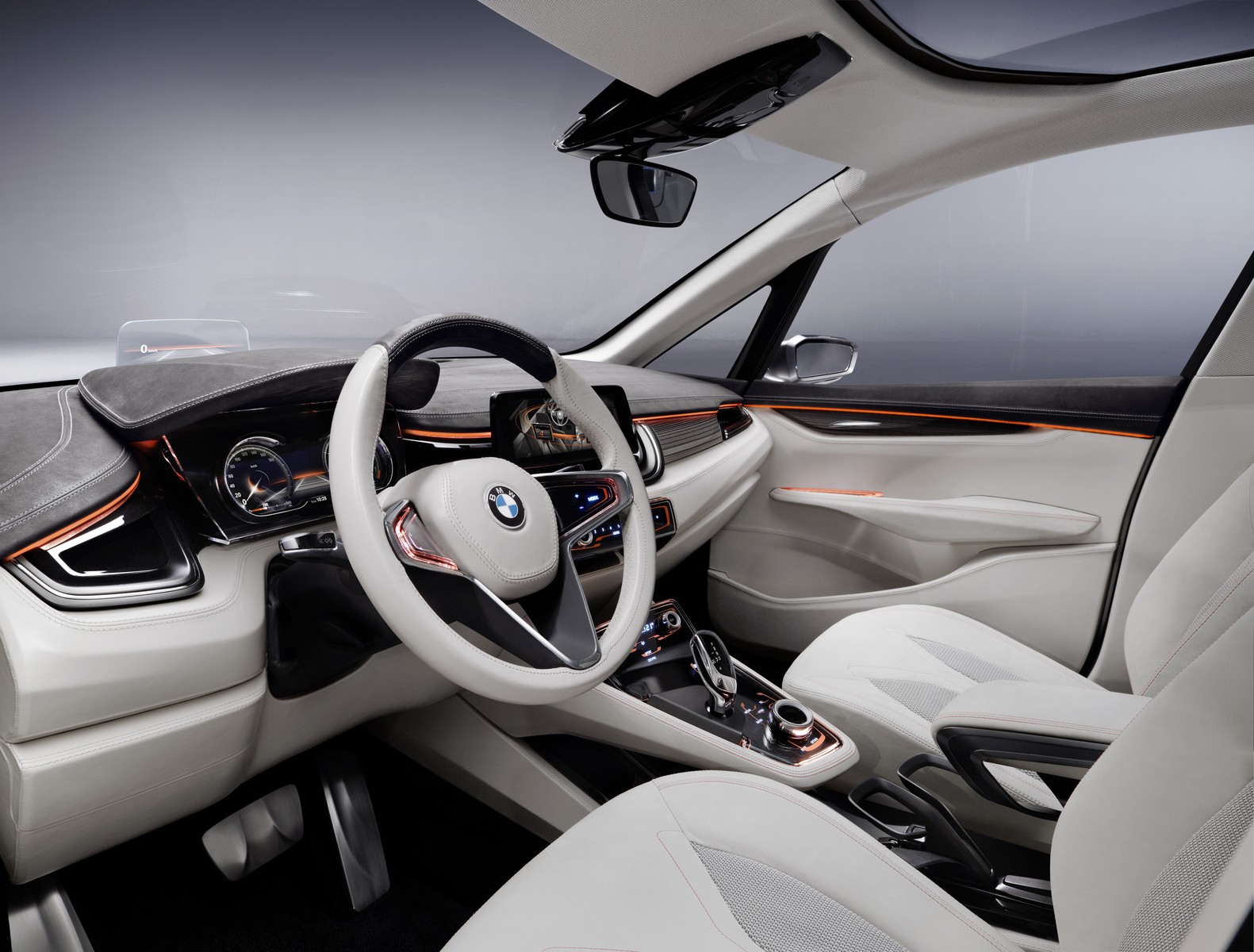 The generously designed interior of the BMW Concept Active Tourer is both transparent and refreshingly new. The open-pore laminated wood milled from a single block provides the visual link between the upper and low decor surfaces of the instrument panel. This creates a very elegant and light overall impression in the front section of the interior. The door trim panels and seats are covered in light, velvety soft full-grain leather and smooth leather, providing a silky, shimmering gloss which emphasises the luxurious, elegant ambience of the interior. There are also orange contrasting seams which underscore the vehicle’s sporty character. The BMW Concept Active Tourer offers an entirely new sense of space. The centre console appears to hover between the two front seats with a smooth transition to the dashboard. This arrangement guarantees maximum legroom for both driver and front passenger.