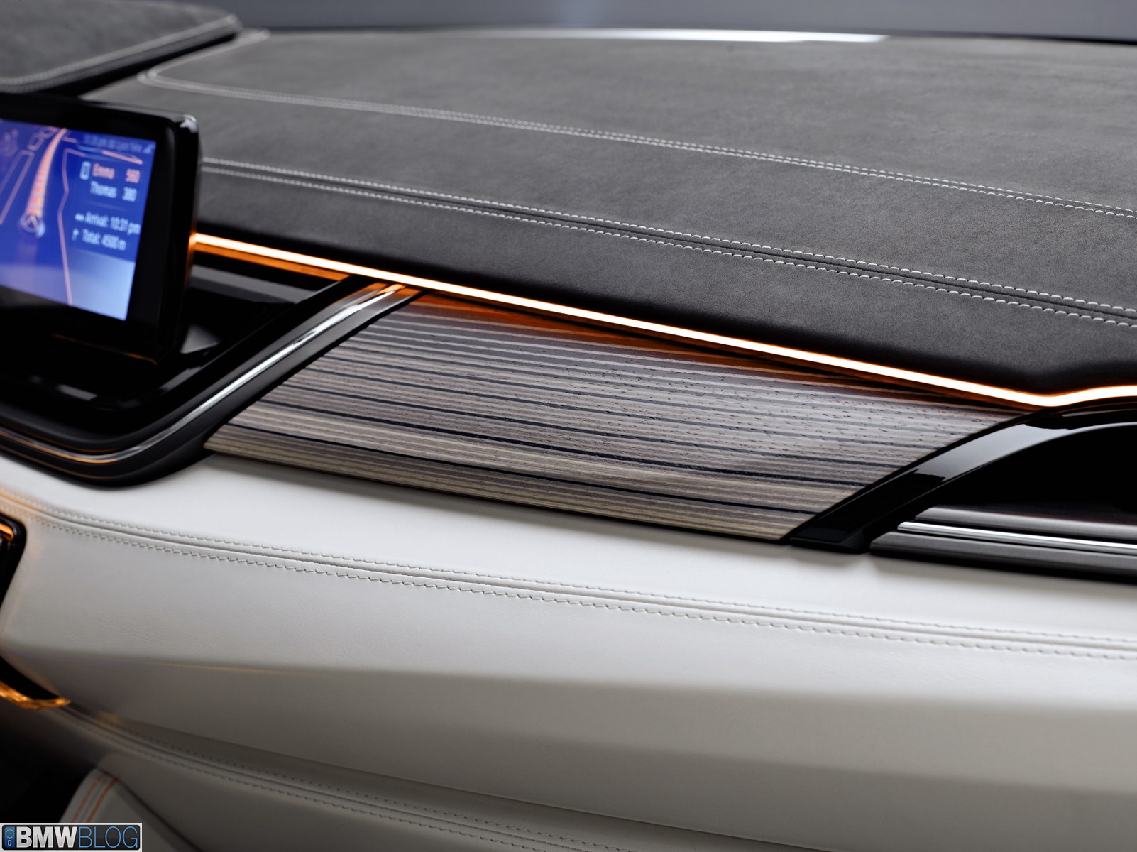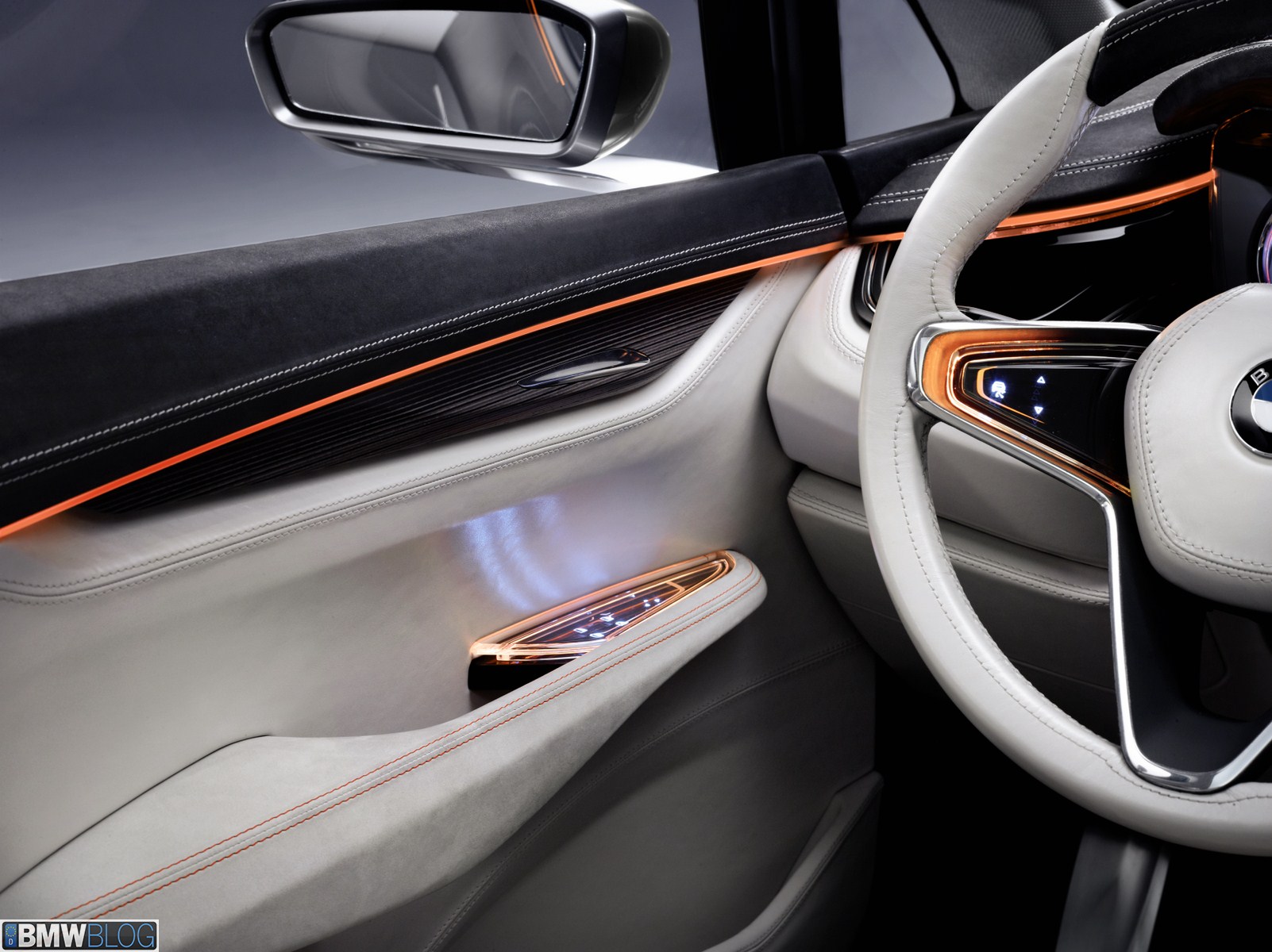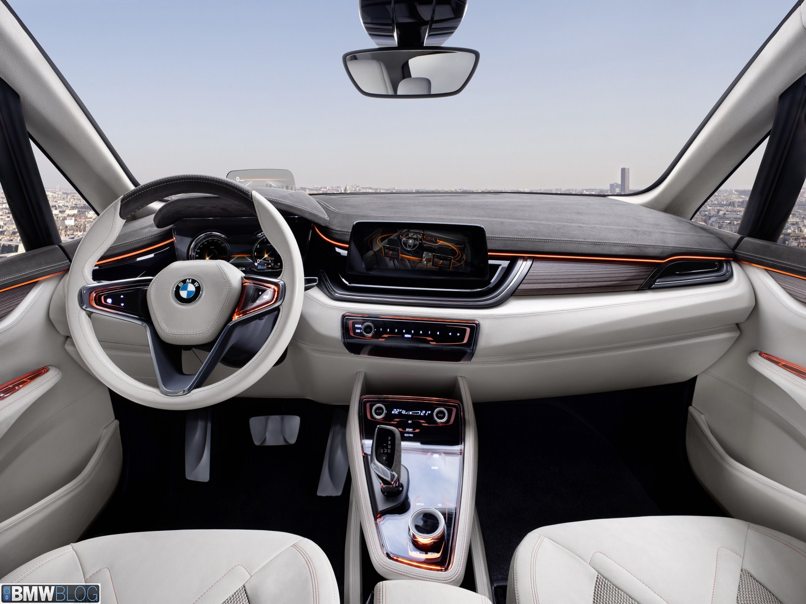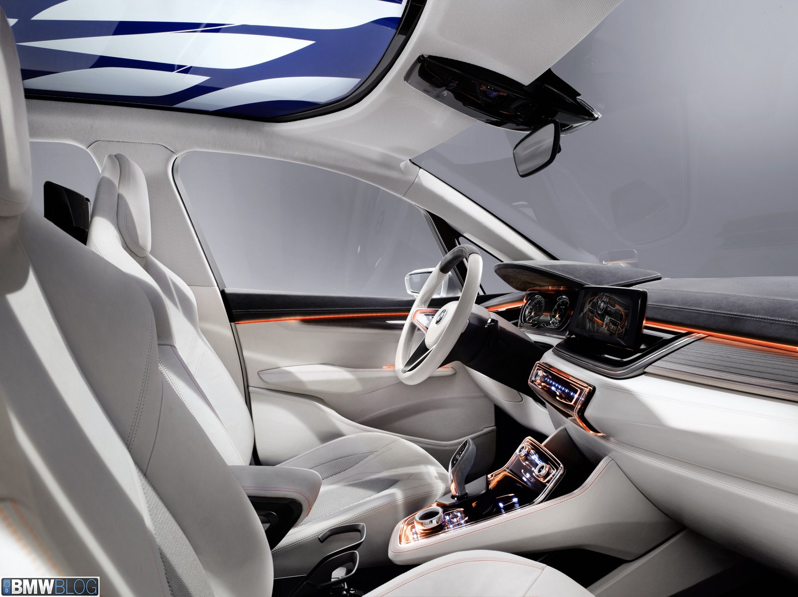 The generously designed interior of the BMW Concept Active Tourer is both transparent and refreshingly new. The open-pore laminated wood milled from a single block provides the visual link between the upper and low decor surfaces of the instrument panel. This creates a very elegant and light overall impression in the front section of the interior. The door trim panels and seats are covered in light, velvety soft full-grain leather and smooth leather, providing a silky, shimmering gloss which emphasises the luxurious, elegant ambience of the interior. There are also orange contrasting seams which underscore the vehicle’s sporty character. The BMW Concept Active Tourer offers an entirely new sense of space. The centre console appears to hover between the two front seats with a smooth transition to the dashboard. This arrangement guarantees maximum legroom for both driver and front passenger.