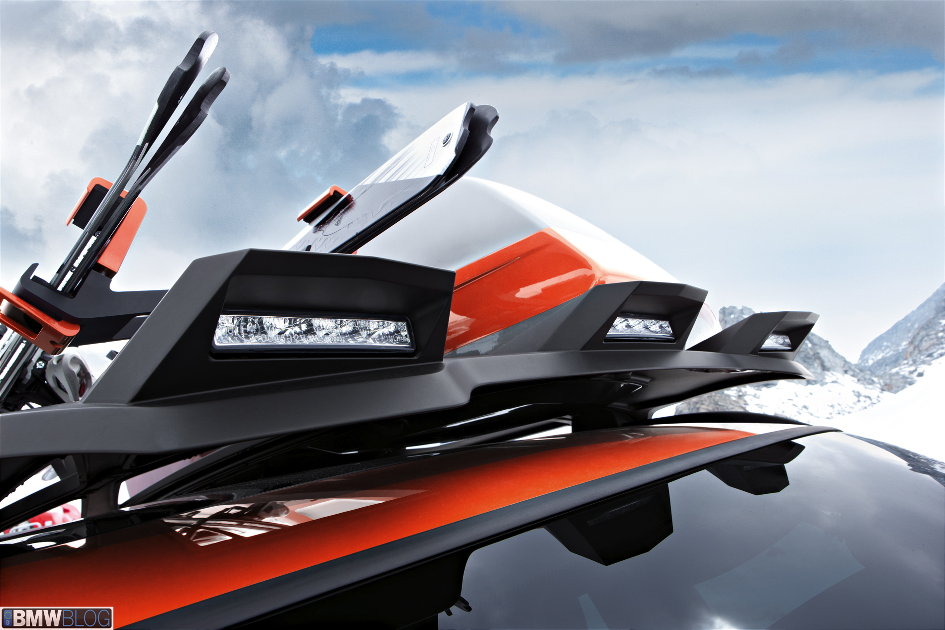 A sound system from Harman Kardon is installed in the two luggage boxes on the driver’s side. High-end hi-fi systems from the specialist brand also provide an extremely dynamic audio experience in standard series-produced BMW models. The two-way loudspeakers installed in the BMW Concept K2 Powder Ride generate output of 320 watts and turn the cars into a powerful sound stage for après ski fun with a difference at the end of the valley run. A Class D amplifier with 2 x 550-watt output, a 500-watt subwoofer and a high-quality microphone from AKG are also on hand for those spontaneous parties in the snow. And the transparent sounds can be complemented by visual effects, for good measure. The luggage boxes can be illuminated in Blue and Orange, as desired, and three LED spotlights are integrated into the front edge of the roof structure.