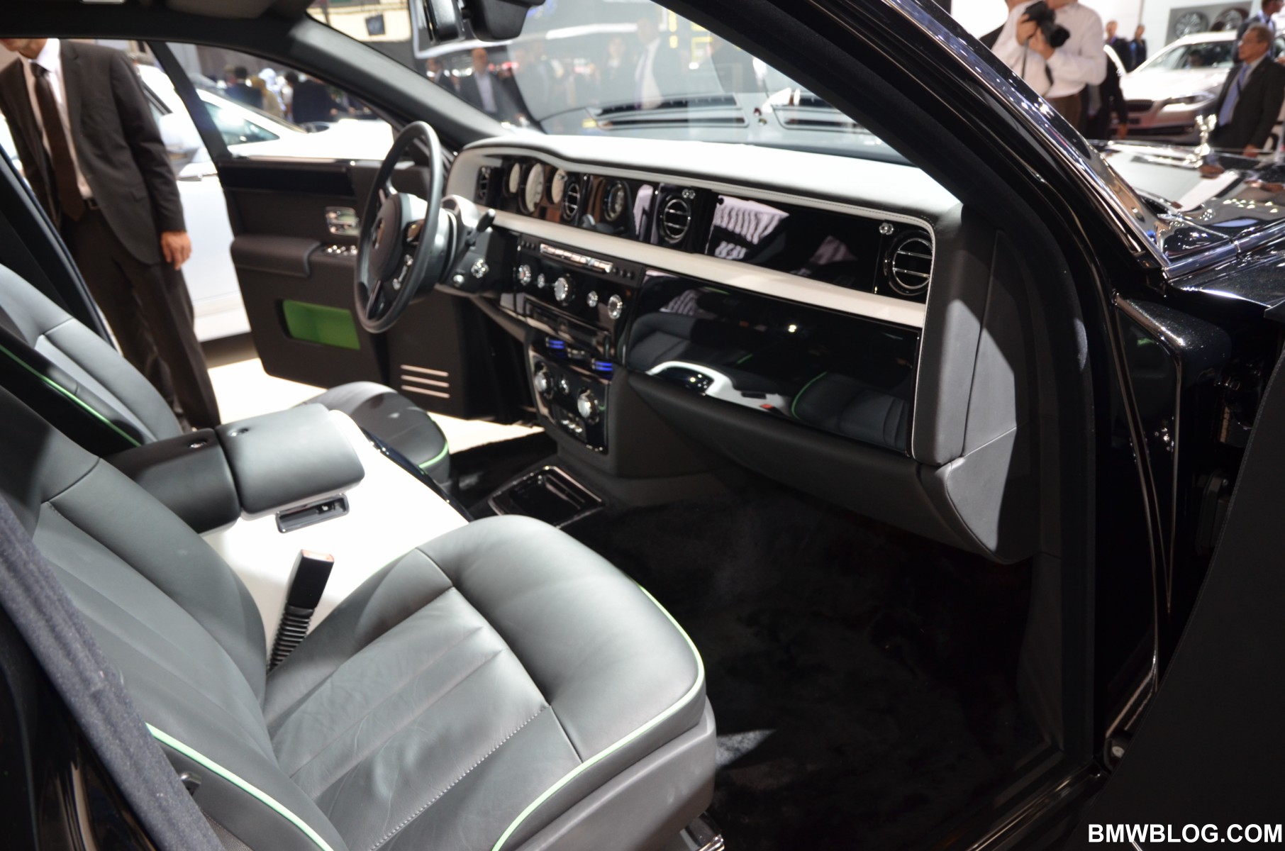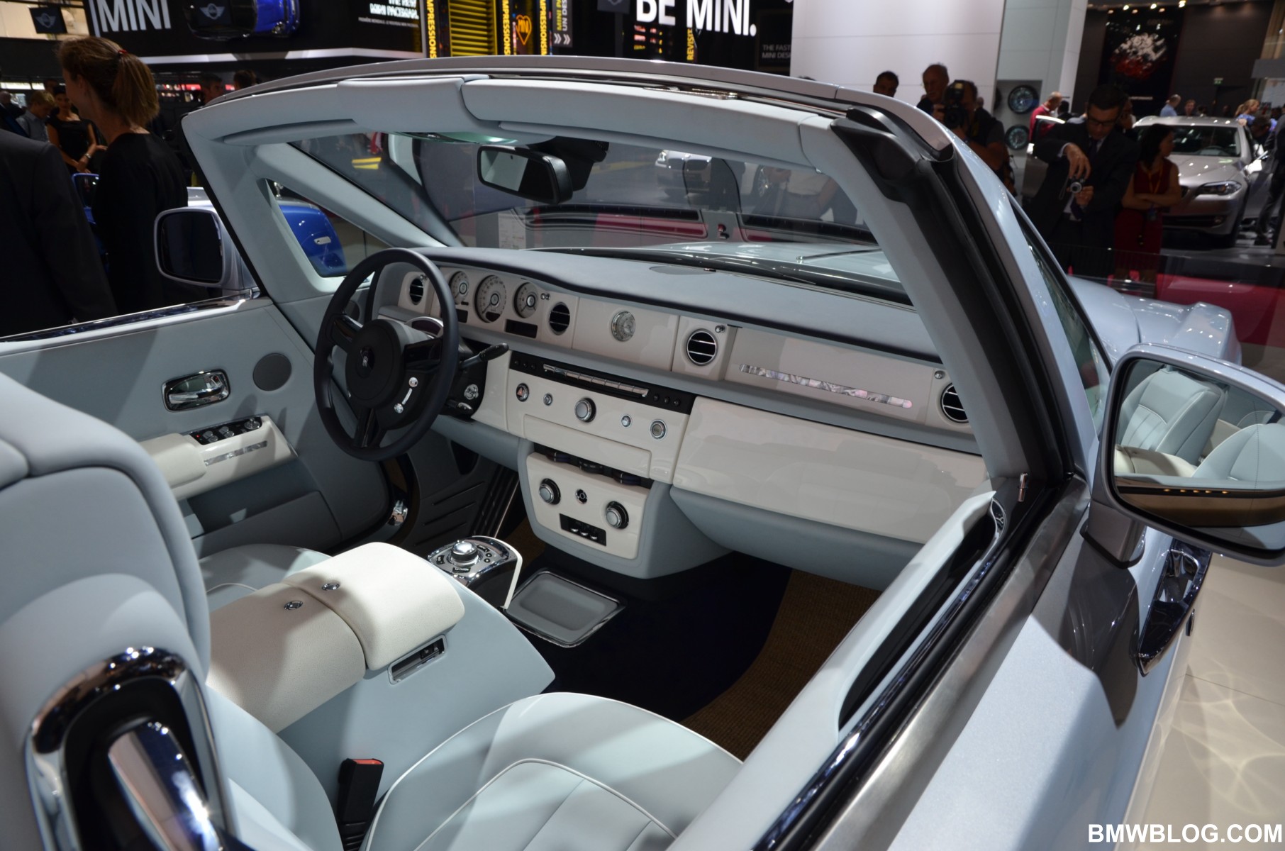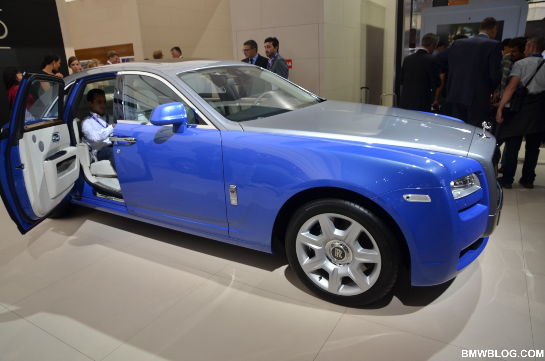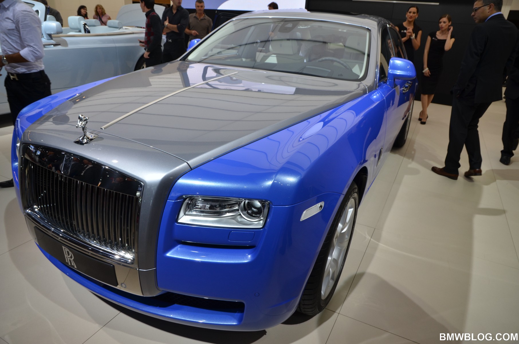 For the Phantom Saloon, Rolls-Royce designers went with a crisp, white interior with contrasting black accents. The Ghost showcases an elegant two-tone paint job: a sleek silver and cobalt blue. The Phantom Drophead Coupé with its mother of pearl onlays completes the line-up.