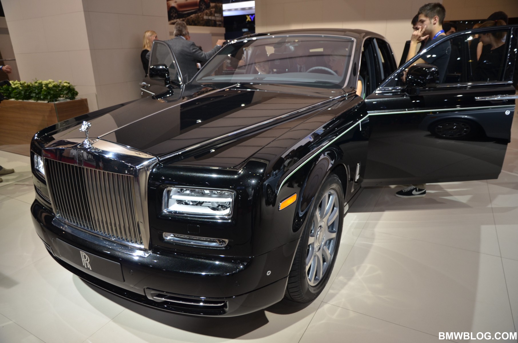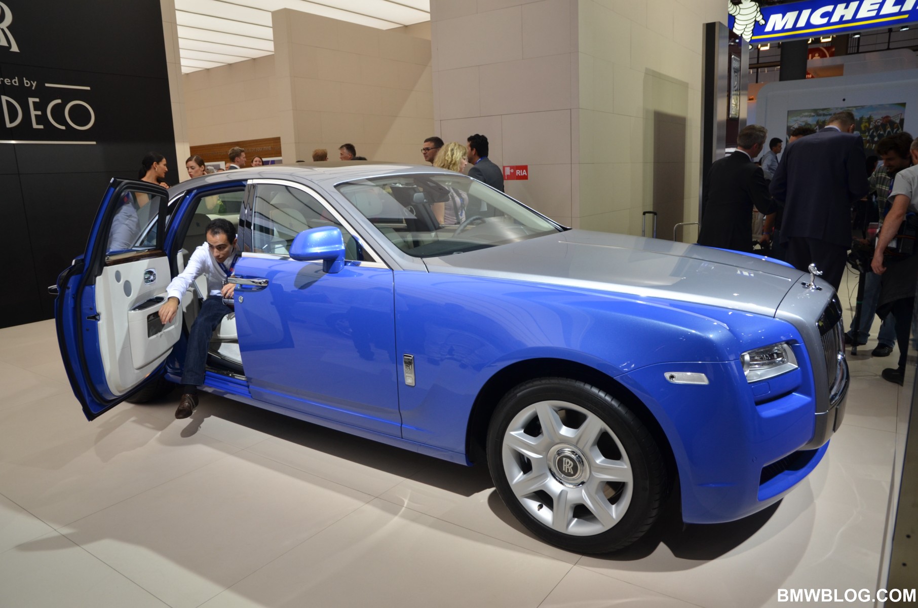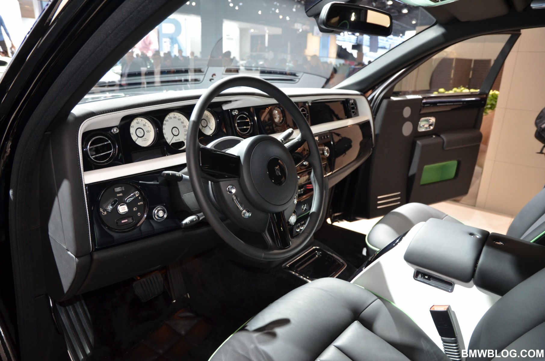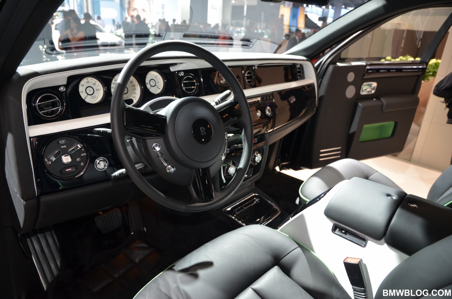 For the Phantom Saloon, Rolls-Royce designers went with a crisp, white interior with contrasting black accents. The Ghost showcases an elegant two-tone paint job: a sleek silver and cobalt blue. The Phantom Drophead Coupé with its mother of pearl onlays completes the line-up.