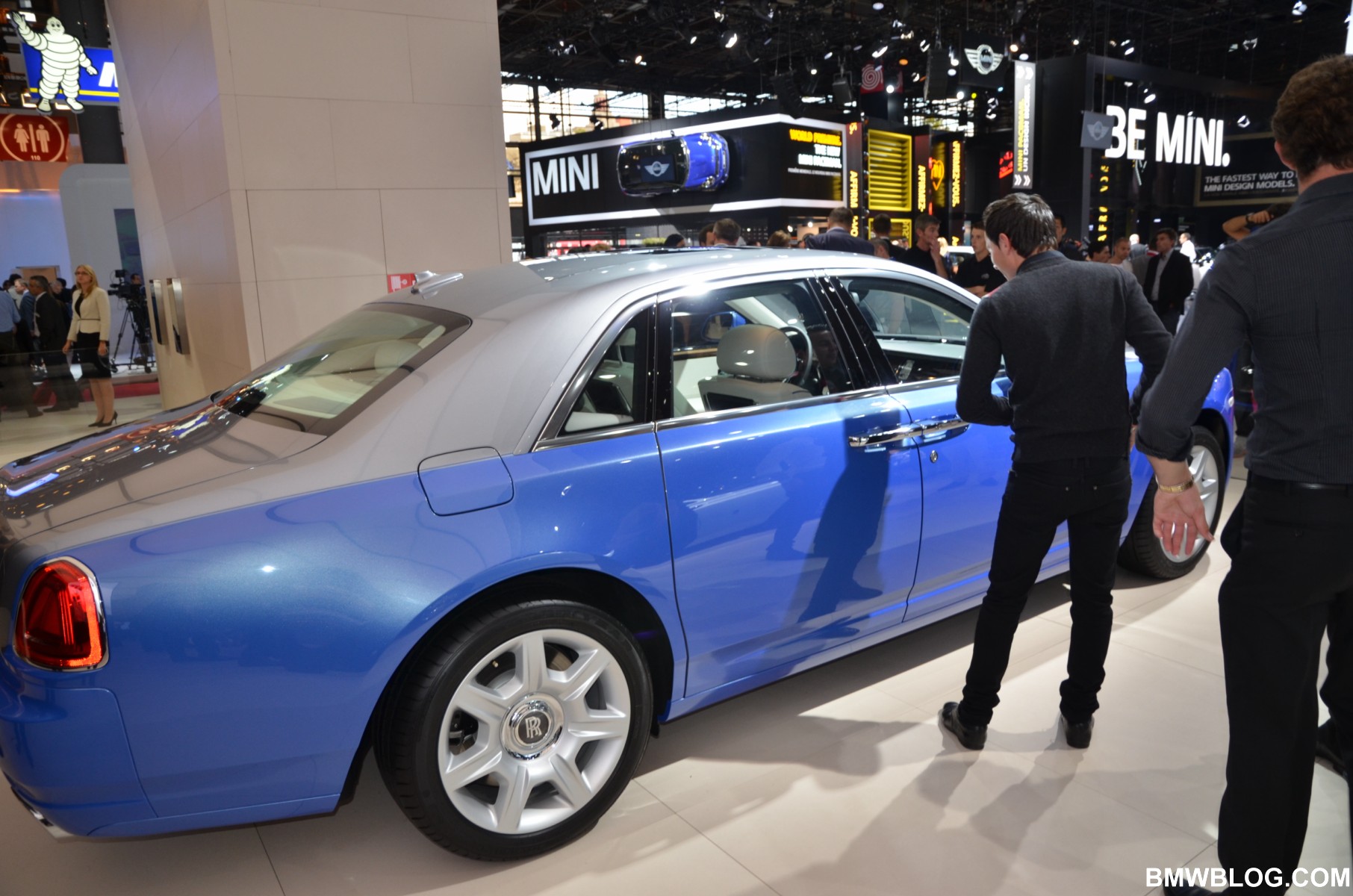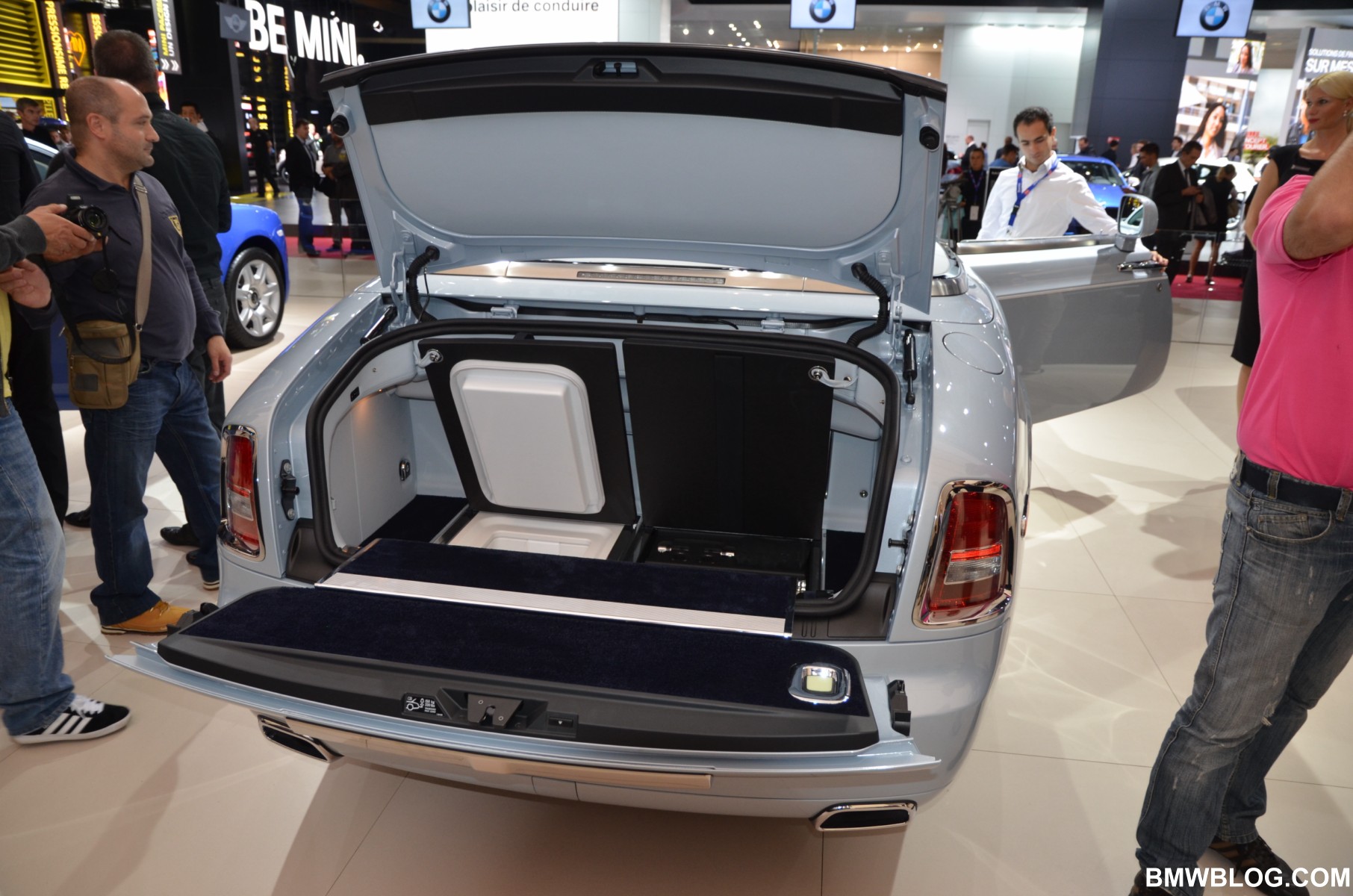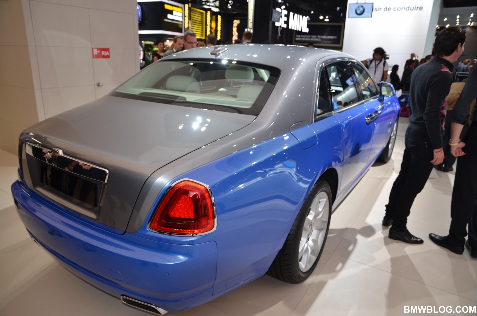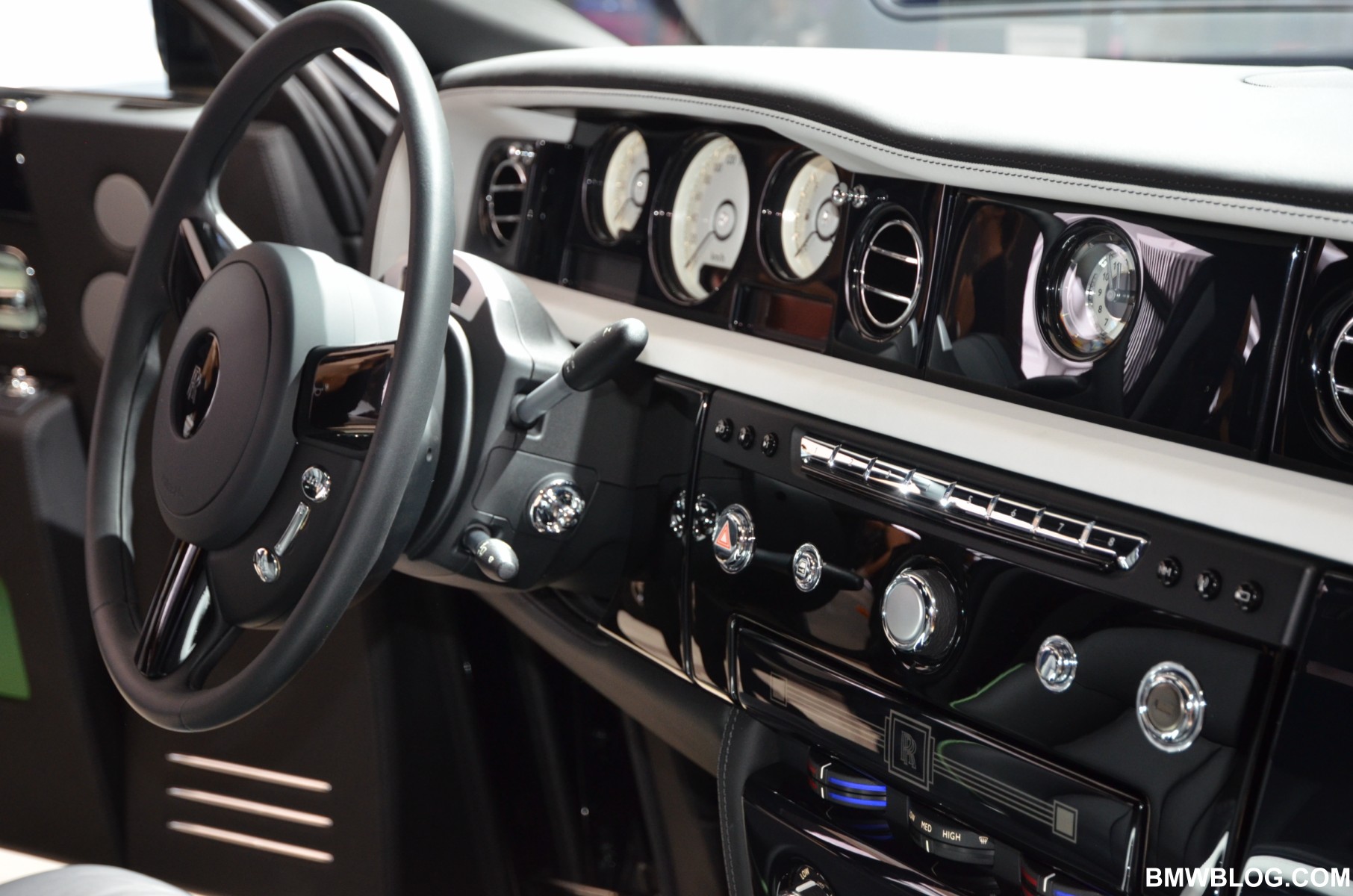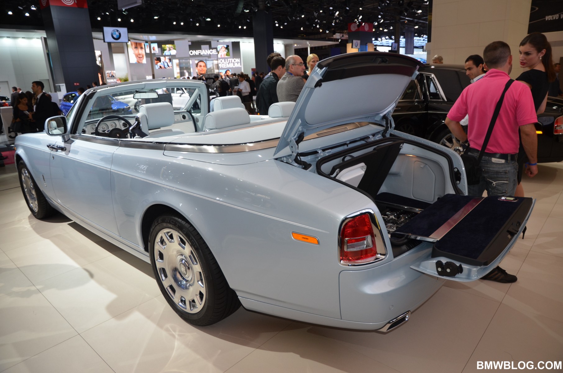 For the Phantom Saloon, Rolls-Royce designers went with a crisp, white interior with contrasting black accents. The Ghost showcases an elegant two-tone paint job: a sleek silver and cobalt blue. The Phantom Drophead Coupé with its mother of pearl onlays completes the line-up.