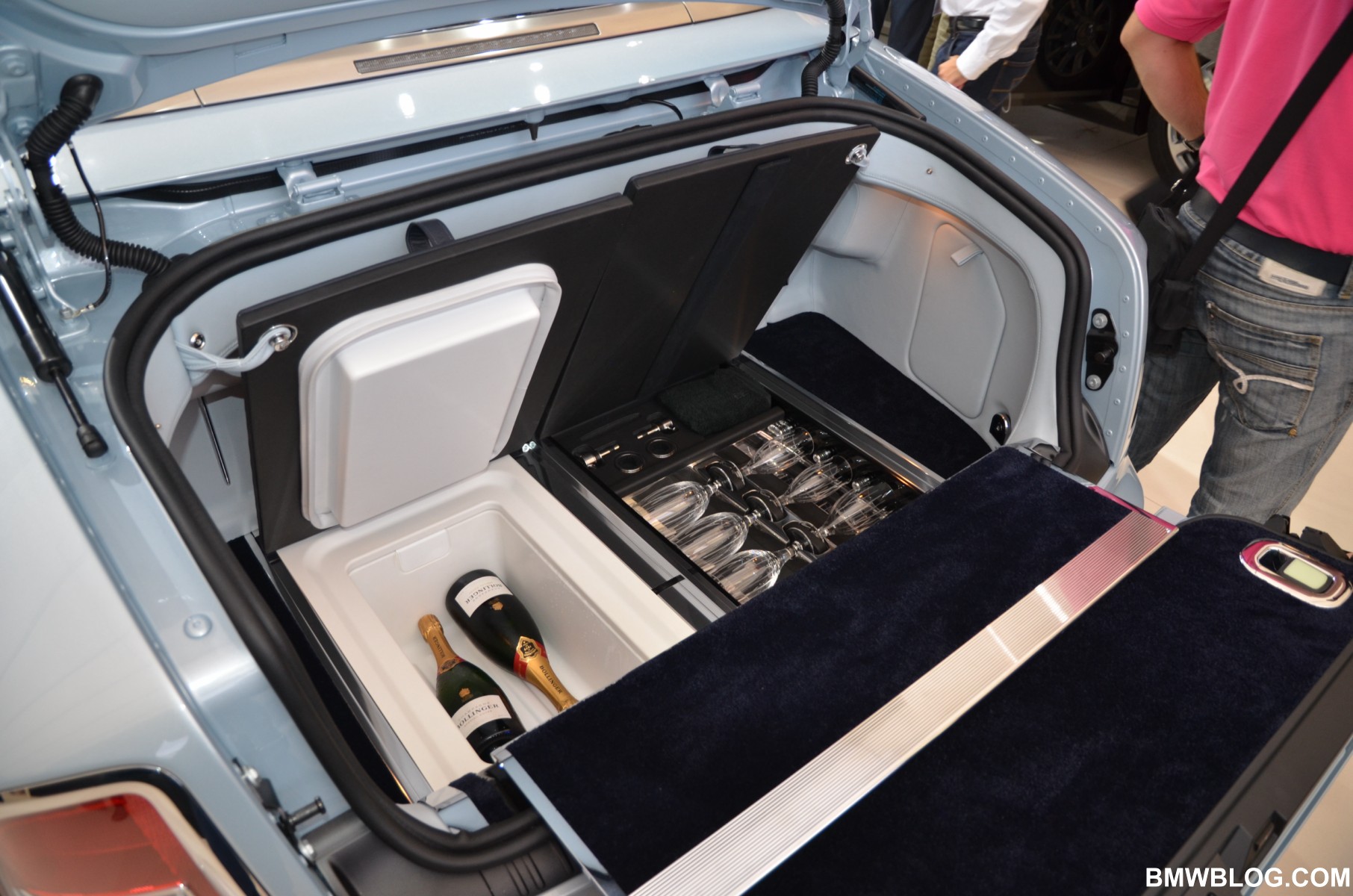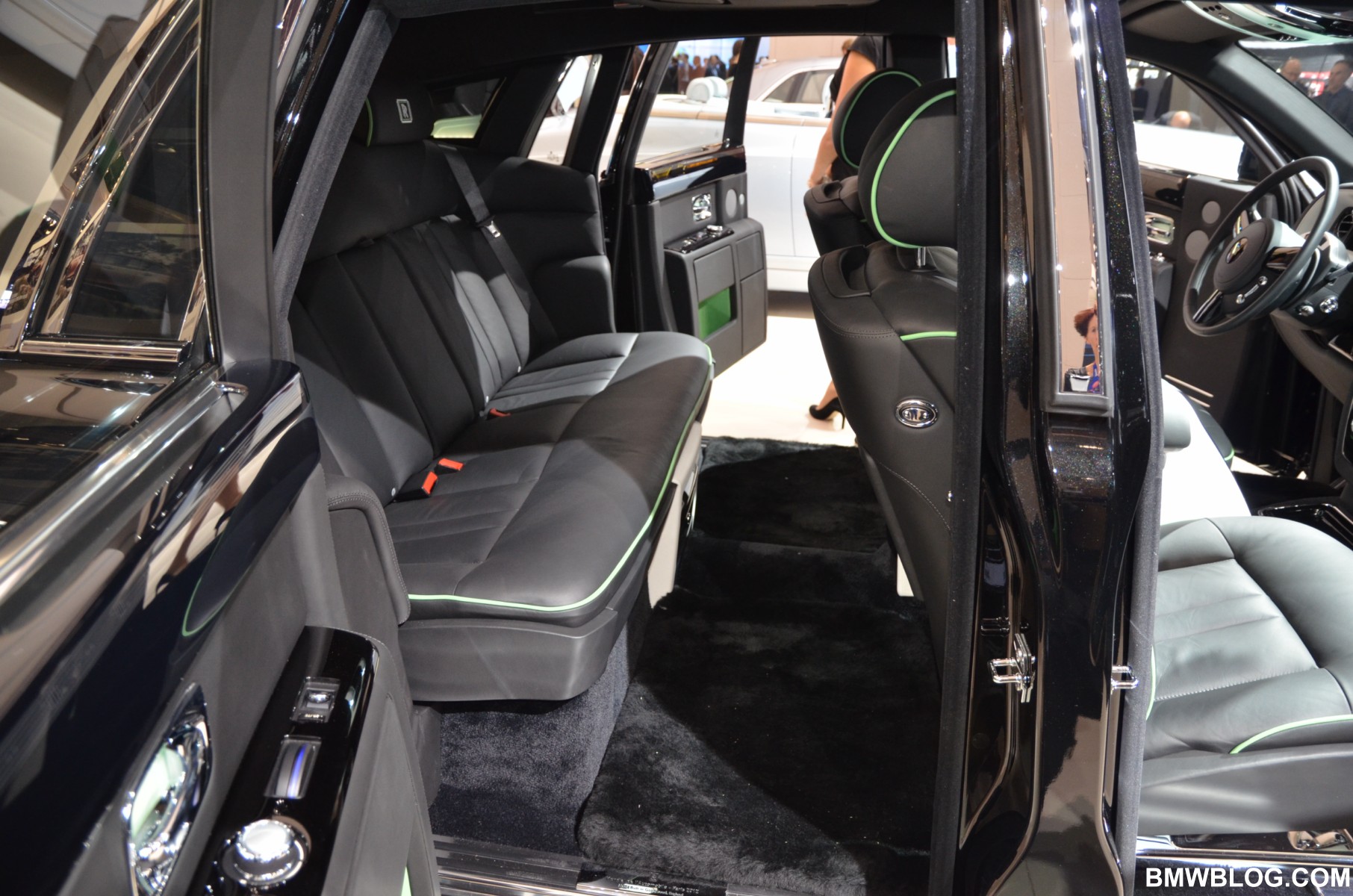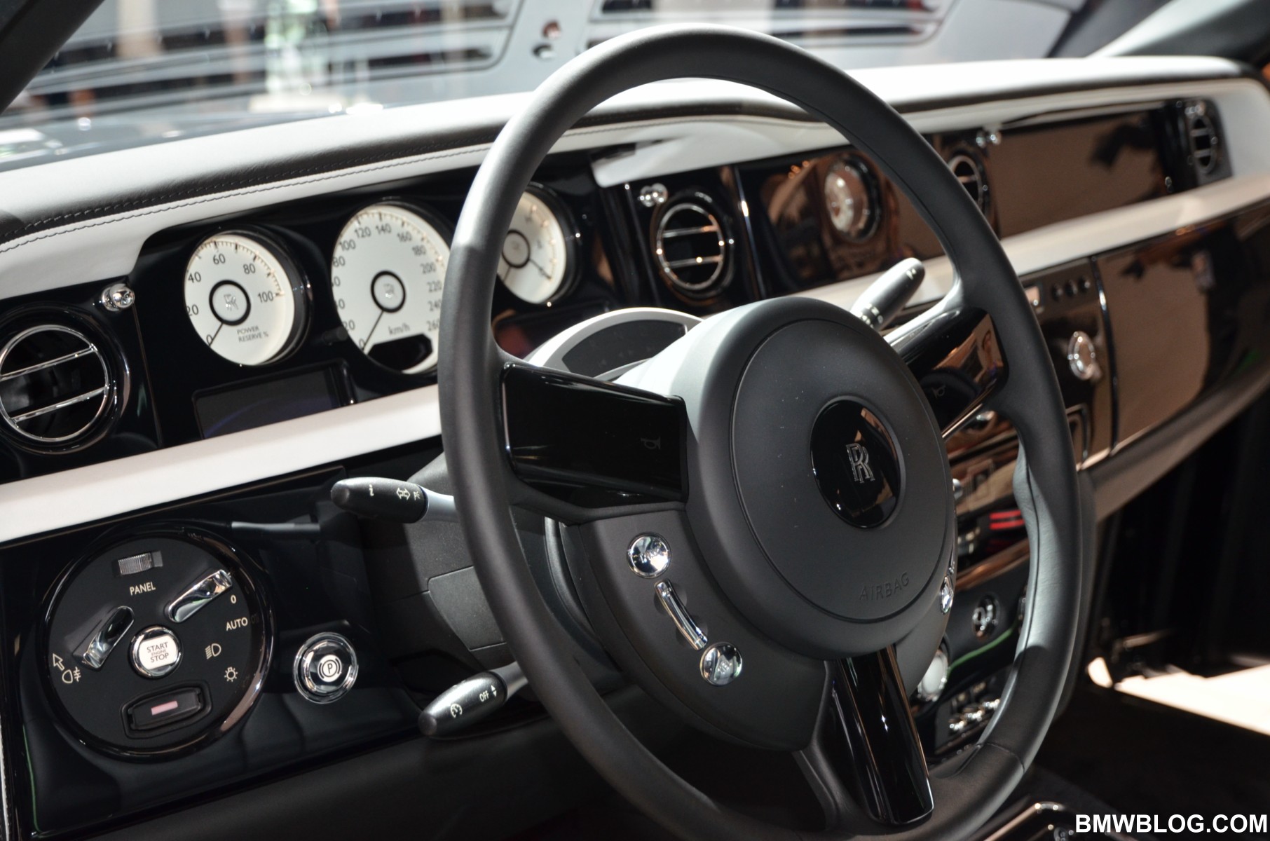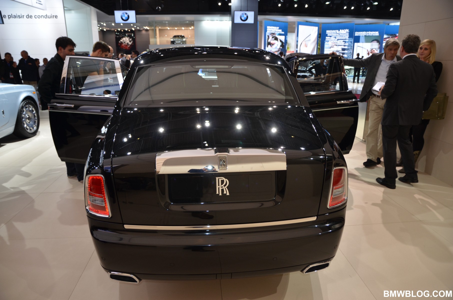 For the Phantom Saloon, Rolls-Royce designers went with a crisp, white interior with contrasting black accents. The Ghost showcases an elegant two-tone paint job: a sleek silver and cobalt blue. The Phantom Drophead Coupé with its mother of pearl onlays completes the line-up.